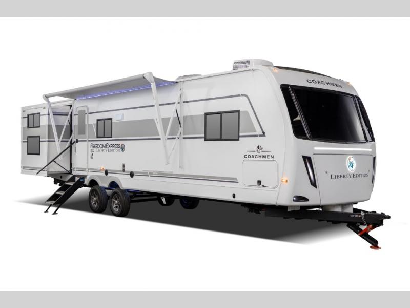 This stunning new Coachmen RV Freedom Express Liberty Edition travel trailers are built on the trusted Freedom Express platform designed with premium features and innovative design elements that will make your journeys unforgettable. Each unit boasts impressive interior space, with a cleverly designed layout and thoughtful touches that make it feel like a home away from home. Flip-up countertop extensions provide extra space for meal prep or work, showing that every detail has been carefully considered to ensure your comfort and convenience. With its perfect blend of style, comfort, and functionality, the Freedom Express Liberty Edition is the ultimate travel trailer for those who crave the freedom to explore and the luxury to savor every moment.