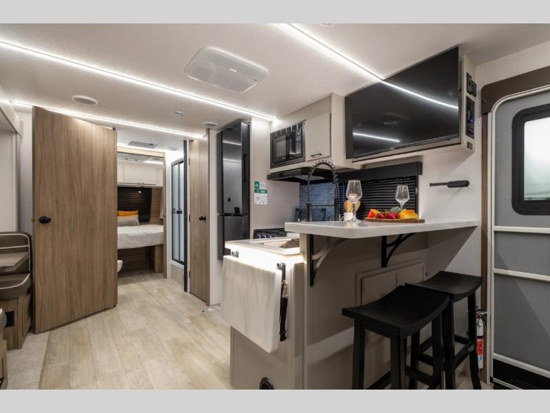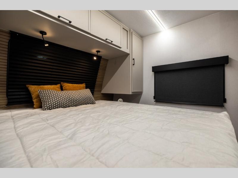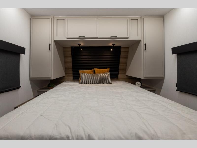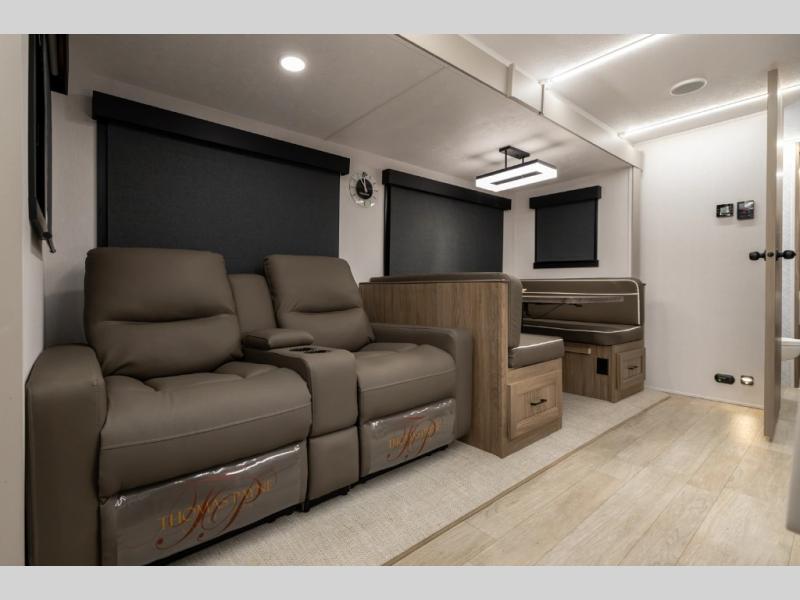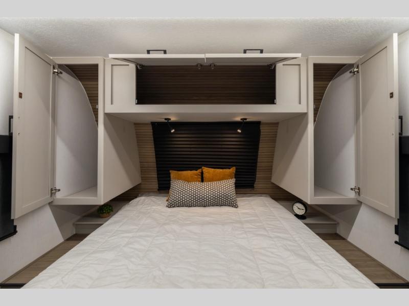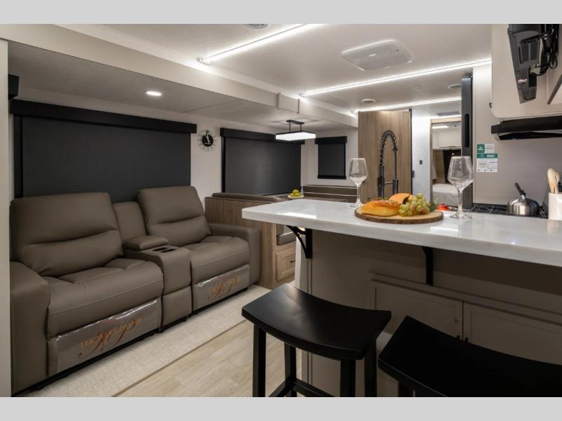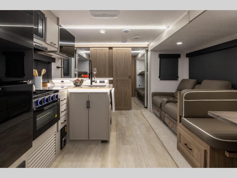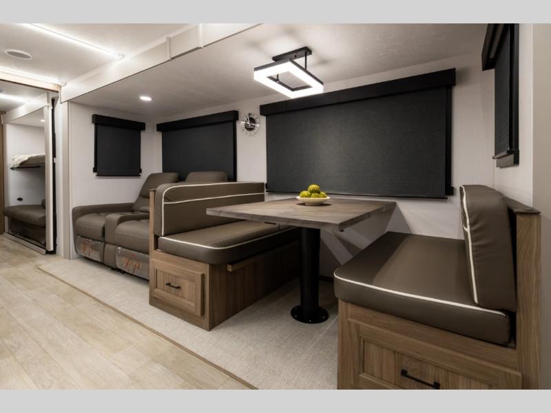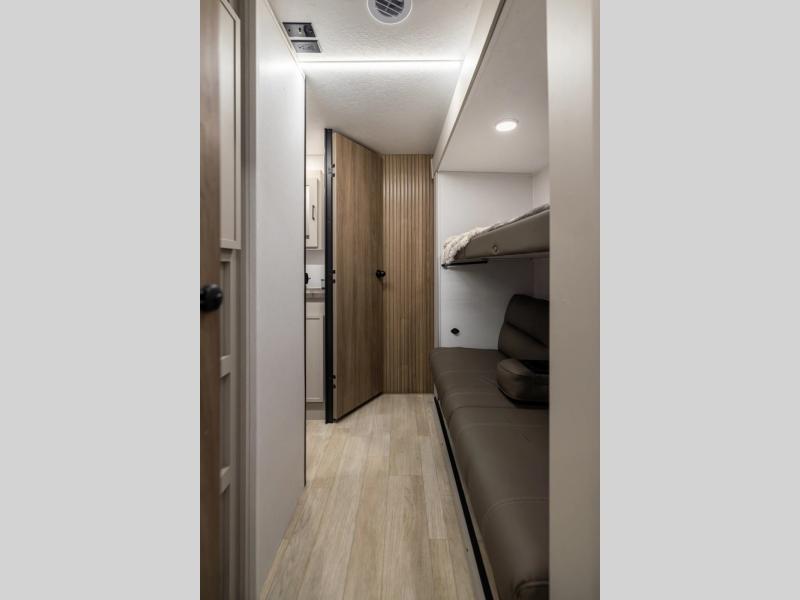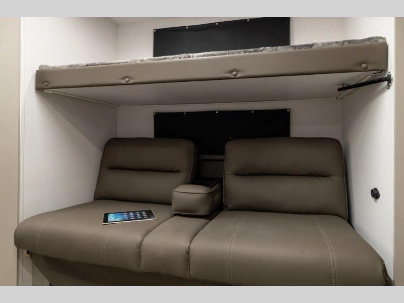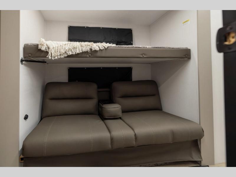 Get ready to immerse yourself in the relaxation zone. Two comfortable sofas convert into beds, and bunk beds above provide extra sleeping space for kids or guests. The bunkhouse is also divided with a half bath in the middle for privacy, which will make this space perfect for multiple guests or older children. The theater seating area is perfect for movie nights or game sessions. Furthermore, the kitchen is a culinary haven, featuring a four-burner range, microwave, and 12V refrigerator. The flip-up countertop adds extra space for food prep or snacks. The walk-through bathroom offers a refreshing oasis, equipped with everything you need to start your day feeling revitalized. Finally, the front bedroom is a peaceful retreat, featuring a queen bed and wardrobes on each side.