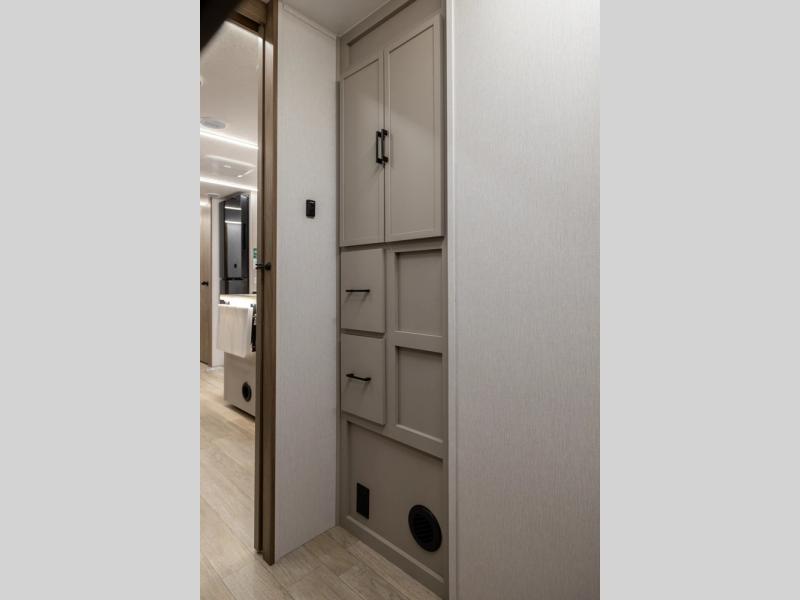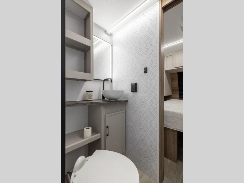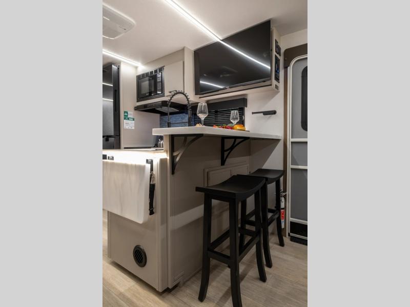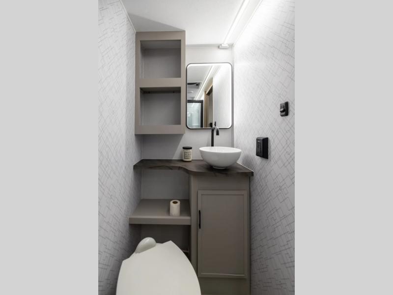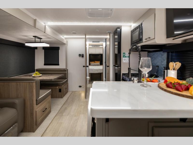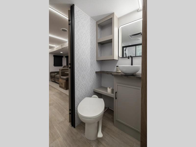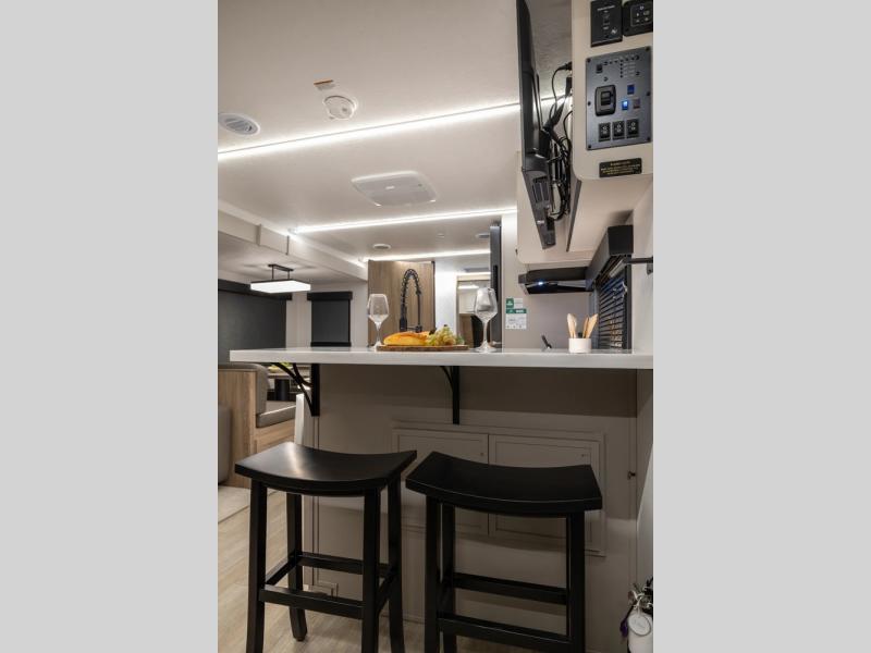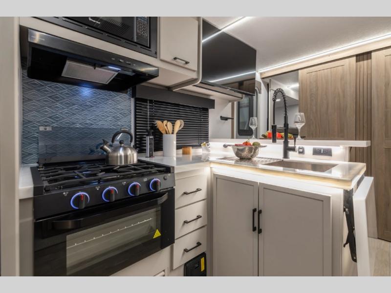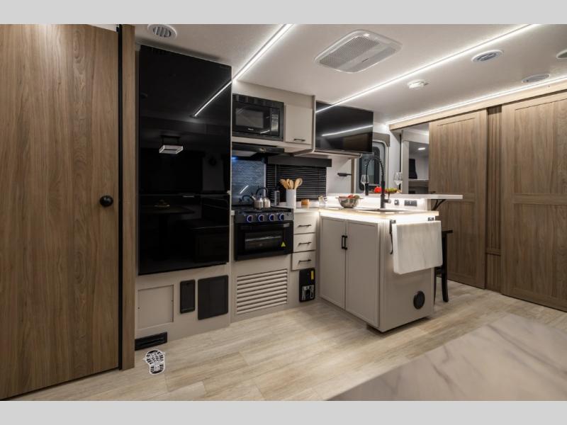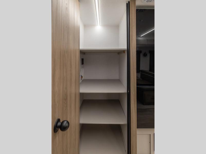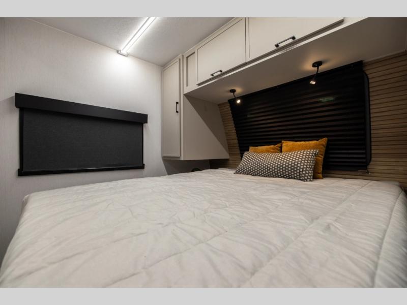 Get ready to immerse yourself in the relaxation zone. Two comfortable sofas convert into beds, and bunk beds above provide extra sleeping space for kids or guests. The bunkhouse is also divided with a half bath in the middle for privacy, which will make this space perfect for multiple guests or older children. The theater seating area is perfect for movie nights or game sessions. Furthermore, the kitchen is a culinary haven, featuring a four-burner range, microwave, and 12V refrigerator. The flip-up countertop adds extra space for food prep or snacks. The walk-through bathroom offers a refreshing oasis, equipped with everything you need to start your day feeling revitalized. Finally, the front bedroom is a peaceful retreat, featuring a queen bed and wardrobes on each side.
