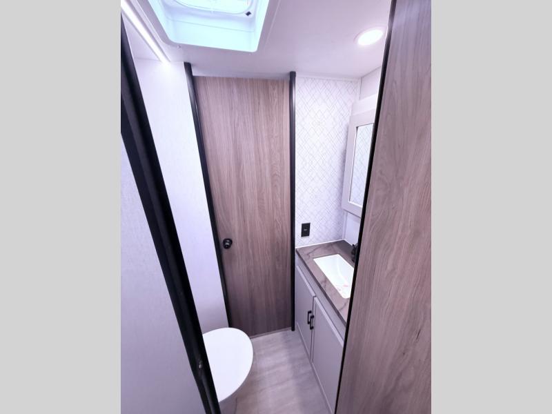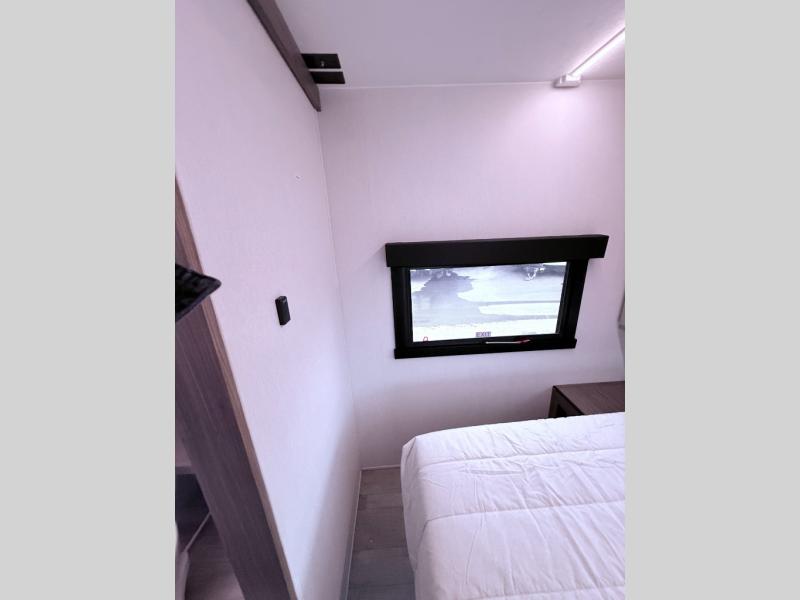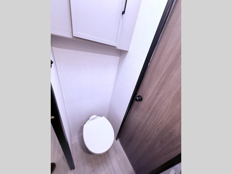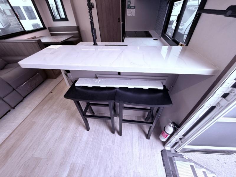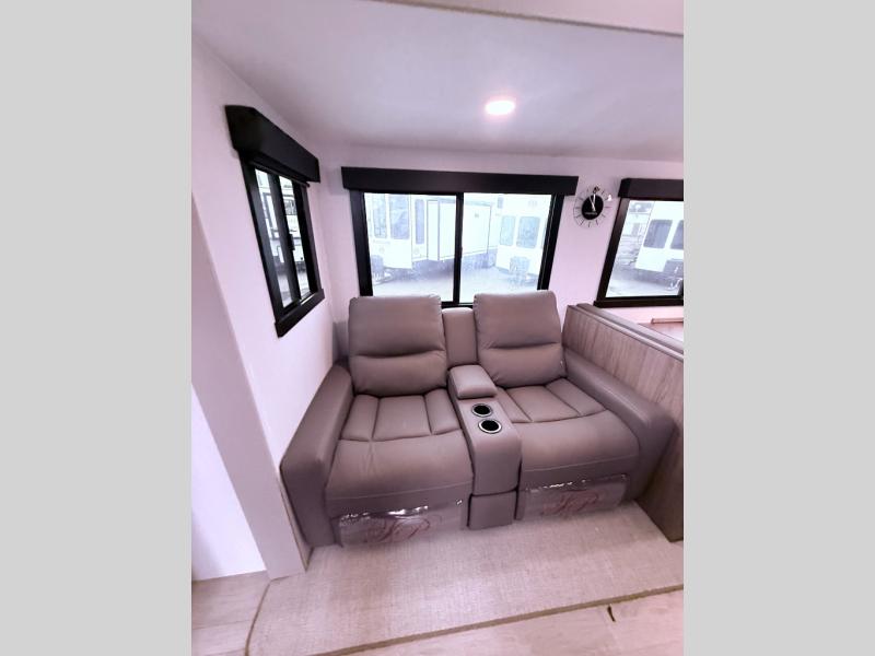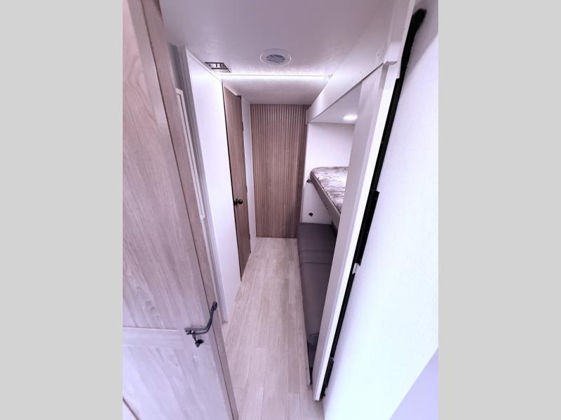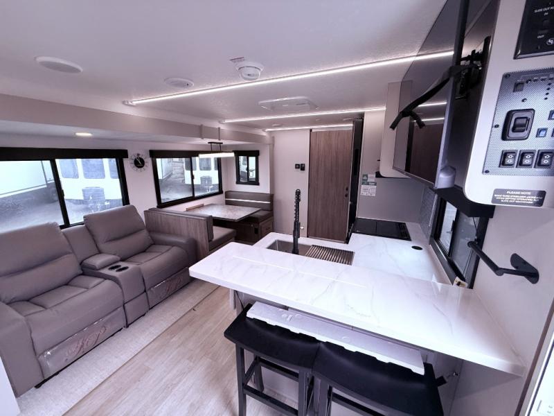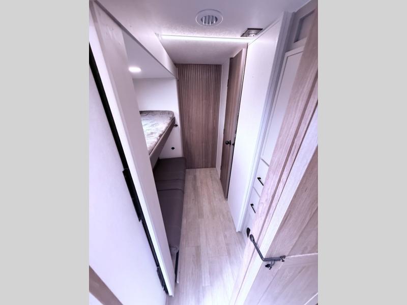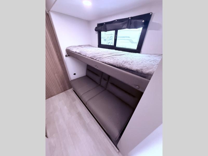 Get ready to immerse yourself in the relaxation zone. Two comfortable sofas convert into beds, and bunk beds above provide extra sleeping space for kids or guests. The bunkhouse is also divided with a half bath in the middle for privacy, which will make this space perfect for multiple guests or older children. The theater seating area is perfect for movie nights or game sessions. Furthermore, the kitchen is a culinary haven, featuring a four-burner range, microwave, and 12V refrigerator. The flip-up countertop adds extra space for food prep or snacks. The walk-through bathroom offers a refreshing oasis, equipped with everything you need to start your day feeling revitalized. Finally, the front bedroom is a peaceful retreat, featuring a queen bed and wardrobes on each side.