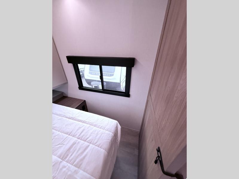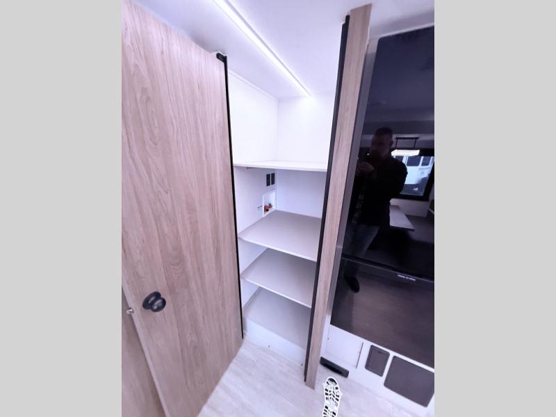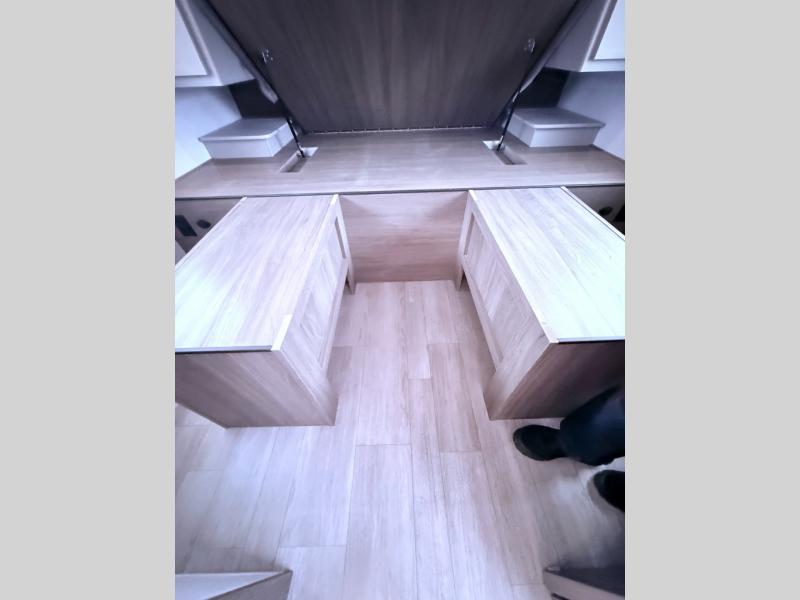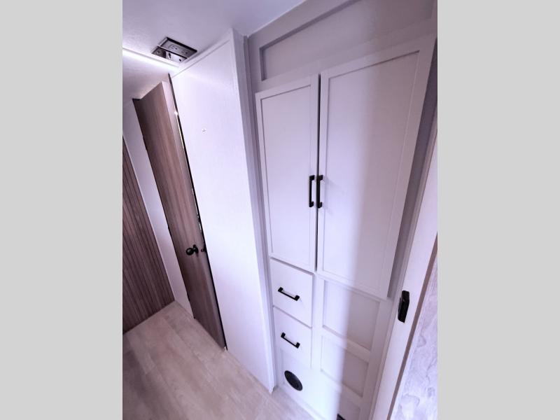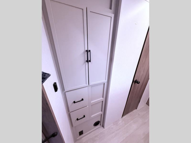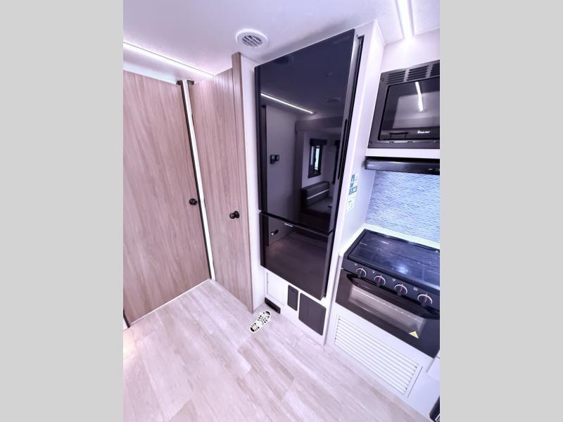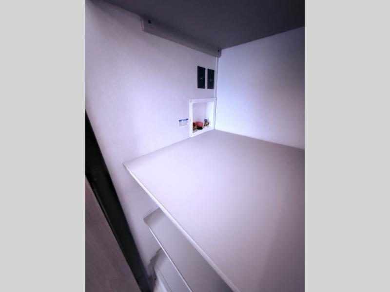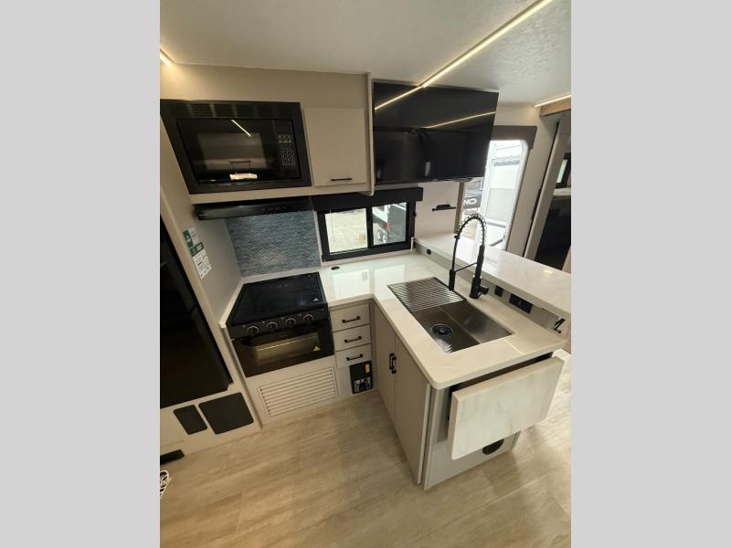 Get ready to immerse yourself in the relaxation zone. Two comfortable sofas convert into beds, and bunk beds above provide extra sleeping space for kids or guests. The bunkhouse is also divided with a half bath in the middle for privacy, which will make this space perfect for multiple guests or older children. The theater seating area is perfect for movie nights or game sessions. Furthermore, the kitchen is a culinary haven, featuring a four-burner range, microwave, and 12V refrigerator. The flip-up countertop adds extra space for food prep or snacks. The walk-through bathroom offers a refreshing oasis, equipped with everything you need to start your day feeling revitalized. Finally, the front bedroom is a peaceful retreat, featuring a queen bed and wardrobes on each side.