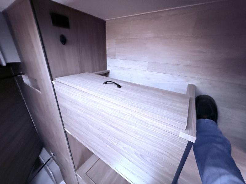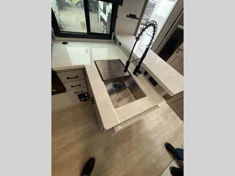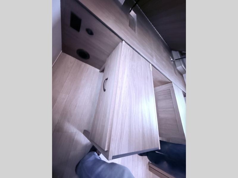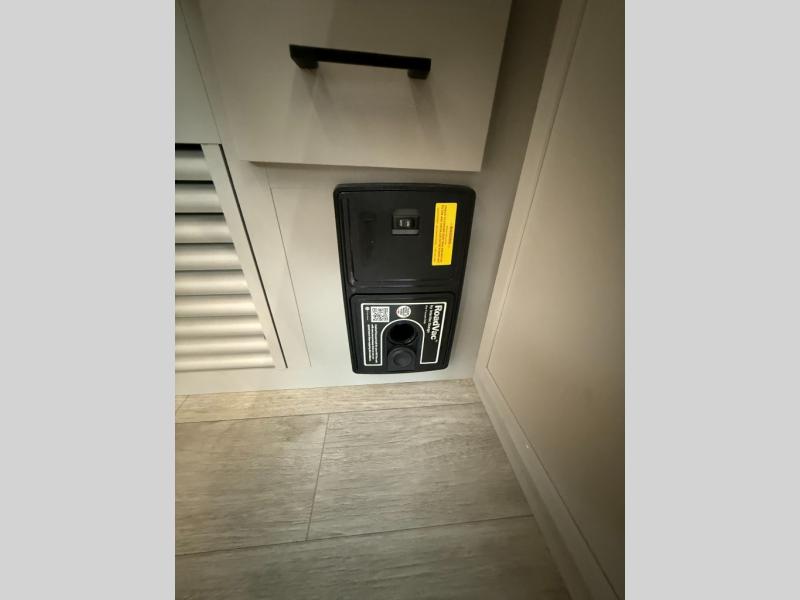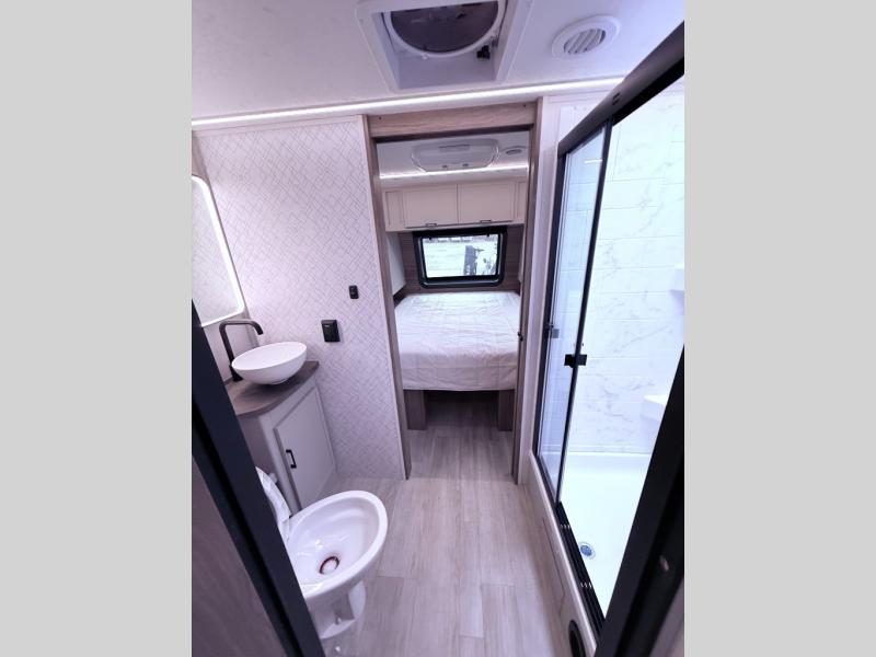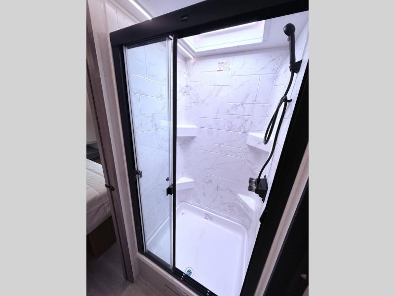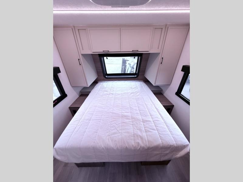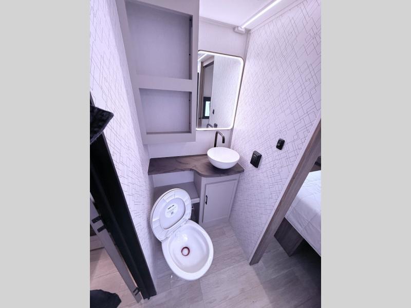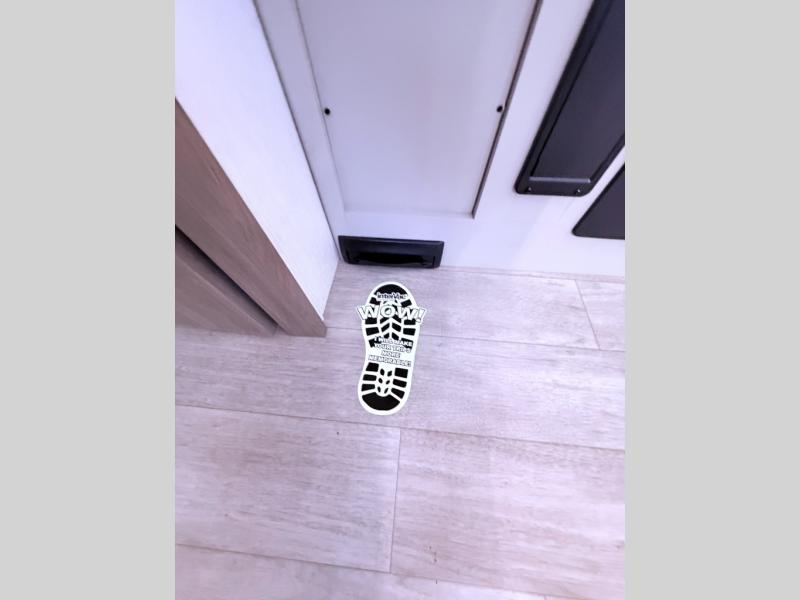 Get ready to immerse yourself in the relaxation zone. Two comfortable sofas convert into beds, and bunk beds above provide extra sleeping space for kids or guests. The bunkhouse is also divided with a half bath in the middle for privacy, which will make this space perfect for multiple guests or older children. The theater seating area is perfect for movie nights or game sessions. Furthermore, the kitchen is a culinary haven, featuring a four-burner range, microwave, and 12V refrigerator. The flip-up countertop adds extra space for food prep or snacks. The walk-through bathroom offers a refreshing oasis, equipped with everything you need to start your day feeling revitalized. Finally, the front bedroom is a peaceful retreat, featuring a queen bed and wardrobes on each side.