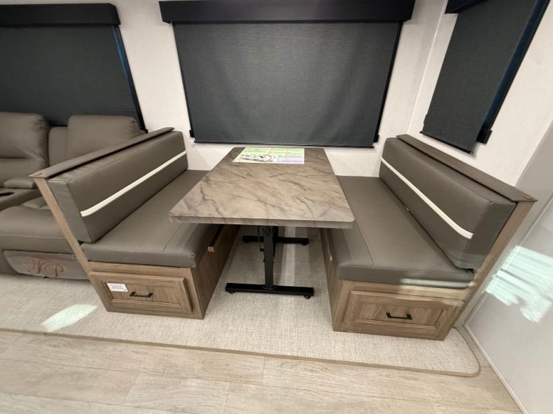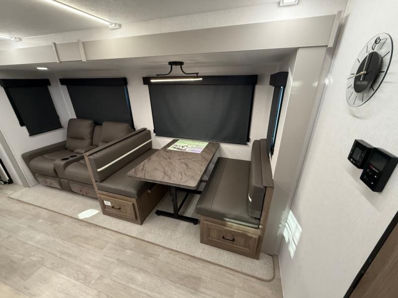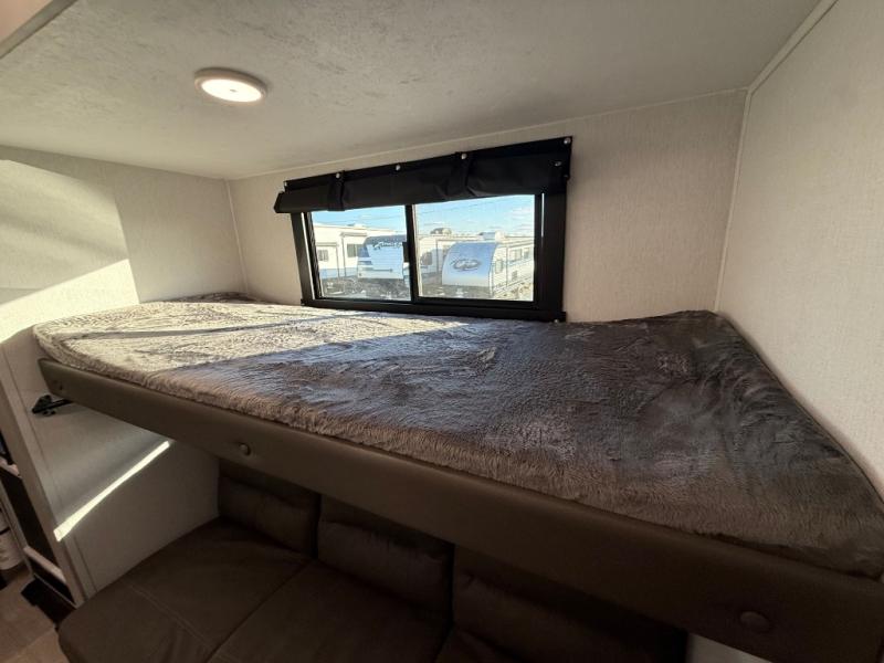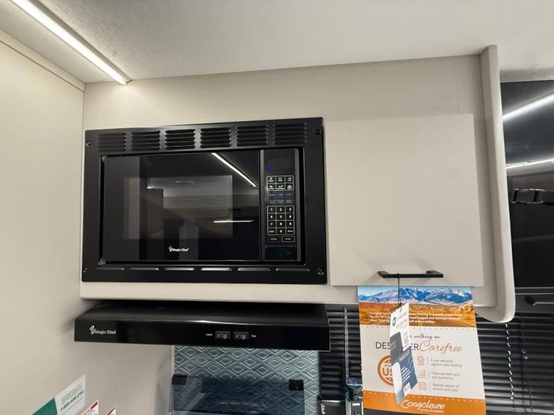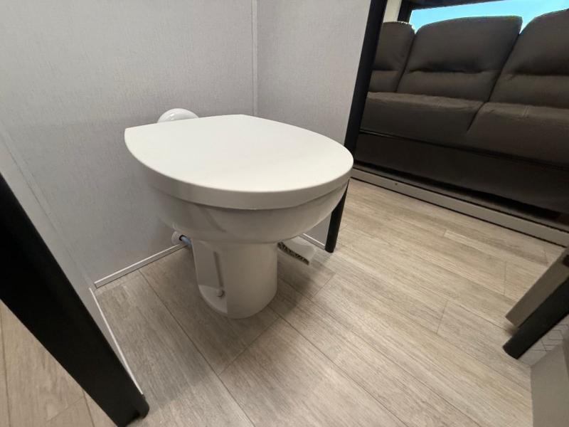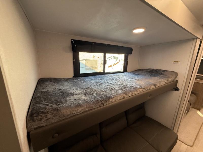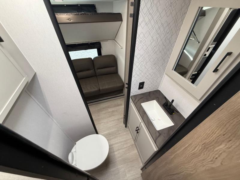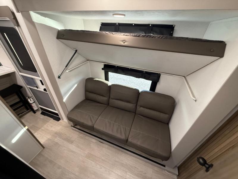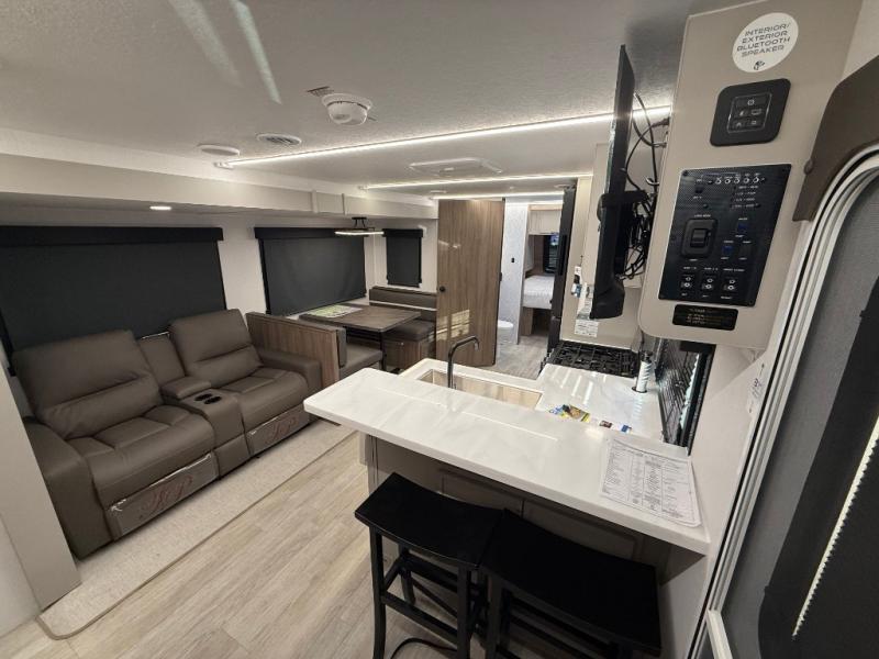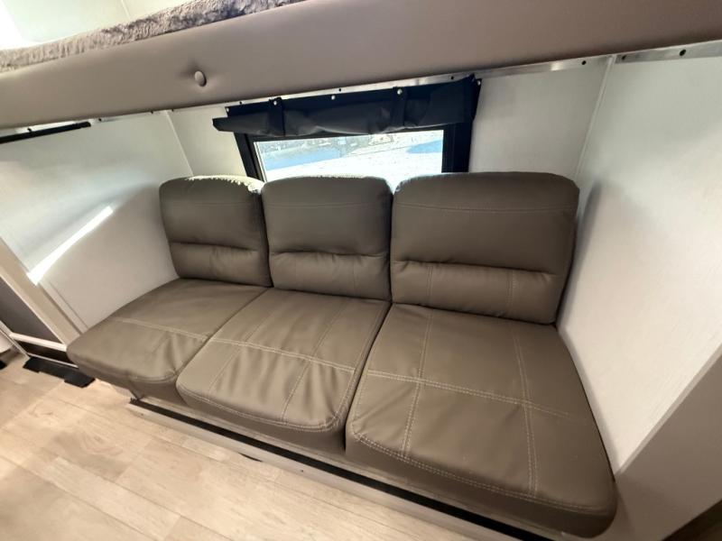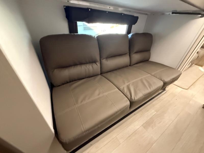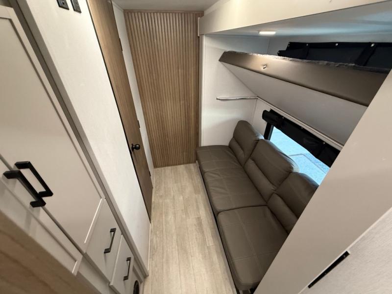 Get ready to immerse yourself in the relaxation zone. Two comfortable sofas convert into beds, and bunk beds above provide extra sleeping space for kids or guests. The bunkhouse is also divided with a half bath in the middle for privacy, which will make this space perfect for multiple guests or older children. The theater seating area is perfect for movie nights or game sessions. Furthermore, the kitchen is a culinary haven, featuring a four-burner range, microwave, and 12V refrigerator. The flip-up countertop adds extra space for food prep or snacks. The walk-through bathroom offers a refreshing oasis, equipped with everything you need to start your day feeling revitalized. Finally, the front bedroom is a peaceful retreat, featuring a queen bed and wardrobes on each side.
