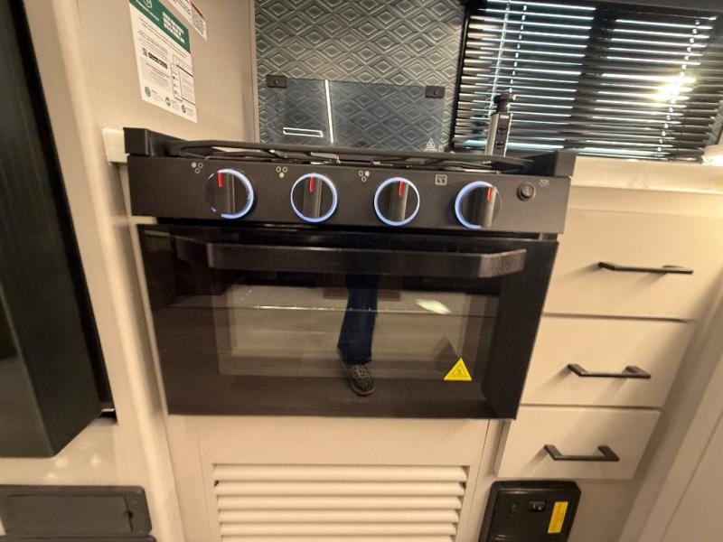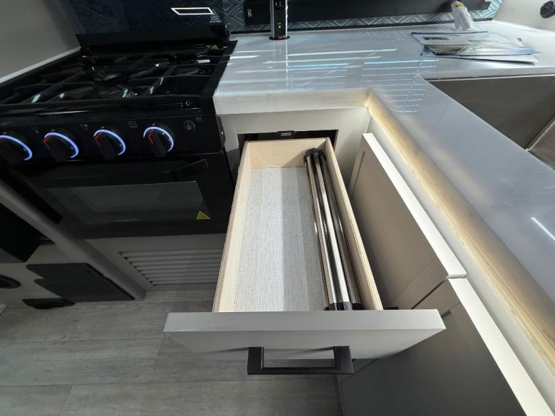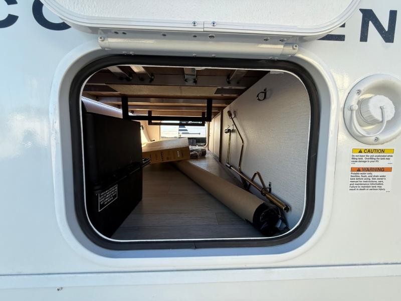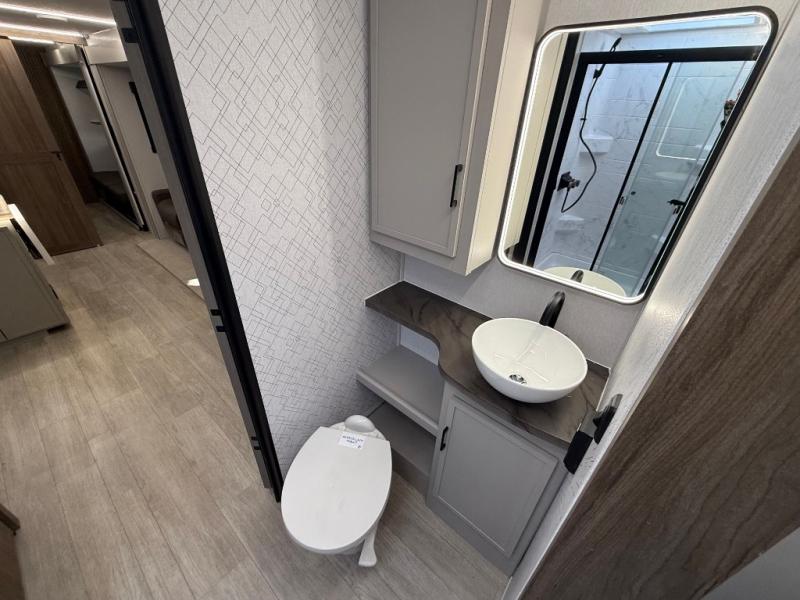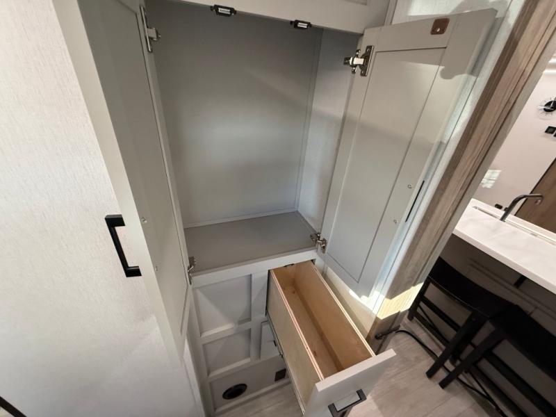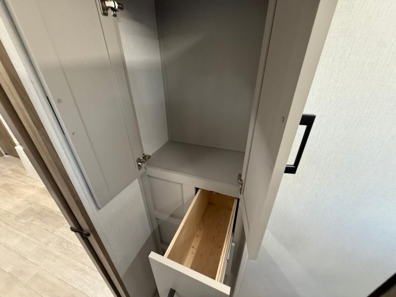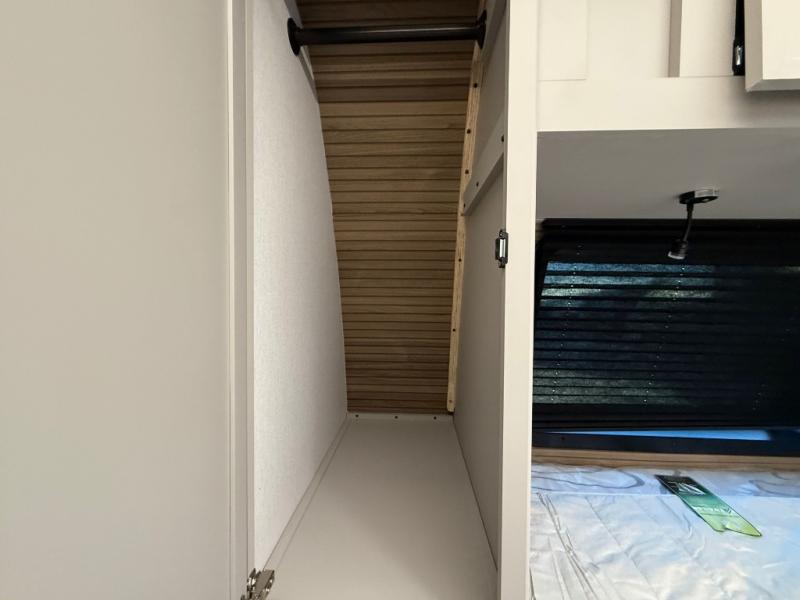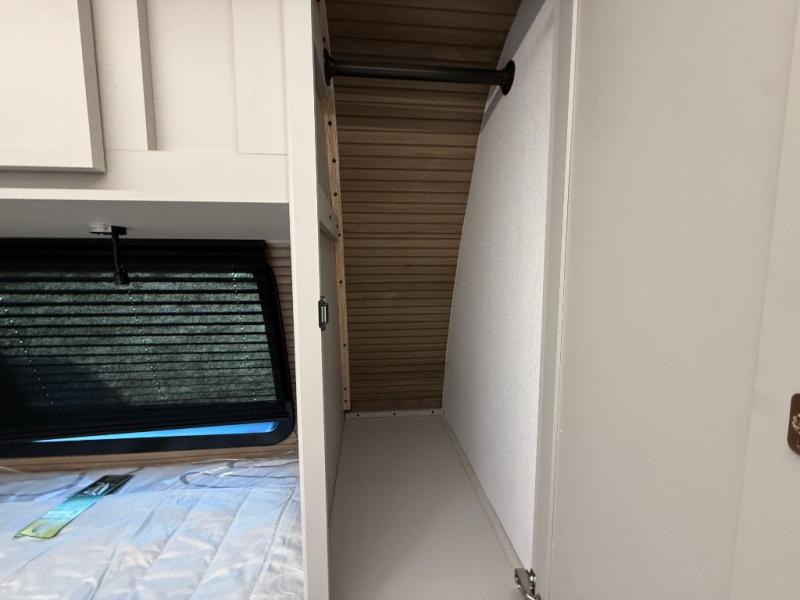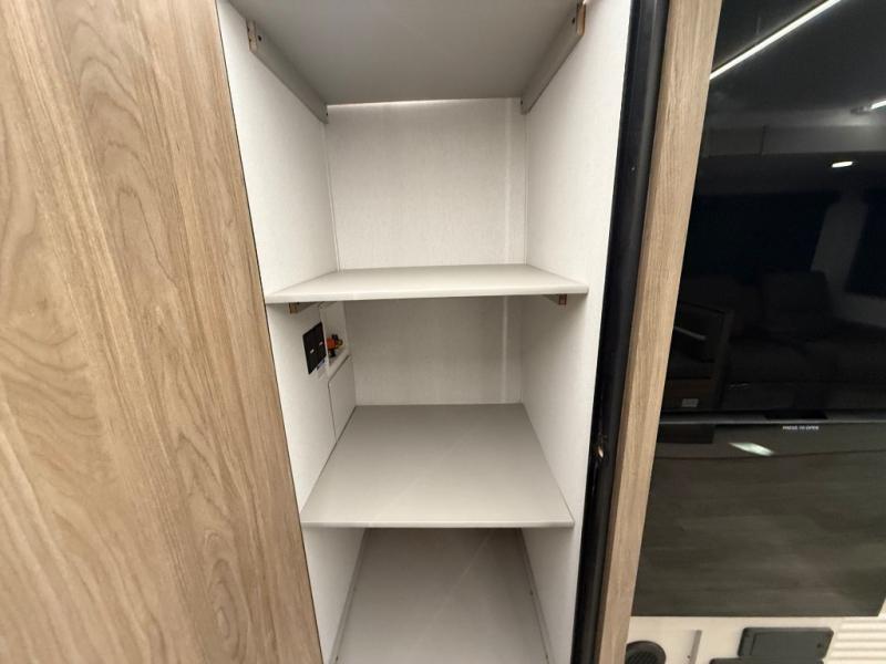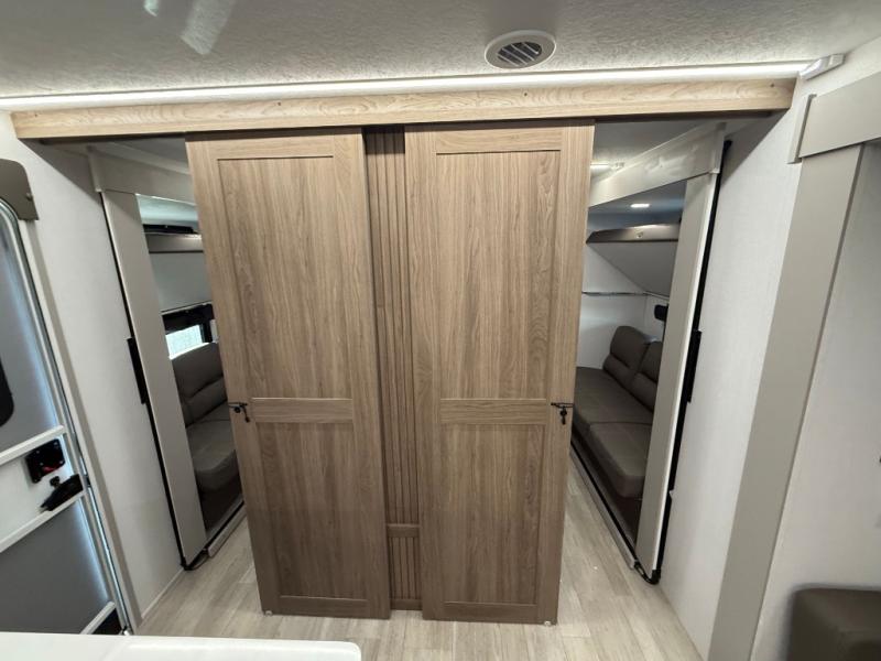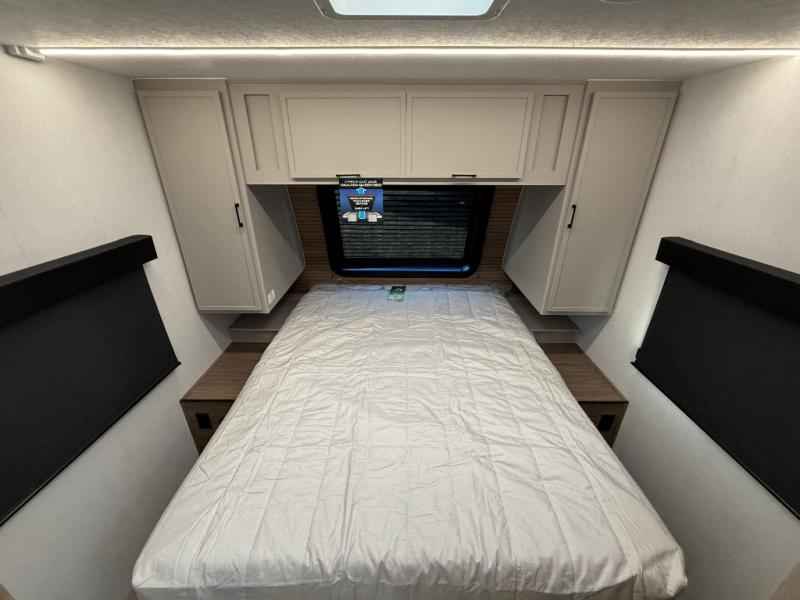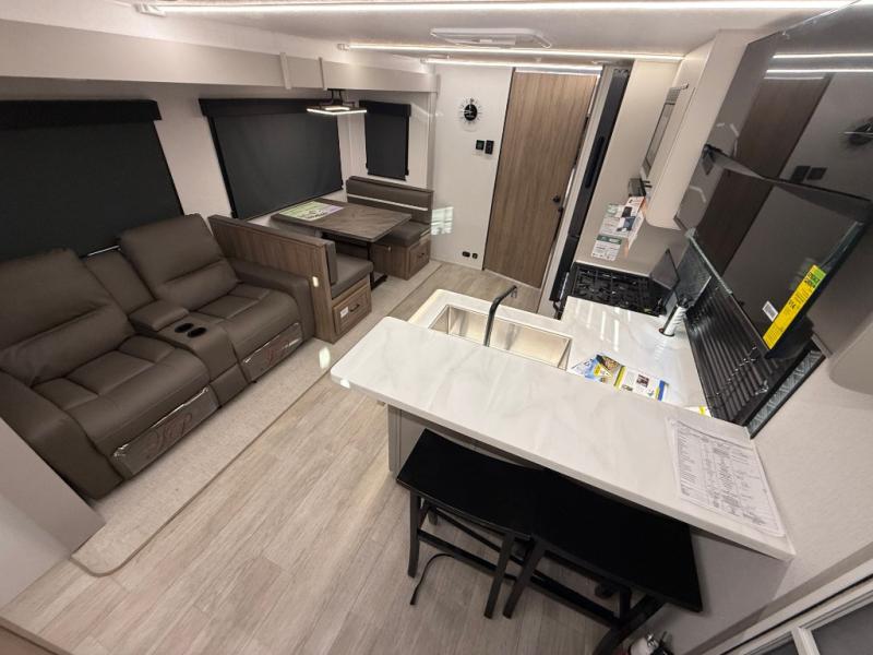 Get ready to immerse yourself in the relaxation zone. Two comfortable sofas convert into beds, and bunk beds above provide extra sleeping space for kids or guests. The bunkhouse is also divided with a half bath in the middle for privacy, which will make this space perfect for multiple guests or older children. The theater seating area is perfect for movie nights or game sessions. Furthermore, the kitchen is a culinary haven, featuring a four-burner range, microwave, and 12V refrigerator. The flip-up countertop adds extra space for food prep or snacks. The walk-through bathroom offers a refreshing oasis, equipped with everything you need to start your day feeling revitalized. Finally, the front bedroom is a peaceful retreat, featuring a queen bed and wardrobes on each side.