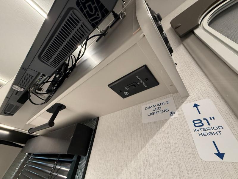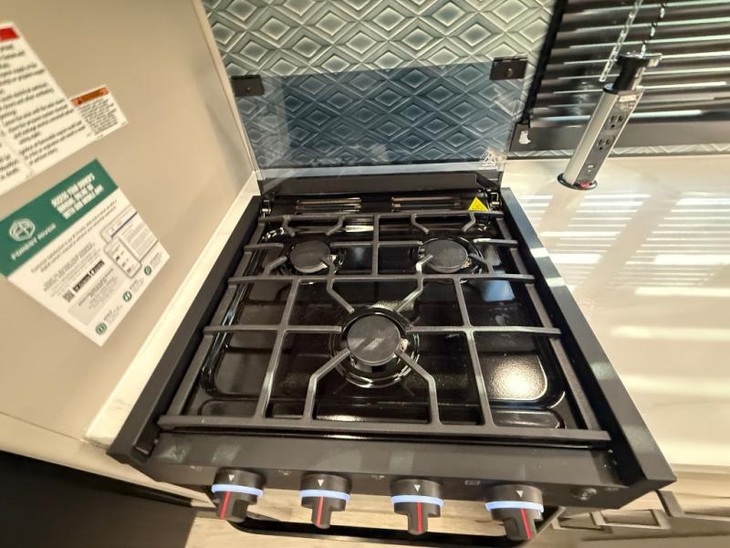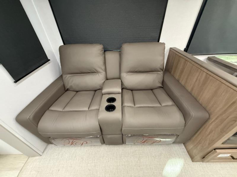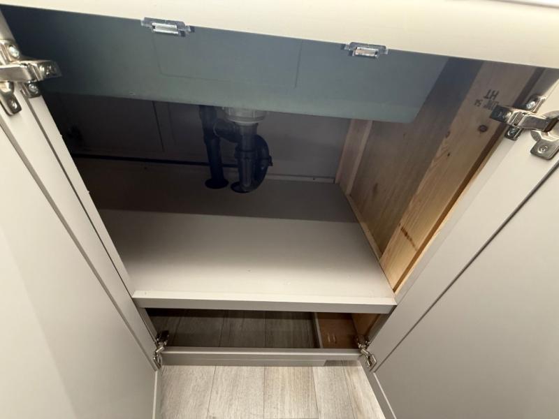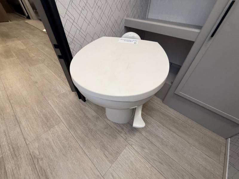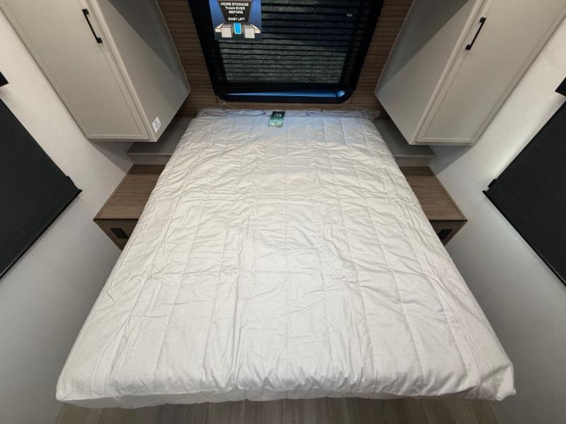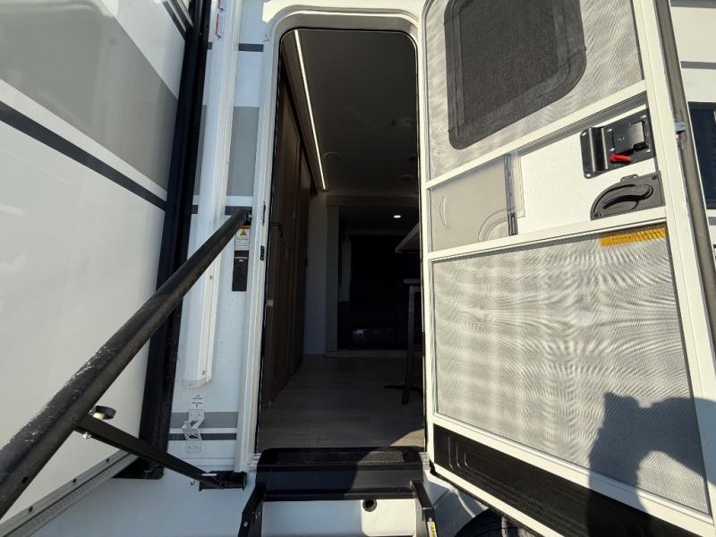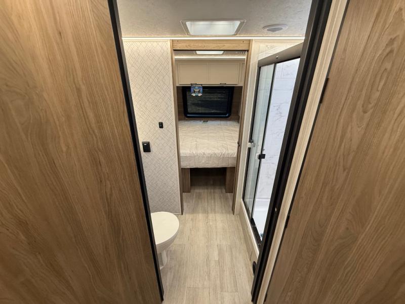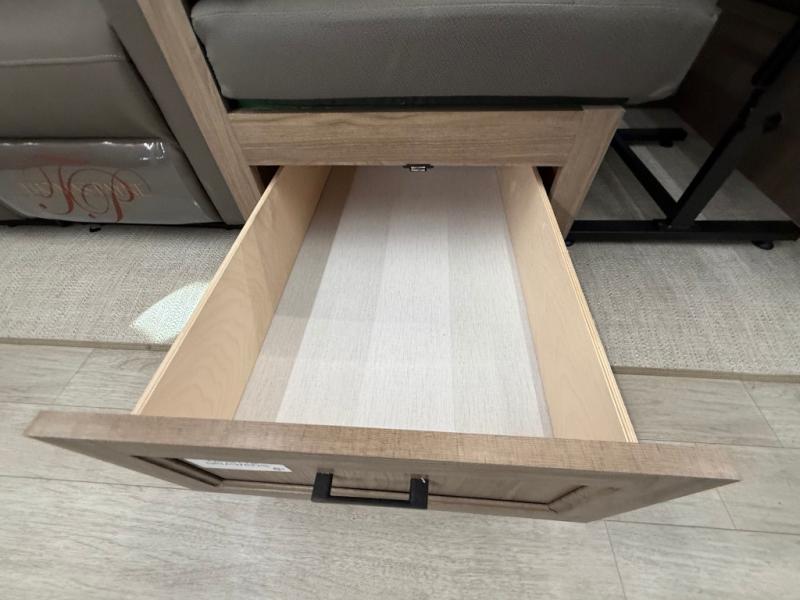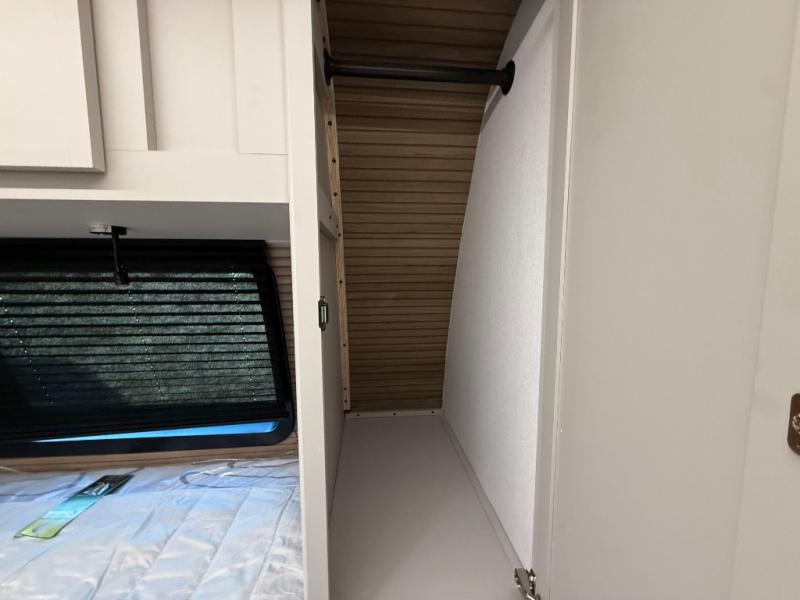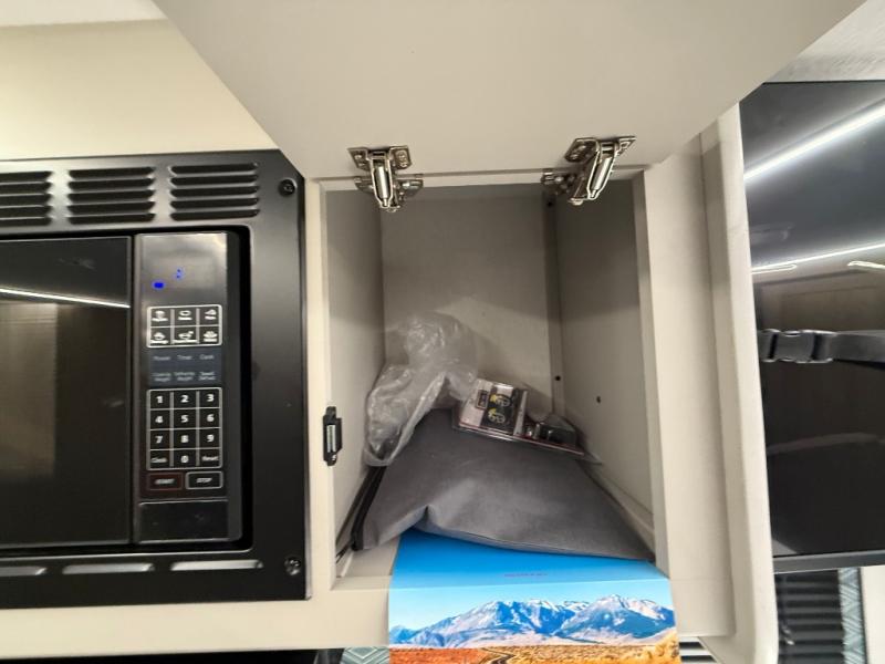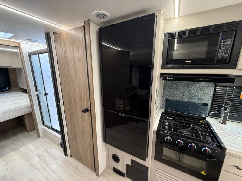 Get ready to immerse yourself in the relaxation zone. Two comfortable sofas convert into beds, and bunk beds above provide extra sleeping space for kids or guests. The bunkhouse is also divided with a half bath in the middle for privacy, which will make this space perfect for multiple guests or older children. The theater seating area is perfect for movie nights or game sessions. Furthermore, the kitchen is a culinary haven, featuring a four-burner range, microwave, and 12V refrigerator. The flip-up countertop adds extra space for food prep or snacks. The walk-through bathroom offers a refreshing oasis, equipped with everything you need to start your day feeling revitalized. Finally, the front bedroom is a peaceful retreat, featuring a queen bed and wardrobes on each side.