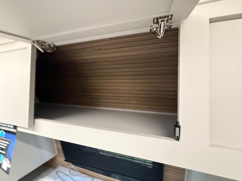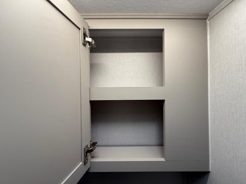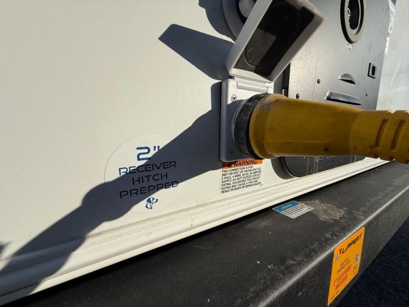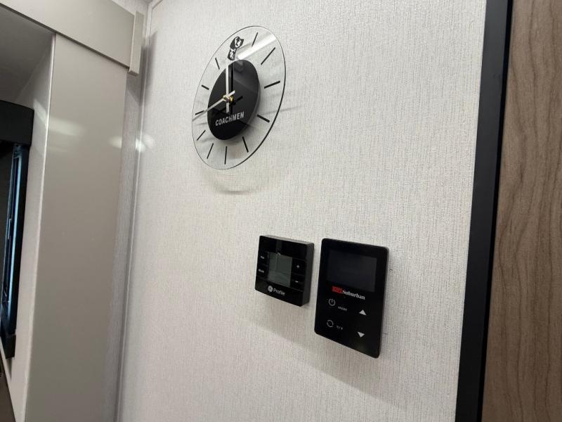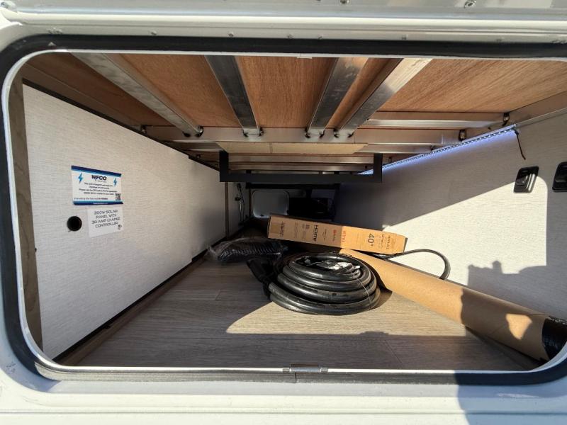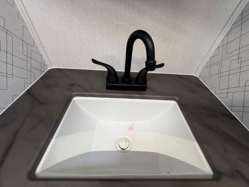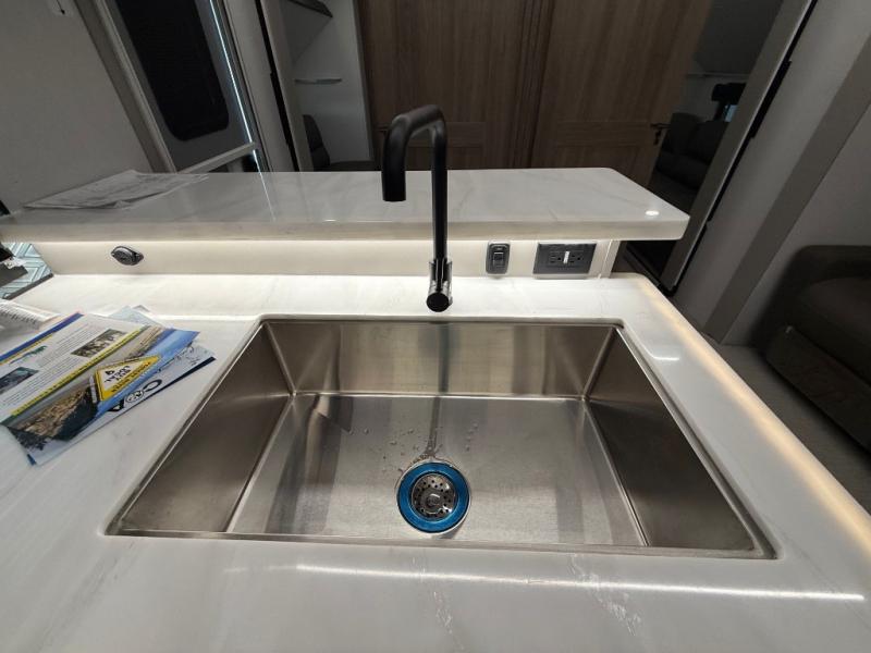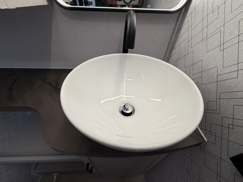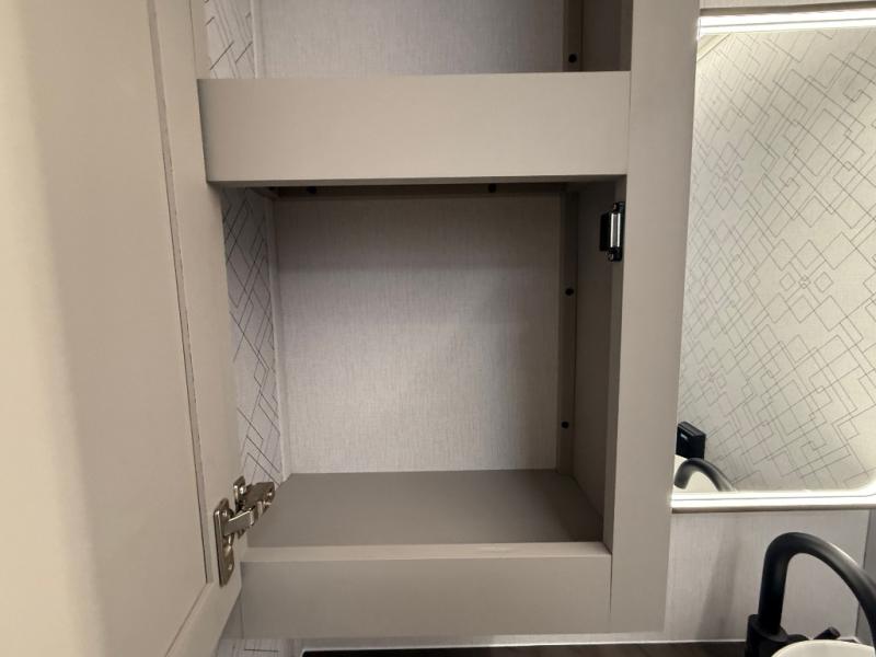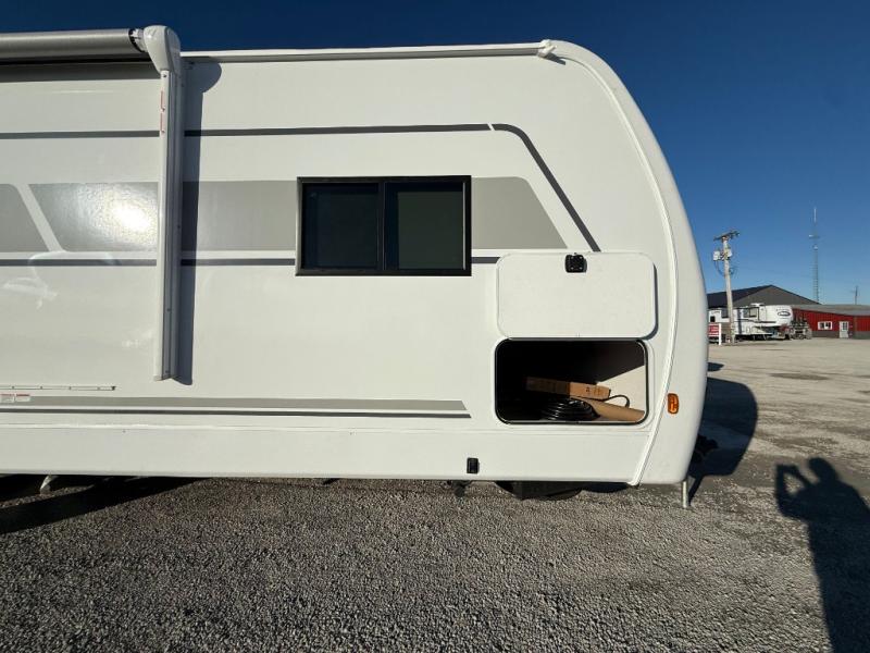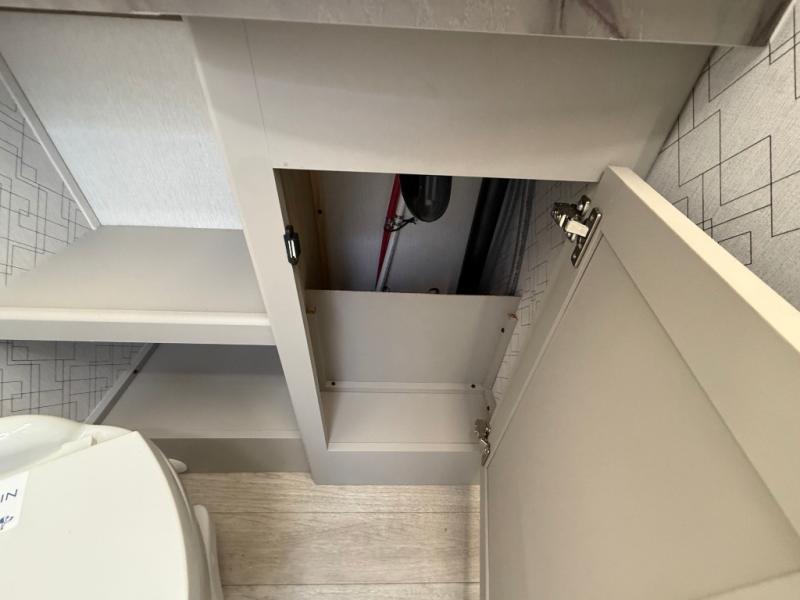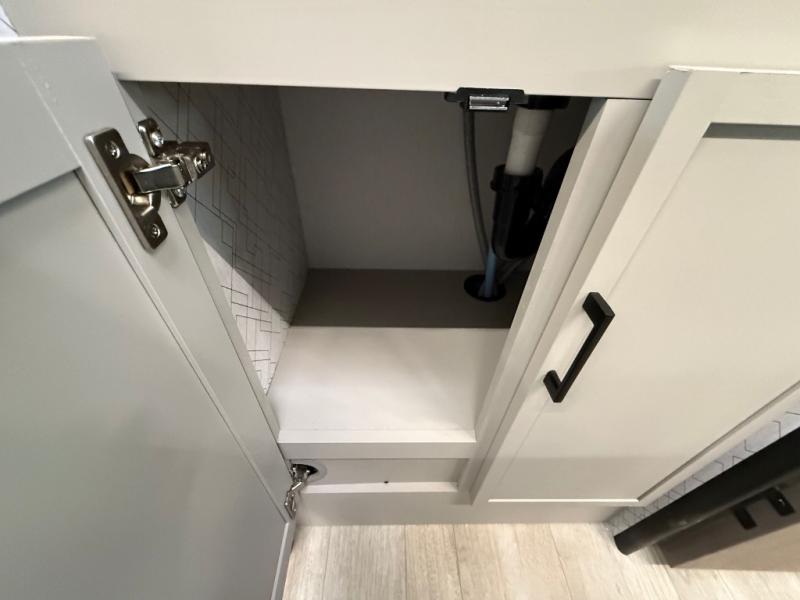 Get ready to immerse yourself in the relaxation zone. Two comfortable sofas convert into beds, and bunk beds above provide extra sleeping space for kids or guests. The bunkhouse is also divided with a half bath in the middle for privacy, which will make this space perfect for multiple guests or older children. The theater seating area is perfect for movie nights or game sessions. Furthermore, the kitchen is a culinary haven, featuring a four-burner range, microwave, and 12V refrigerator. The flip-up countertop adds extra space for food prep or snacks. The walk-through bathroom offers a refreshing oasis, equipped with everything you need to start your day feeling revitalized. Finally, the front bedroom is a peaceful retreat, featuring a queen bed and wardrobes on each side.