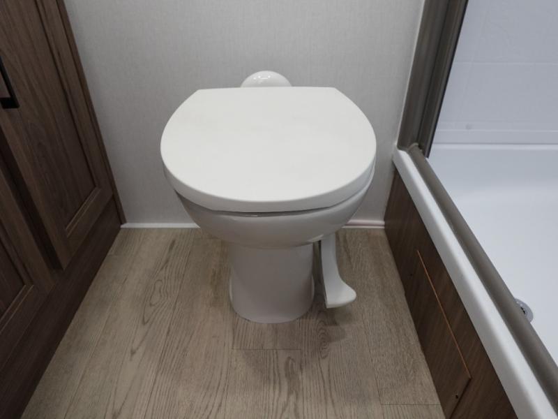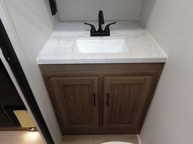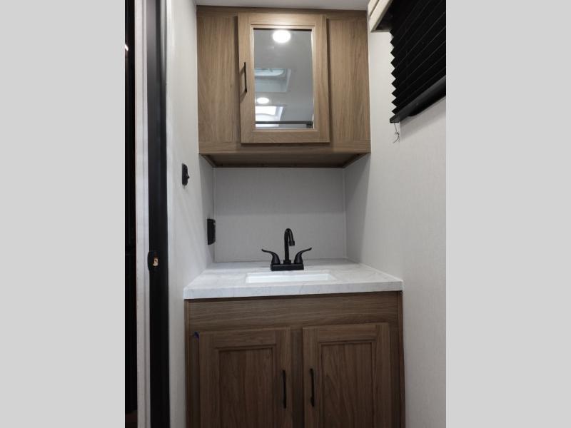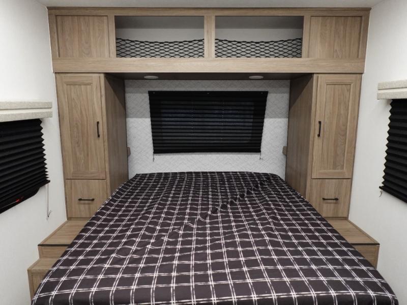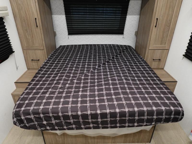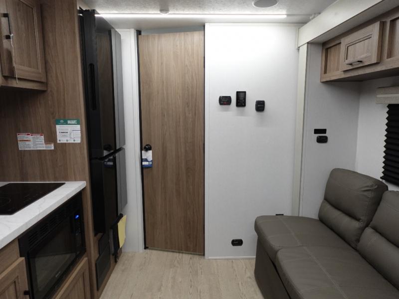 You'll love spending time at the campground in this single slide out travel trailer! The 54" x 80" front bed includes vaulted underbed storage to keep your luggage or extra blankets out of the way, plus there are dual bedside wardrobes for your clothes. A sofa with a free-standing table will provide a place to relax and dine, and the full kitchen includes a dual-burner cooktop and microwave to cook meals each day. This unit also features a full rear bath, complete with a 30" x 36" shower, a toilet, and a sink with a medicine cabinet for your necessities.