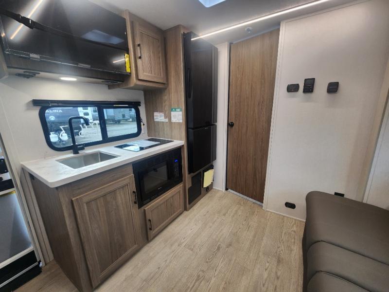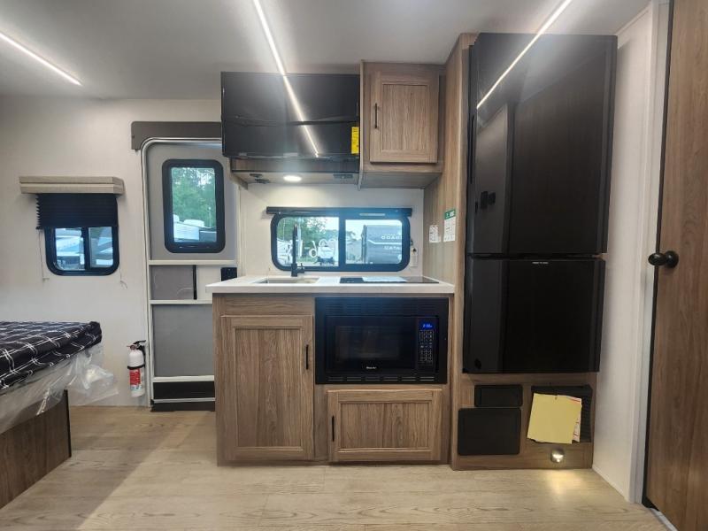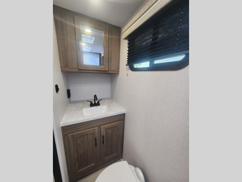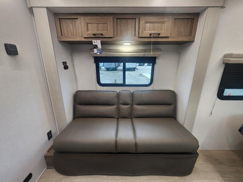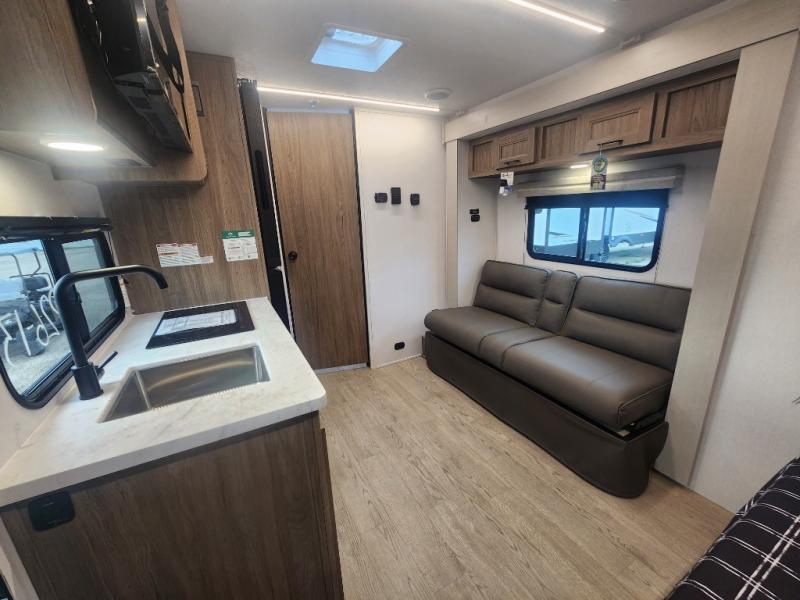 You'll love spending time at the campground in this single slide out travel trailer! The 54" x 80" front bed includes vaulted underbed storage to keep your luggage or extra blankets out of the way, plus there are dual bedside wardrobes for your clothes. A sofa with a free-standing table will provide a place to relax and dine, and the full kitchen includes a dual-burner cooktop and microwave to cook meals each day. This unit also features a full rear bath, complete with a 30" x 36" shower, a toilet, and a sink with a medicine cabinet for your necessities.