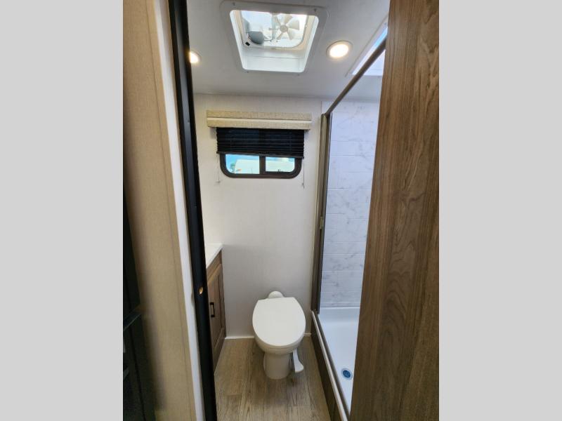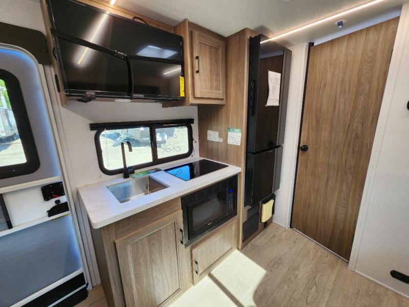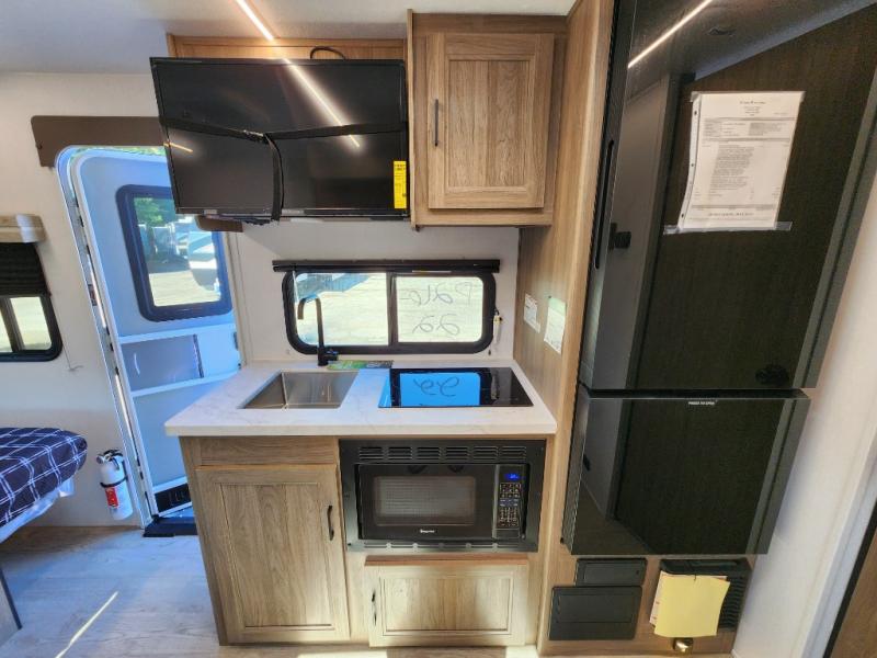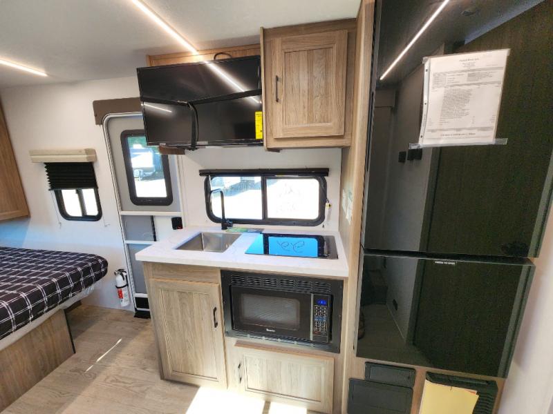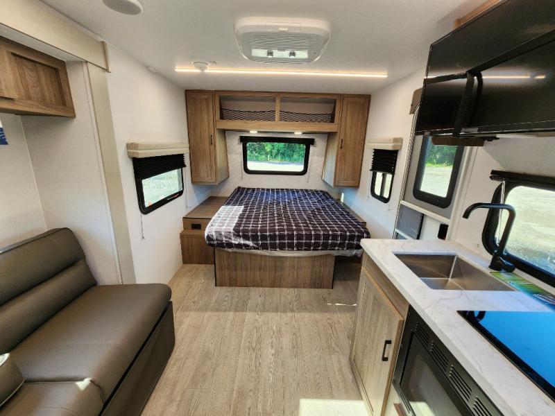 You'll love spending time at the campground in this single slide out travel trailer! The 54" x 80" front bed includes vaulted underbed storage to keep your luggage or extra blankets out of the way, plus there are dual bedside wardrobes for your clothes. A sofa with a free-standing table will provide a place to relax and dine, and the full kitchen includes a dual-burner cooktop and microwave oven to cook meals each day. This unit also features a full rear bath, complete with a 30" x 36" shower, a toilet, and a sink with a medicine cabinet for your necessities.