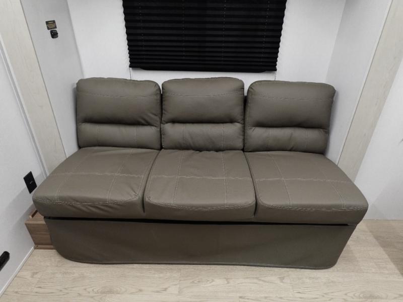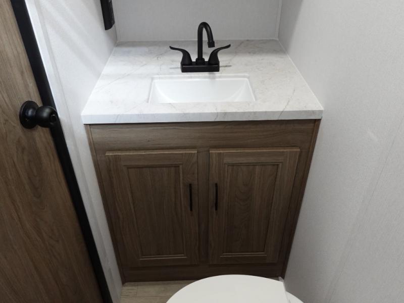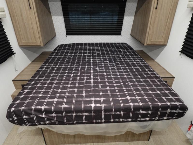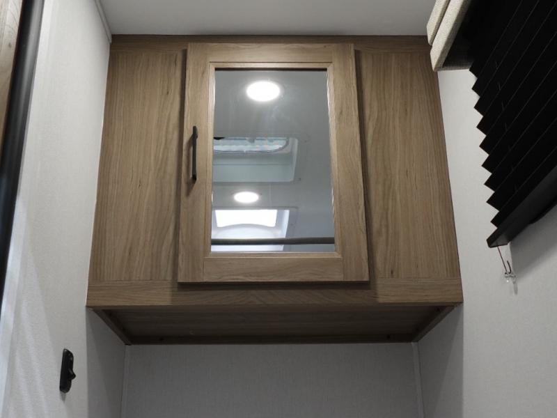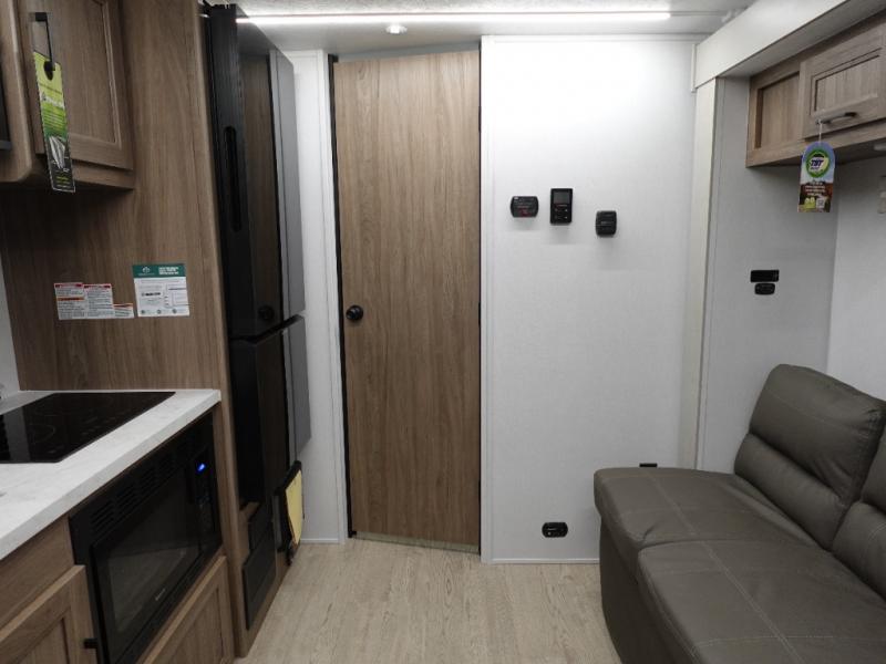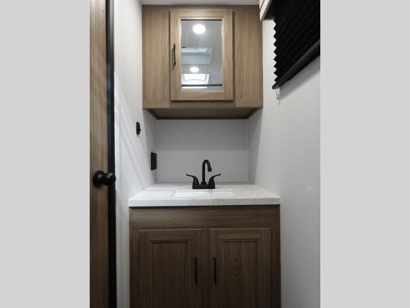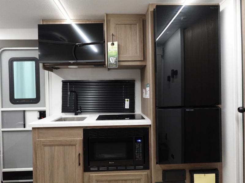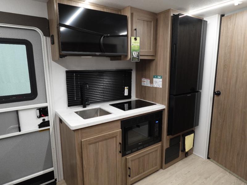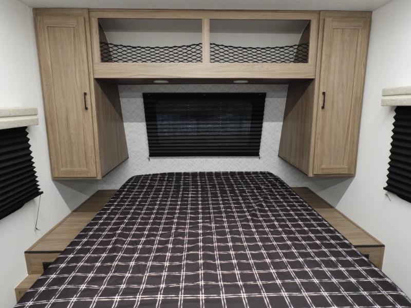 You'll love spending time at the campground in this single slide out travel trailer! The 54" x 80" front bed includes vaulted underbed storage to keep your luggage or extra blankets out of the way, plus there are dual bedside wardrobes for your clothes. A sofa with a free-standing table will provide a place to relax and dine, and the full kitchen includes a dual-burner cooktop and microwave to cook meals each day. This unit also features a full rear bath, complete with a 30" x 36" shower, a toilet, and a sink with a medicine cabinet for your necessities.
