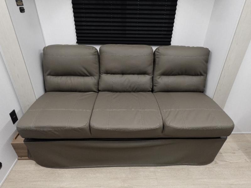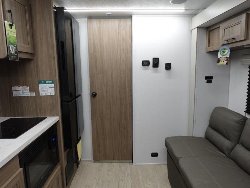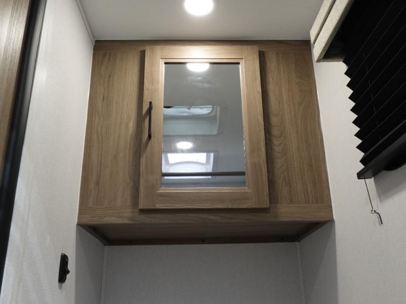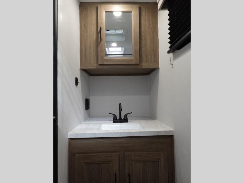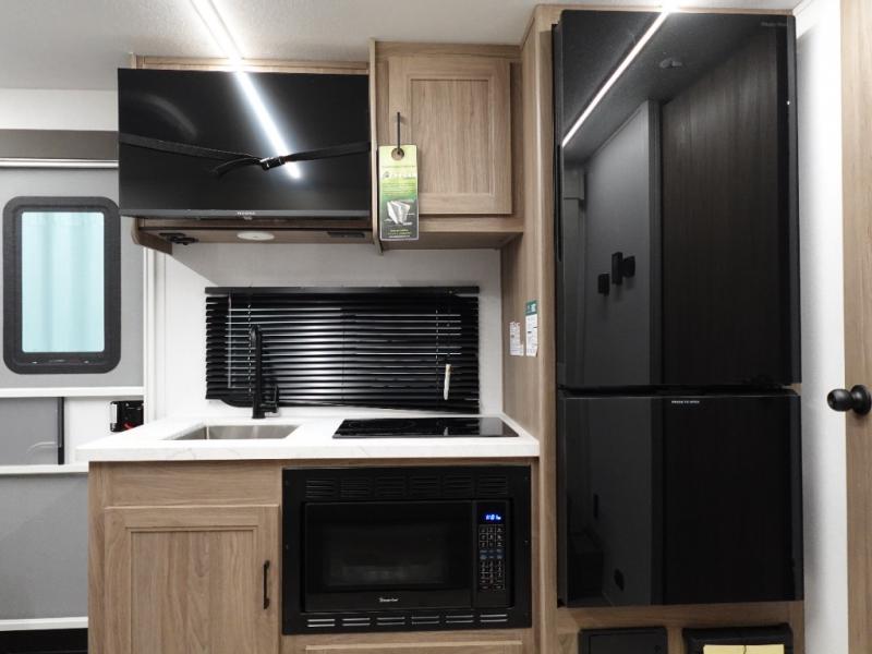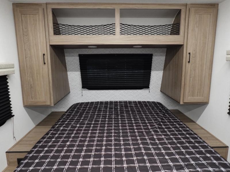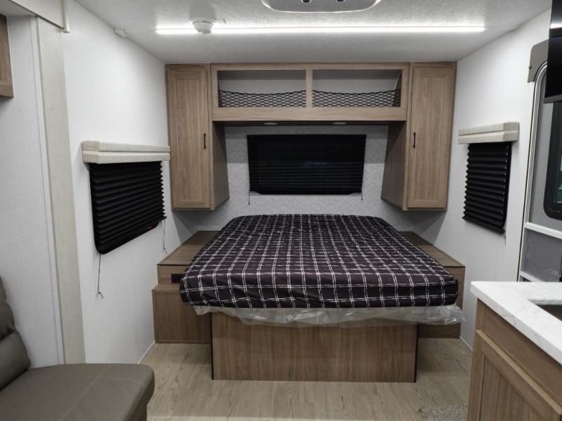 You'll love spending time at the campground in this single slide out travel trailer! The 54" x 80" front bed includes vaulted underbed storage to keep your luggage or extra blankets out of the way, plus there are dual bedside wardrobes for your clothes. A sofa with a free-standing table will provide a place to relax and dine, and the full kitchen includes a dual-burner cooktop and microwave to cook meals each day. This unit also features a full rear bath, complete with a 30" x 36" shower, a toilet, and a sink with a medicine cabinet for your necessities.