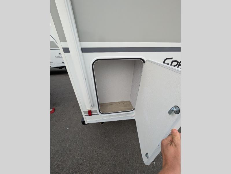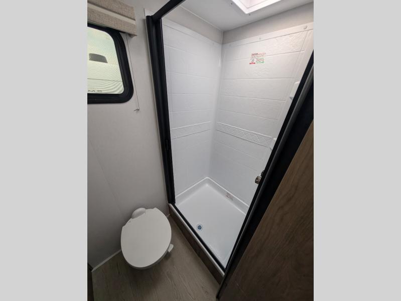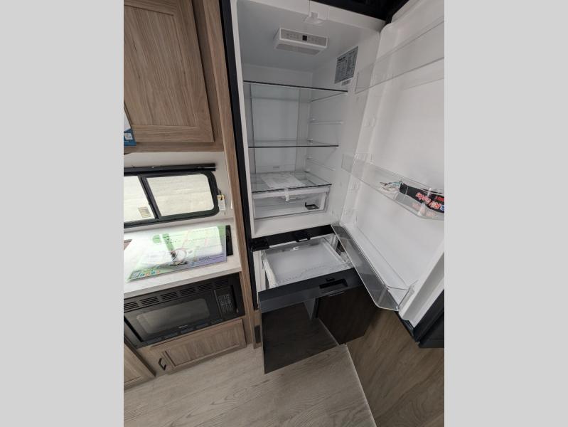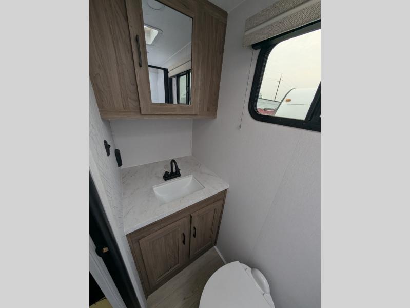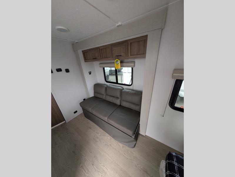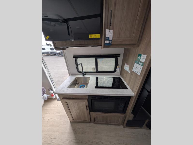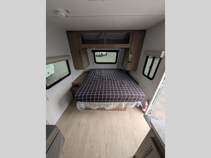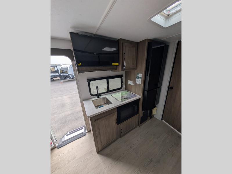 You'll love spending time at the campground in this single slide out travel trailer! The 54" x 80" front bed includes vaulted underbed storage to keep your luggage or extra blankets out of the way, plus there are dual bedside wardrobes for your clothes. A sofa with a free-standing table will provide a place to relax and dine, and the full kitchen includes a dual-burner cooktop and microwave to cook meals each day. This unit also features a full rear bath, complete with a 30" x 36" shower, a toilet, and a sink with a medicine cabinet for your necessities.