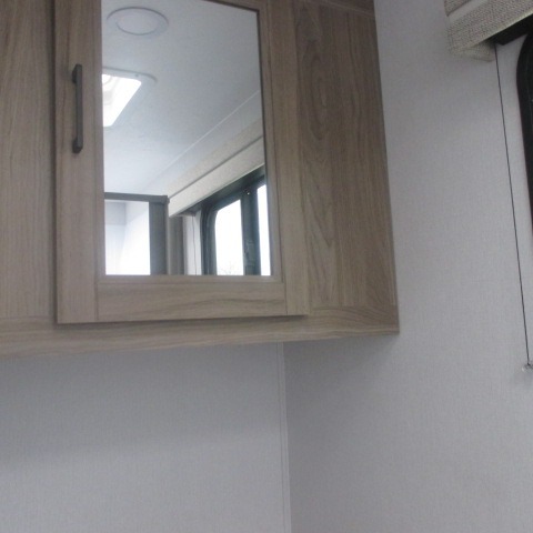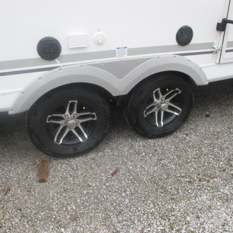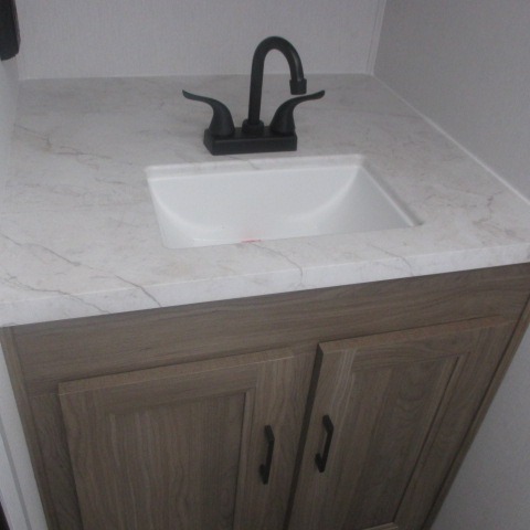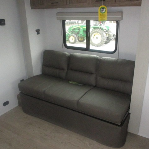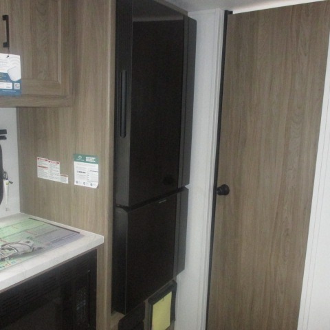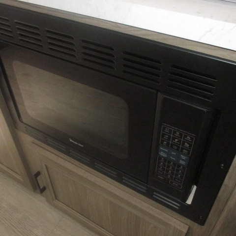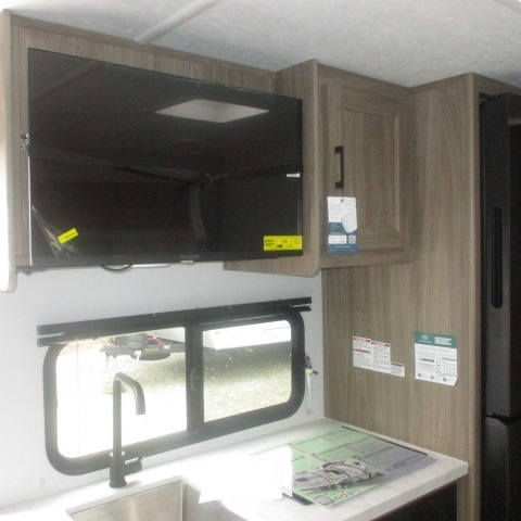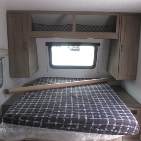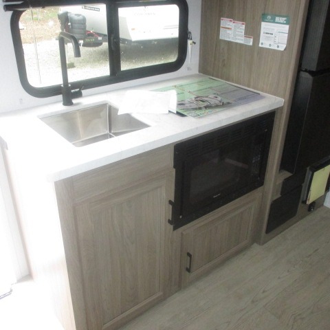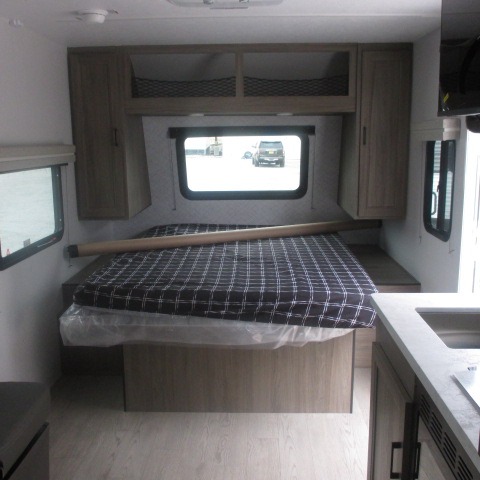 You'll love spending time at the campground in this single slide out travel trailer! The 54" x 80" front bed includes vaulted underbed storage to keep your luggage or extra blankets out of the way, plus there are dual bedside wardrobes for your clothes. A sofa with a free-standing table will provide a place to relax and dine, and the full kitchen includes a dual-burner cooktop and microwave to cook meals each day. This unit also features a full rear bath, complete with a 30" x 36" shower, a toilet, and a sink with a medicine cabinet for your necessities.