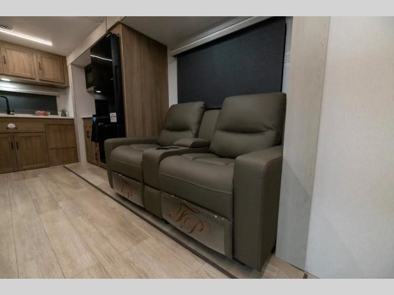 You'll love spending time at the campground in this single slide out travel trailer! The 60" x 80" front queen bed includes vaulted underbed storage to keep your luggage or extra blankets out of the way, plus there are dual bedside wardrobes for your clothes. A sofa with a free-standing table will provide a place to relax and dine, and the full kitchen includes a dual-burner cooktop and microwave oven to cook meals each day. This unit also features a rear corner bath with a 32" radius shower, a toilet, sink, and bath linen closet for clean towels!