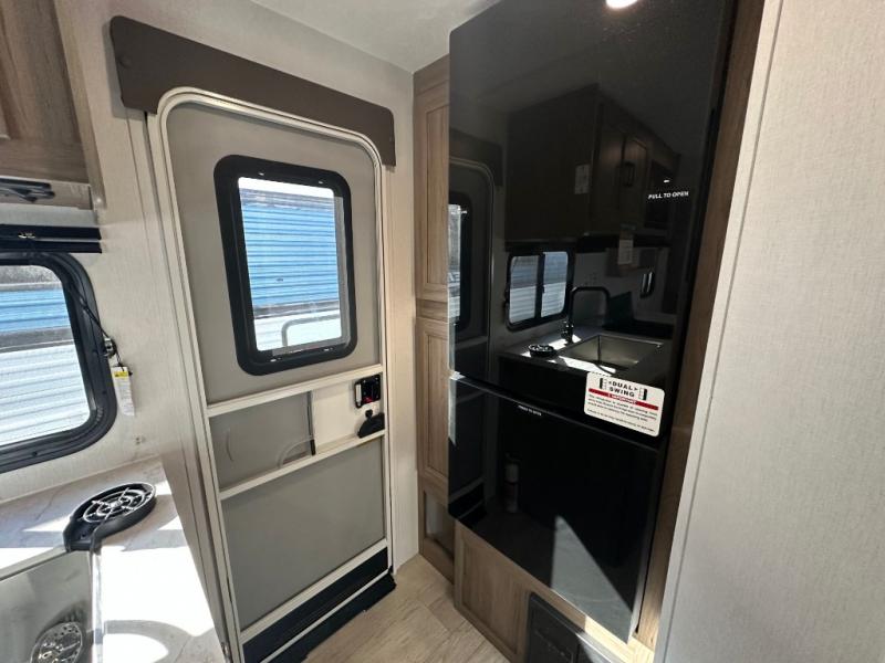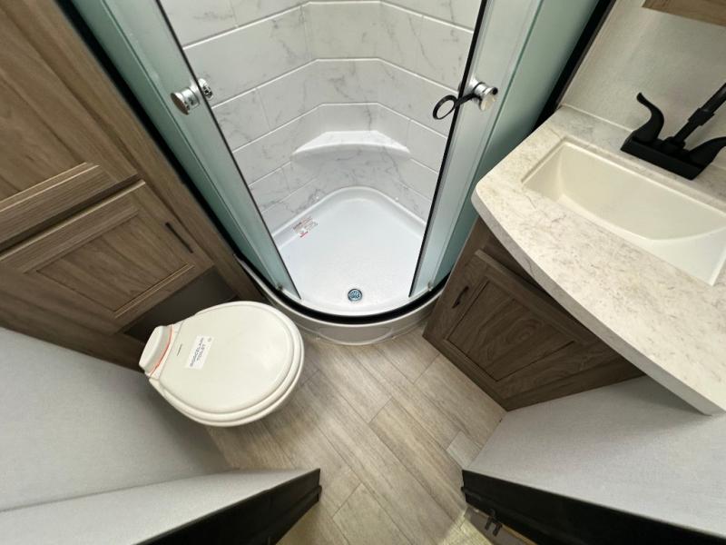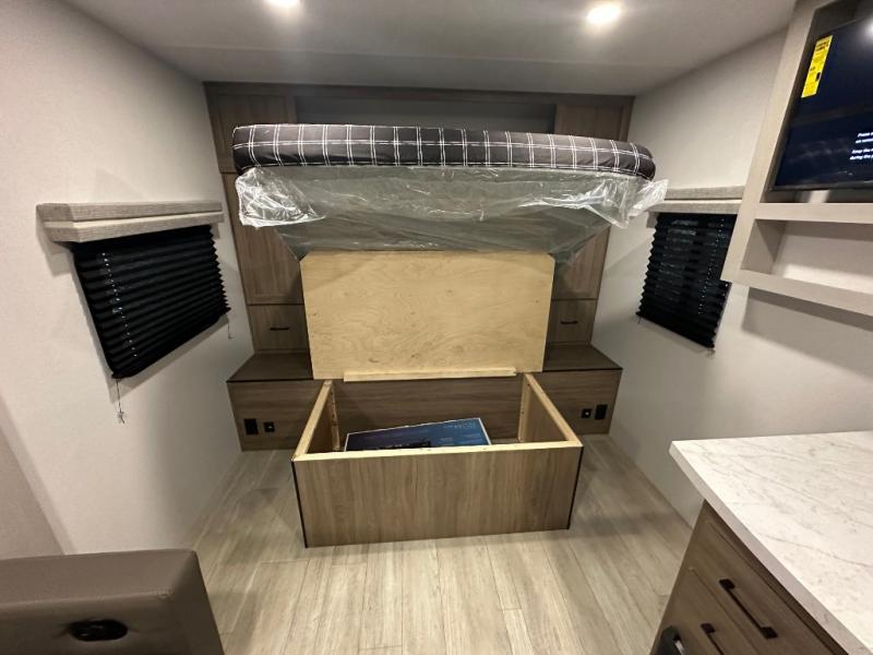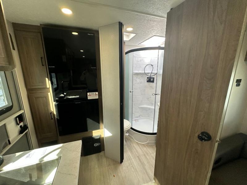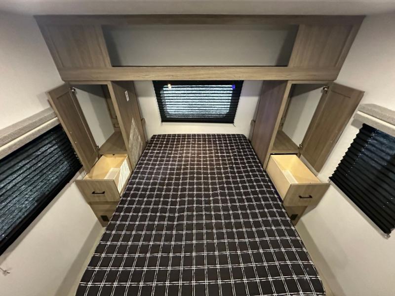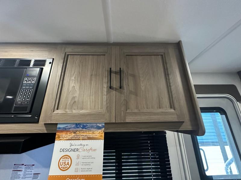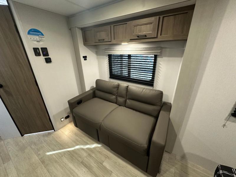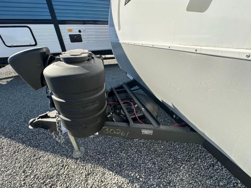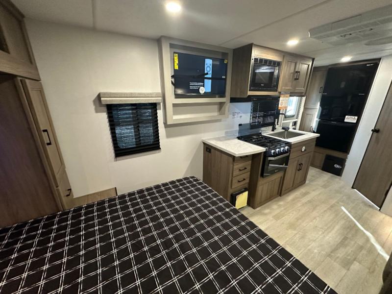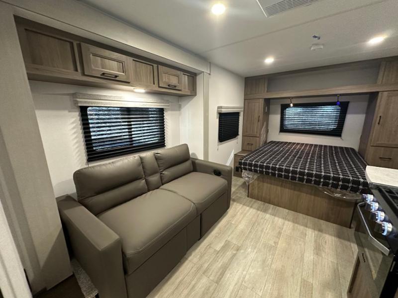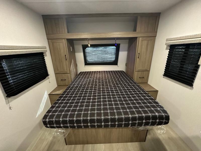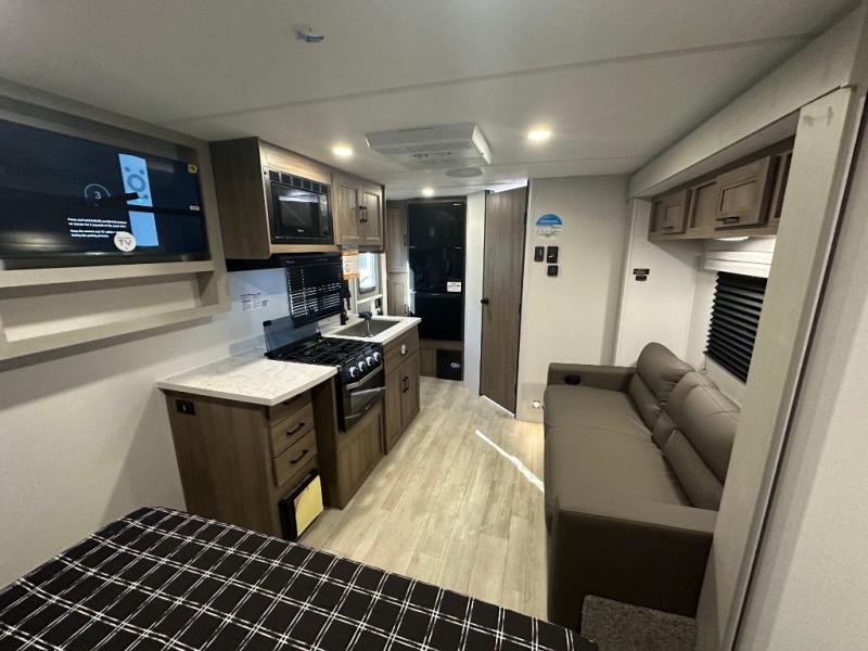 You'll love spending time at the campground in this single slide out travel trailer! The 60" x 80" front queen bed includes vaulted underbed storage to keep your luggage or extra blankets out of the way, plus there are dual bedside wardrobes for your clothes. A sofa with a free-standing table will provide a place to relax and dine, and the full kitchen includes a dual-burner cooktop and microwave oven to cook meals each day. This unit also features a rear corner bath with a 32" radius shower, a toilet, sink, and bath linen closet for clean towels!