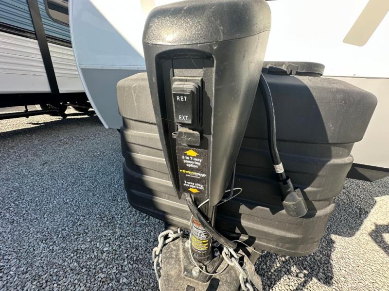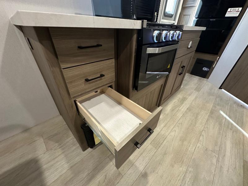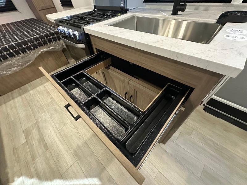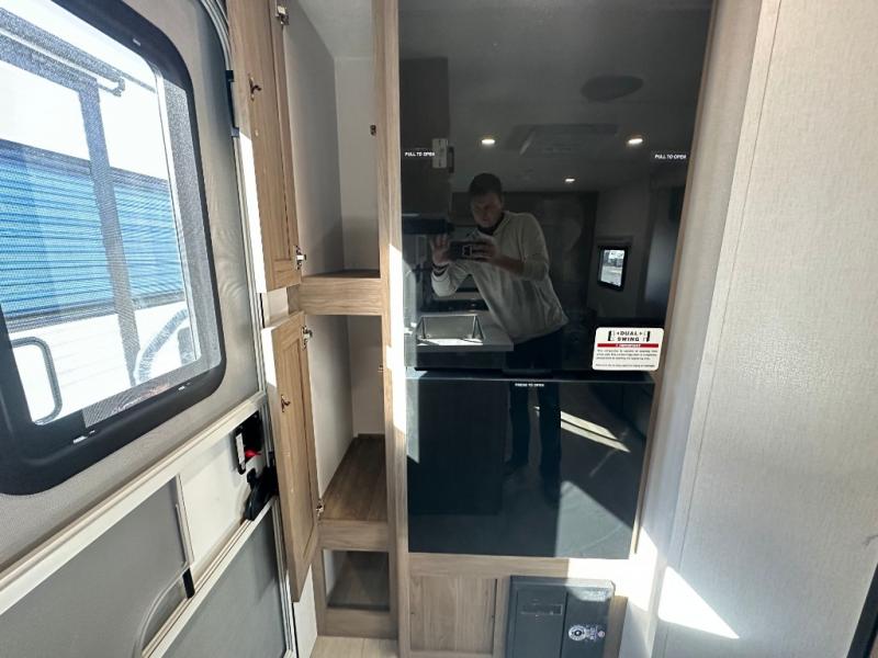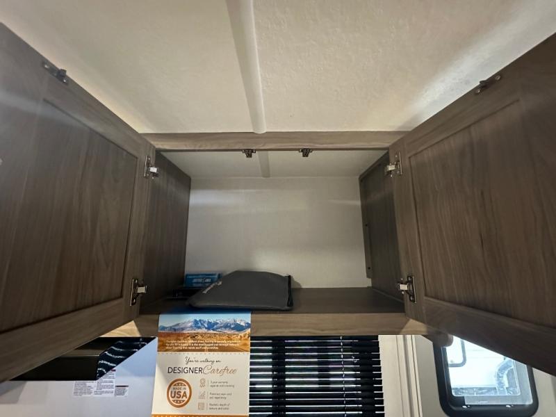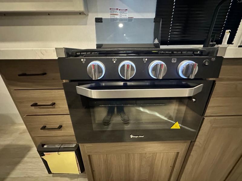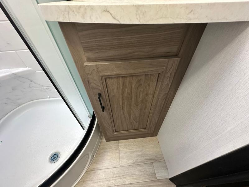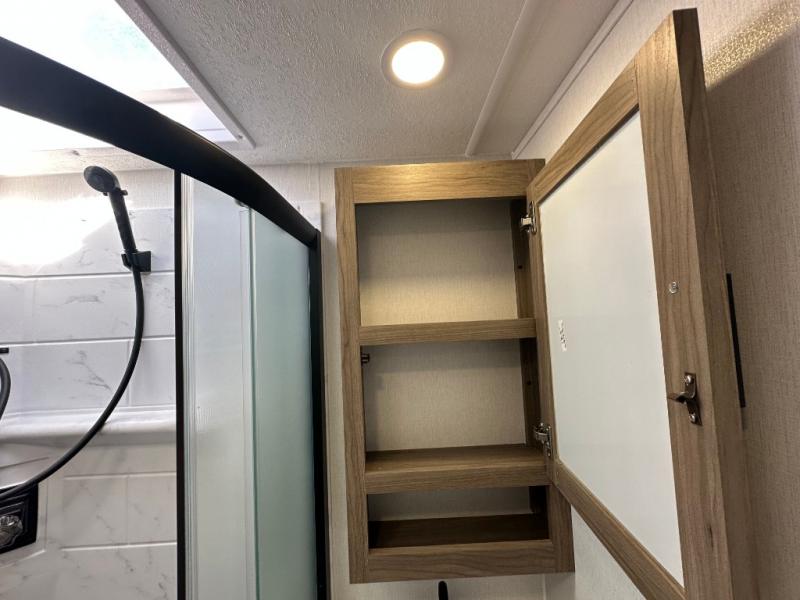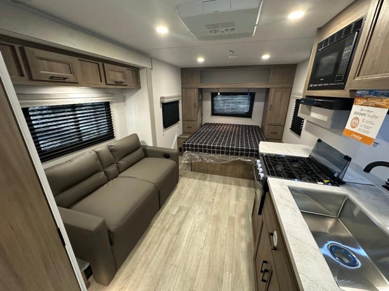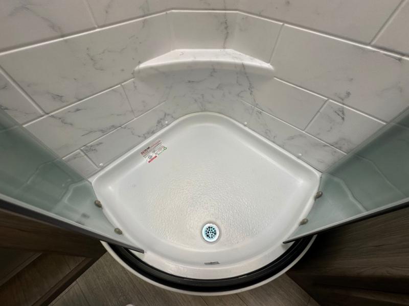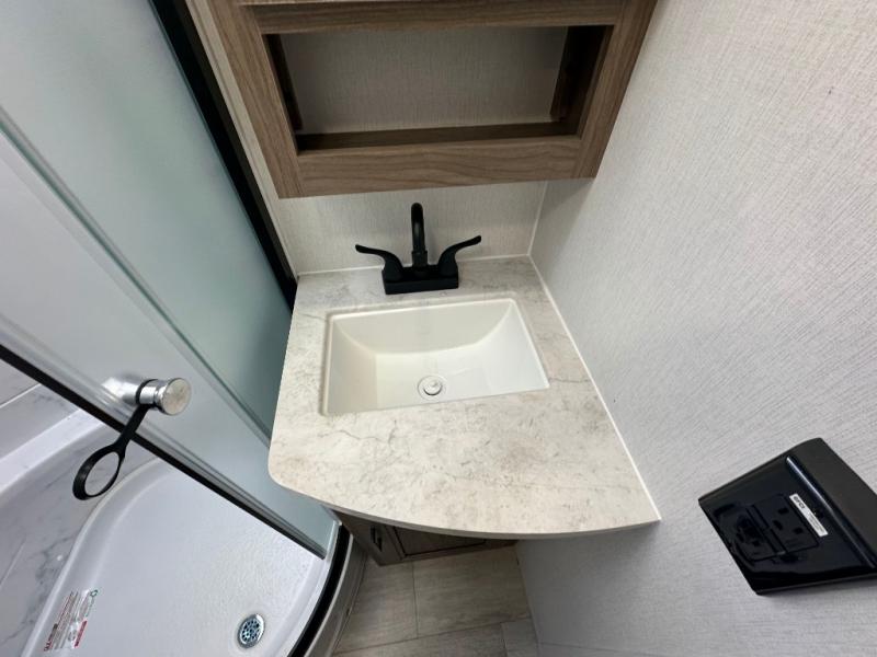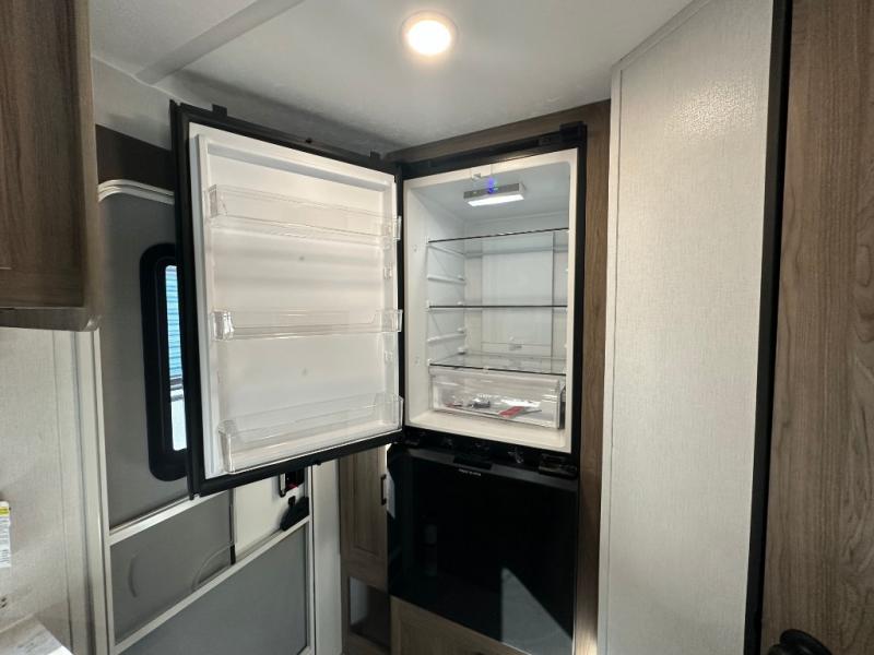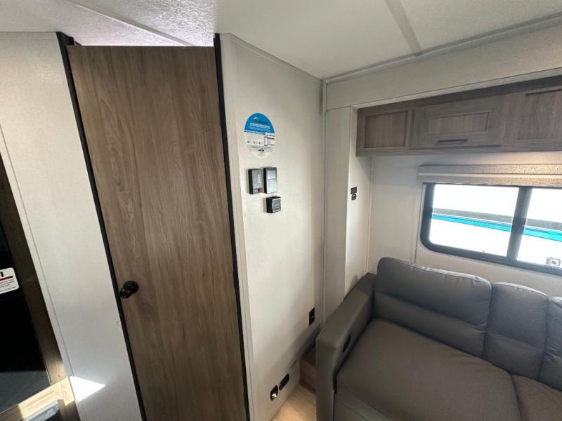 You'll love spending time at the campground in this single slide out travel trailer! The 60" x 80" front queen bed includes vaulted underbed storage to keep your luggage or extra blankets out of the way, plus there are dual bedside wardrobes for your clothes. A sofa with a free-standing table will provide a place to relax and dine, and the full kitchen includes a dual-burner cooktop and microwave oven to cook meals each day. This unit also features a rear corner bath with a 32" radius shower, a toilet, sink, and bath linen closet for clean towels!