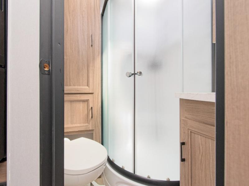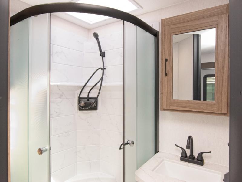 The rear corner bath offers a 32" radius shower, toilet, sink, and a linen closet for towels and toiletries—everything you need for a refreshing start to your day.