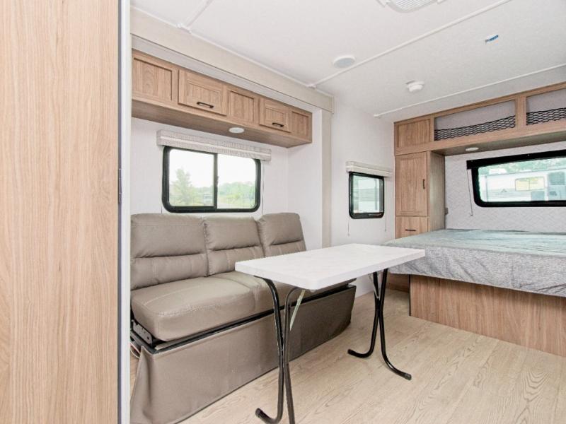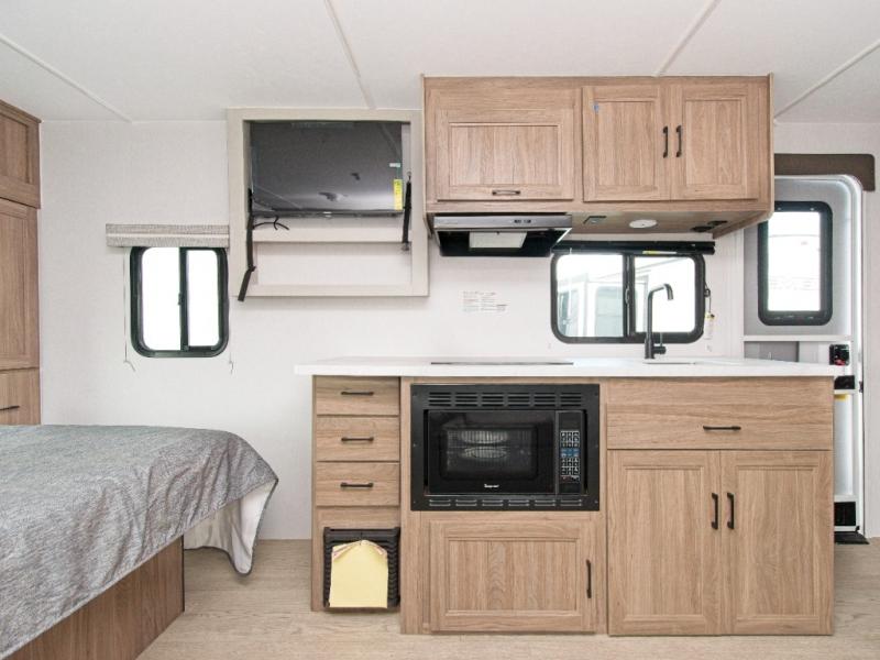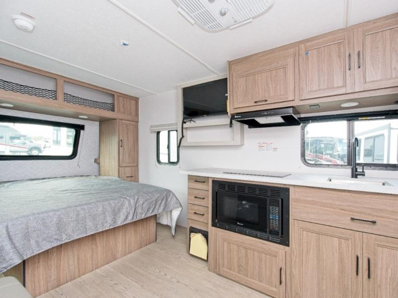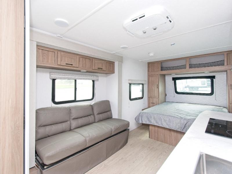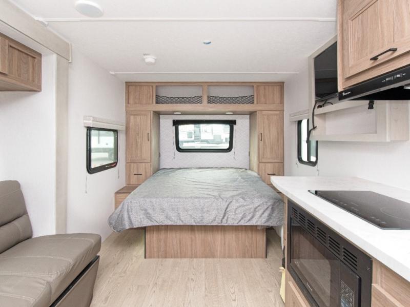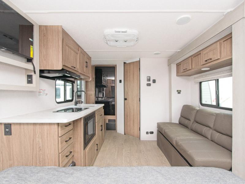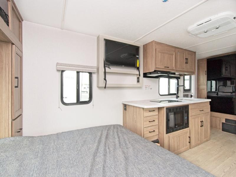 At the front, you'll find a 60" x 80" queen bed with vaulted underbed storage and dual wardrobes—ideal for keeping your essentials organized. The sofa slide-out with a free-standing table creates a cozy space for dining or relaxing, while the fully equipped kitchen includes a dual-burner cooktop, microwave, and ample counter space.