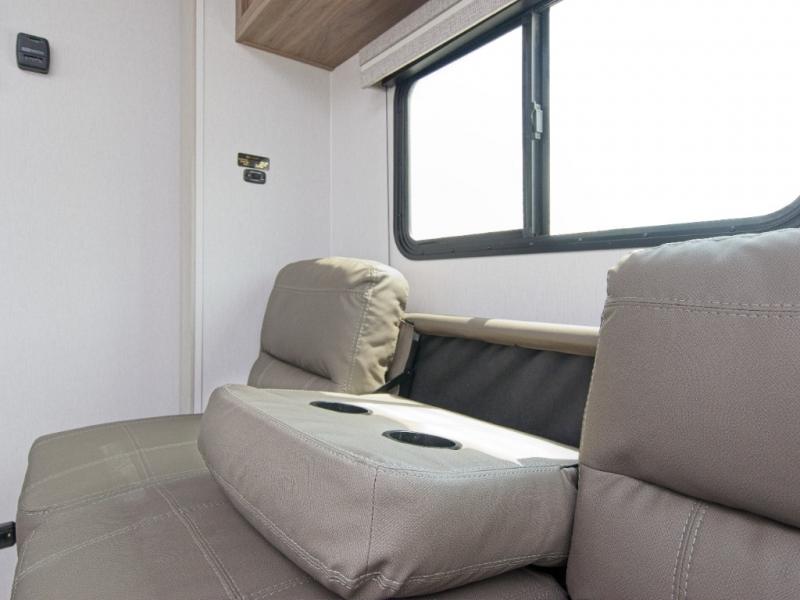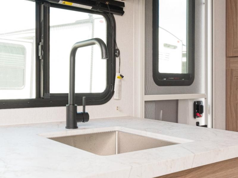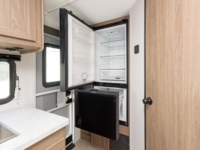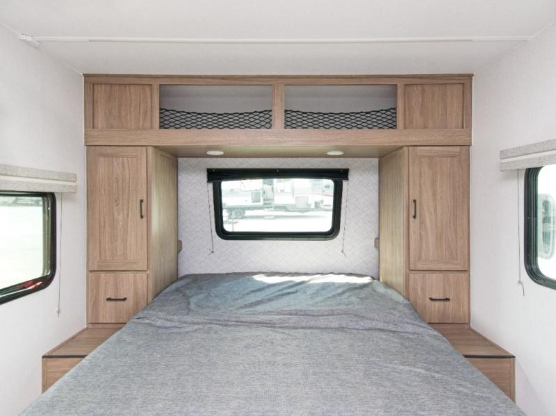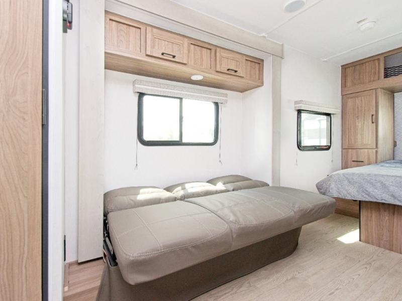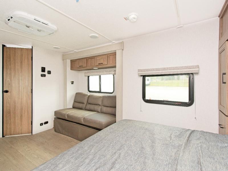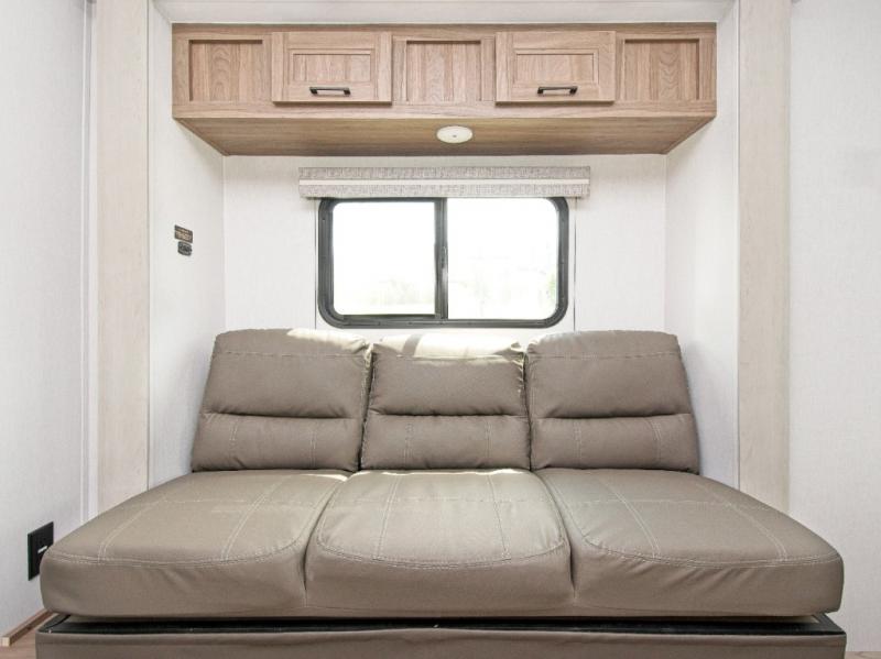 At the front, you'll find a 60" x 80" queen bed with vaulted underbed storage and dual wardrobes—ideal for keeping your essentials organized. The sofa slide-out with a free-standing table creates a cozy space for dining or relaxing, while the fully equipped kitchen includes a dual-burner cooktop, microwave, and ample counter space.