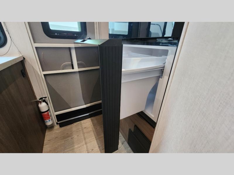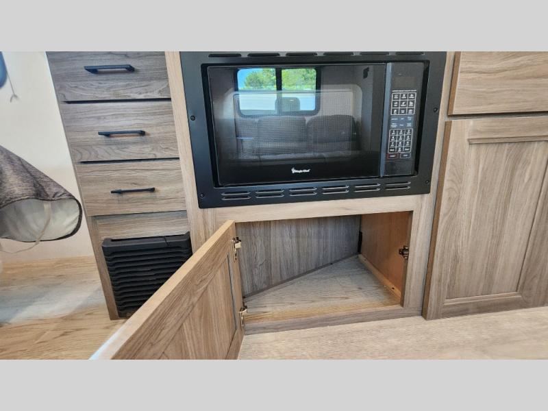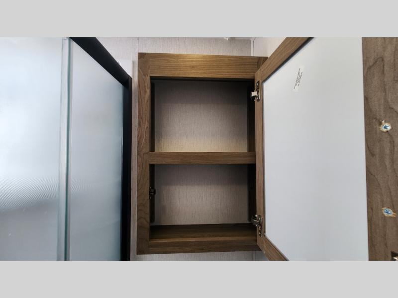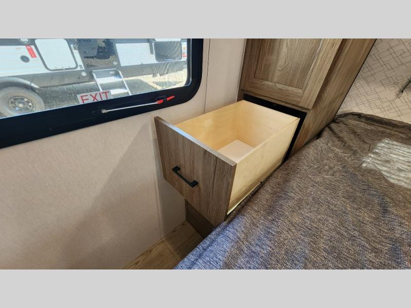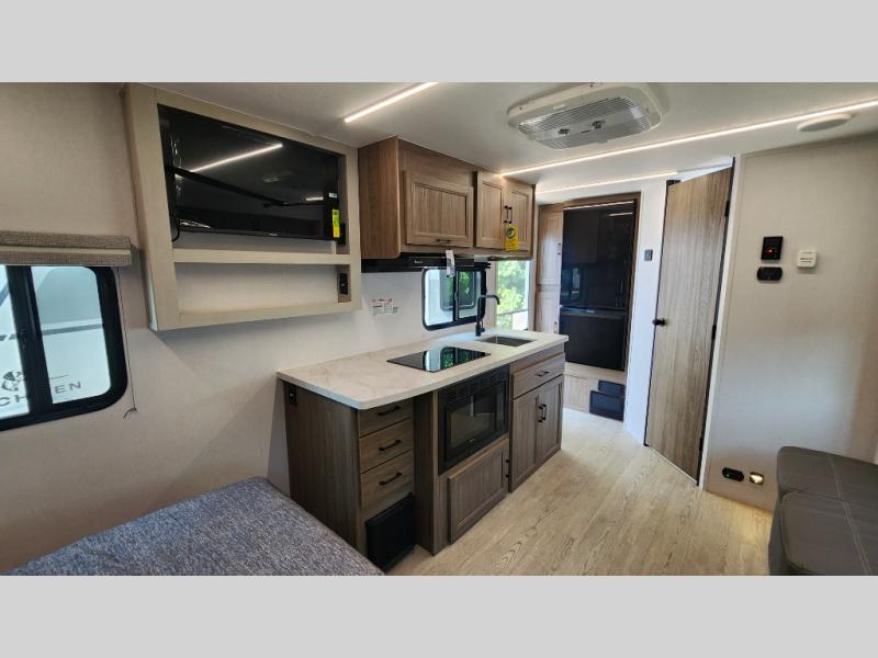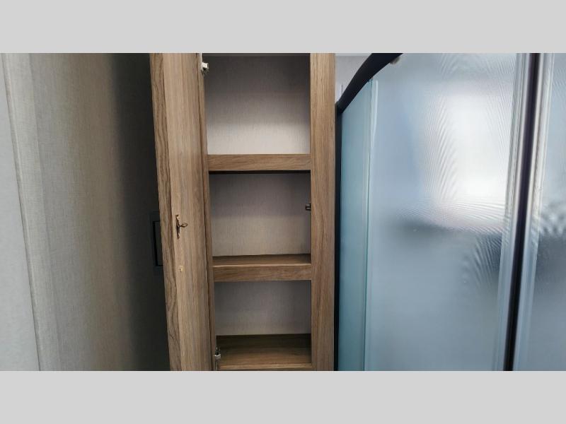 Thoughtful floorplan with a walk-around queen bed, full bathroom, and plenty of storage — all without a slide-out! -