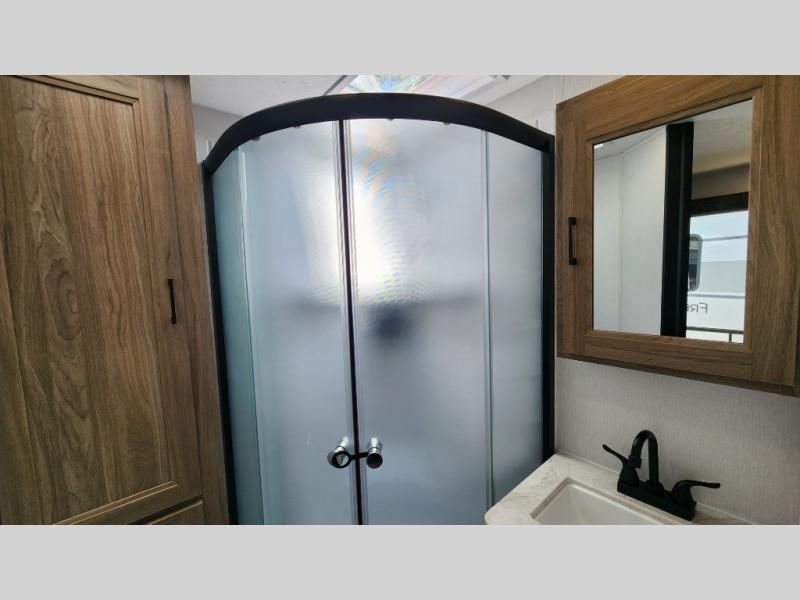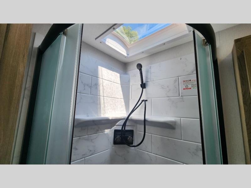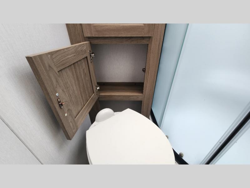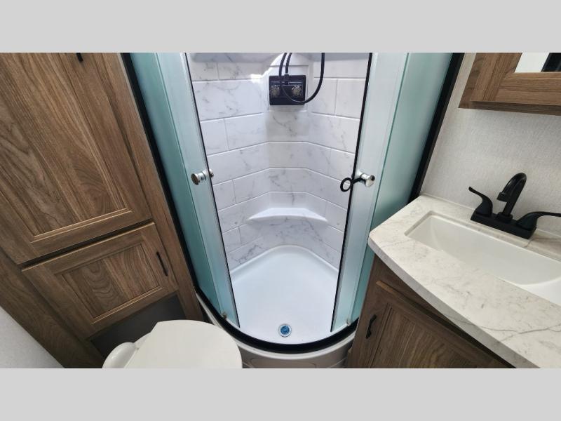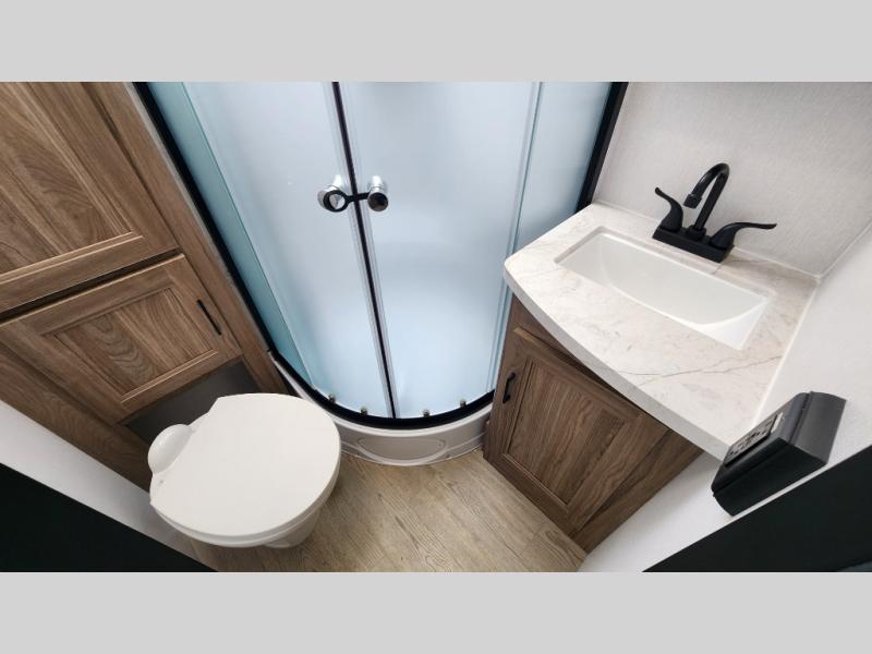 Private bath with foot-flush toilet, stand-up shower, and vanity — a must-have for any self-contained camping trip. -