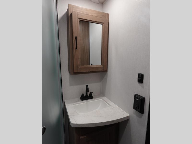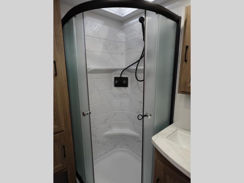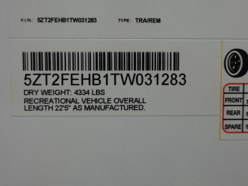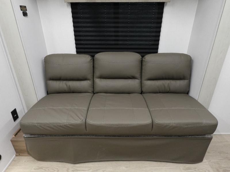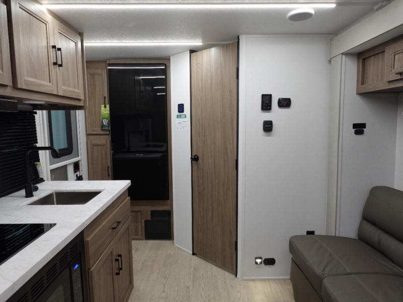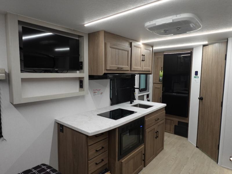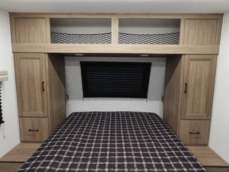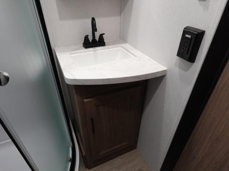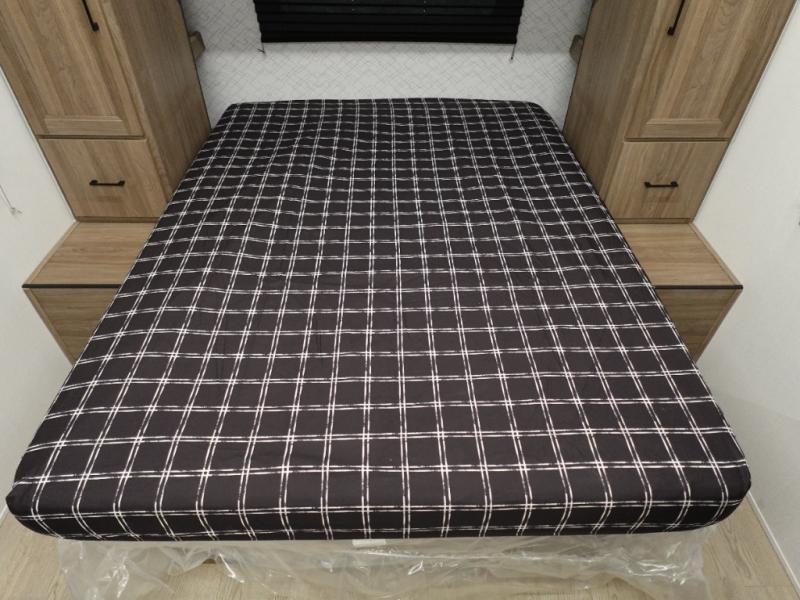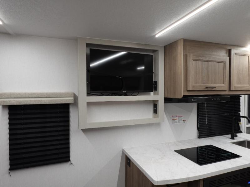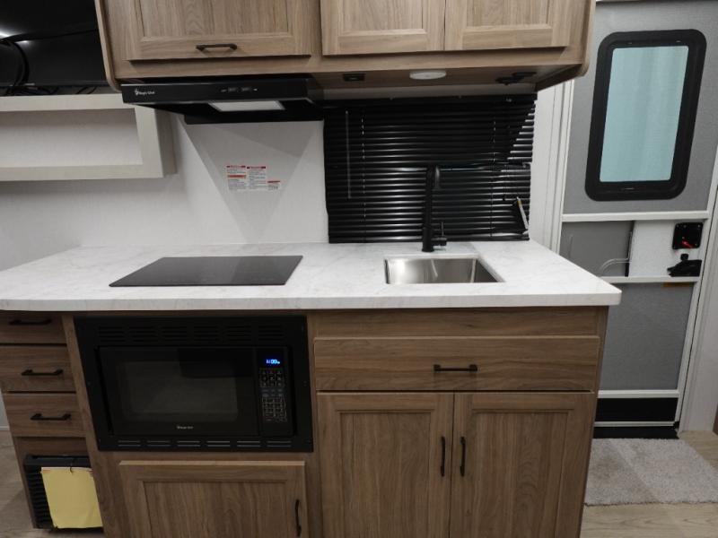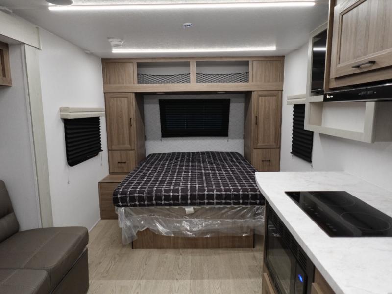 You'll love spending time at the campground in this single slide out travel trailer! The 60" x 80" front queen bed includes vaulted underbed storage to keep your luggage or extra blankets out of the way, plus there are dual bedside wardrobes for your clothes. A sofa with a free-standing table will provide a place to relax and dine, and the full kitchen includes a dual-burner cooktop and microwave to cook meals each day. This unit also features a rear corner bath with a 32" radius shower, a toilet, sink, and bath linen closet for clean towels!