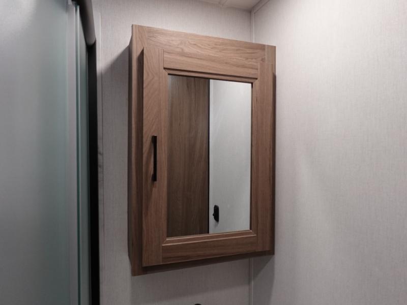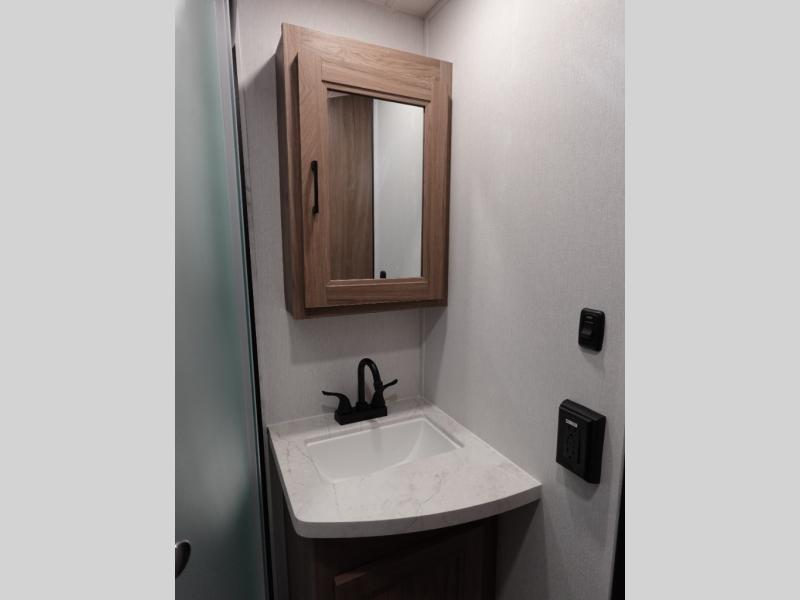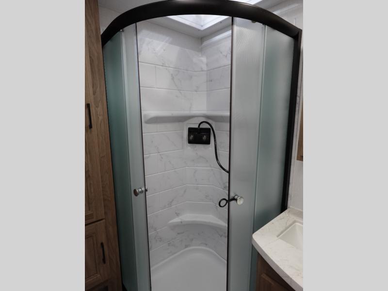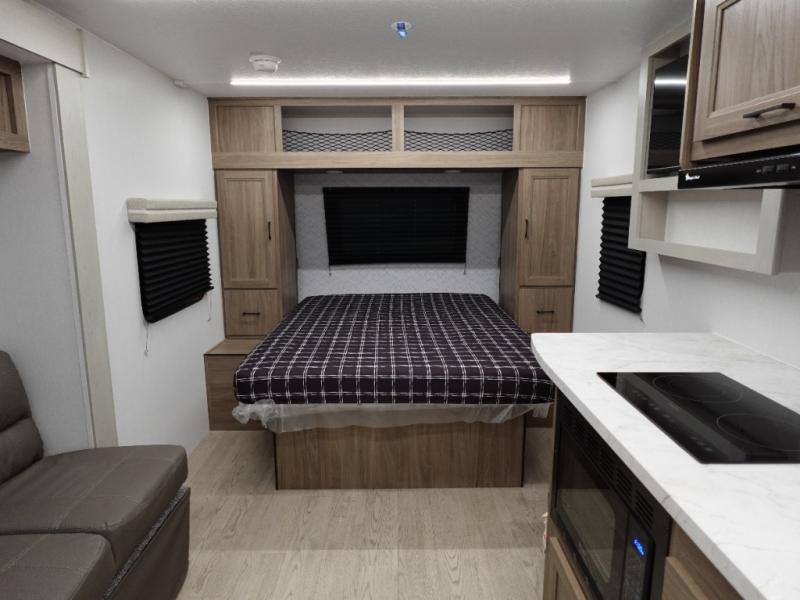 You'll love spending time at the campground in this single slide out travel trailer! The 60" x 80" front queen bed includes vaulted underbed storage to keep your luggage or extra blankets out of the way, plus there are dual bedside wardrobes for your clothes. A sofa with a free-standing table will provide a place to relax and dine, and the full kitchen includes a dual-burner cooktop and microwave to cook meals each day. This unit also features a rear corner bath with a 32" radius shower, a toilet, sink, and bath linen closet for clean towels!