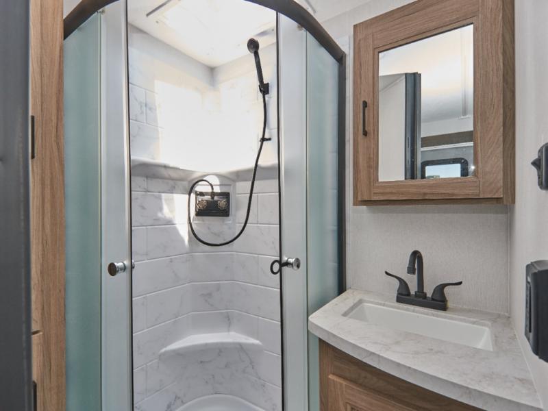 Step inside and you’ll find a bright, inviting interior with all the essentials to make your travels enjoyable. The modern kitchen is equipped with a two-burner cooktop, refrigerator, microwave, and plenty of storage, so you can prepare your favorite meals no matter where you roam. After a long day of exploring, relax in the cozy dinette that easily converts into extra sleeping space or unwind in the private queen bed area designed for restful nights.