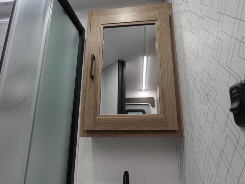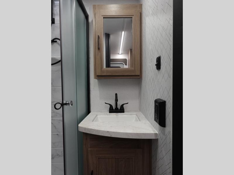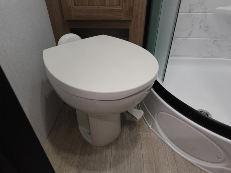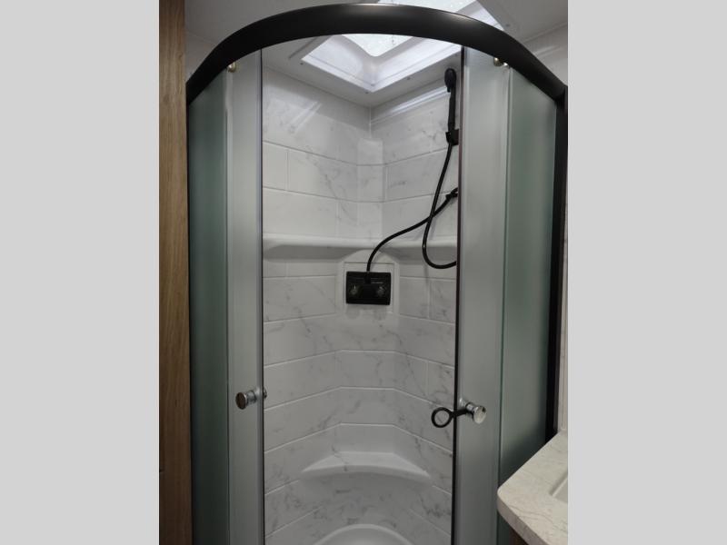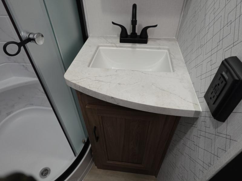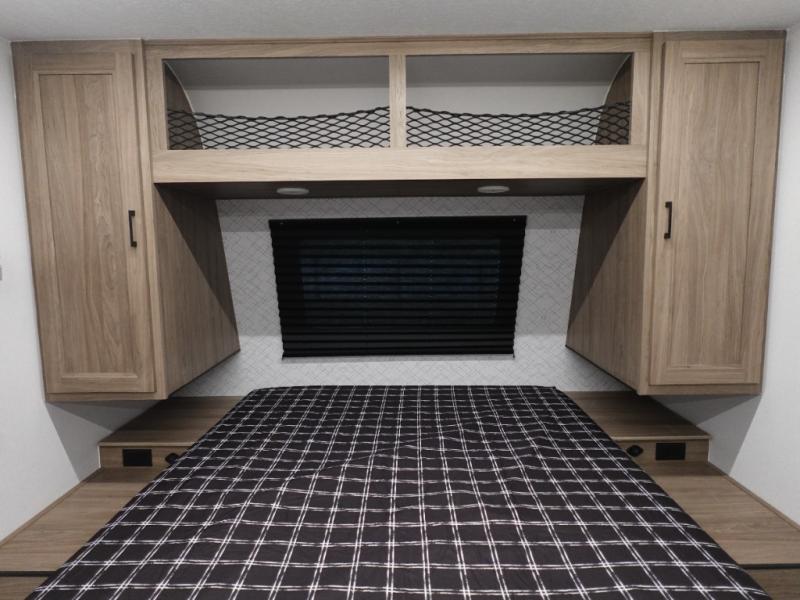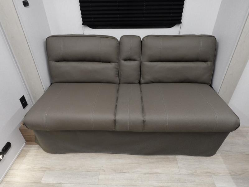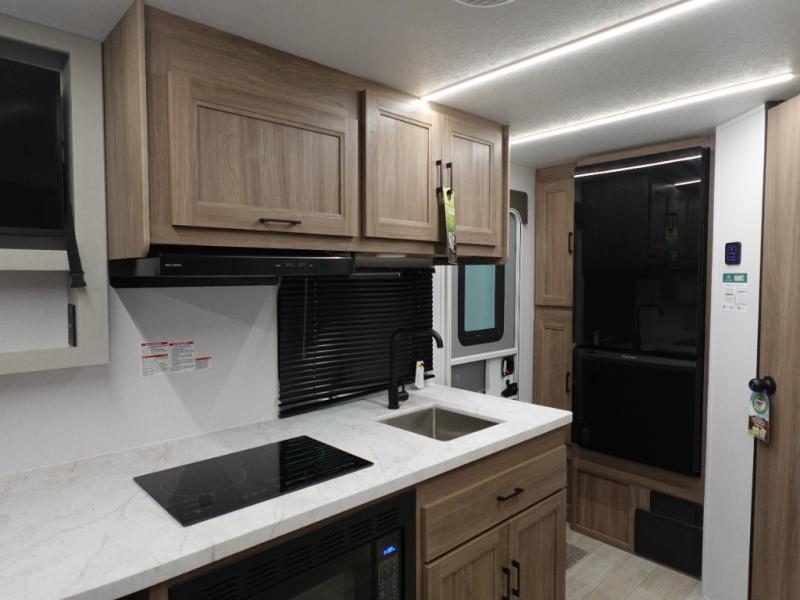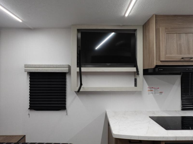 You'll love spending time at the campground in this single slide out travel trailer! The 60" x 80" front queen bed includes vaulted underbed storage to keep your luggage or extra blankets out of the way, plus there are dual bedside wardrobes for your clothes. A sofa with a free-standing table will provide a place to relax and dine, and the full kitchen includes a dual-burner cooktop and microwave to cook meals each day. This unit also features a rear corner bath with a 32" radius shower, a toilet, sink, and bath linen closet for clean towels!