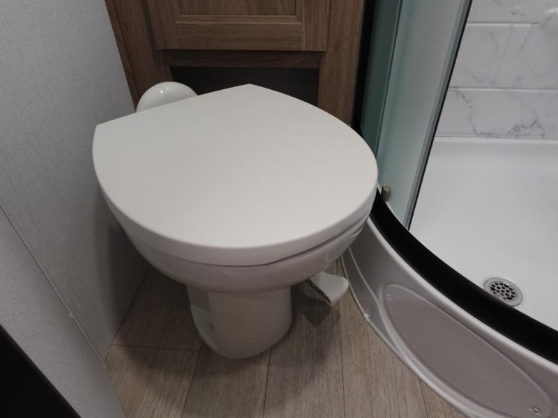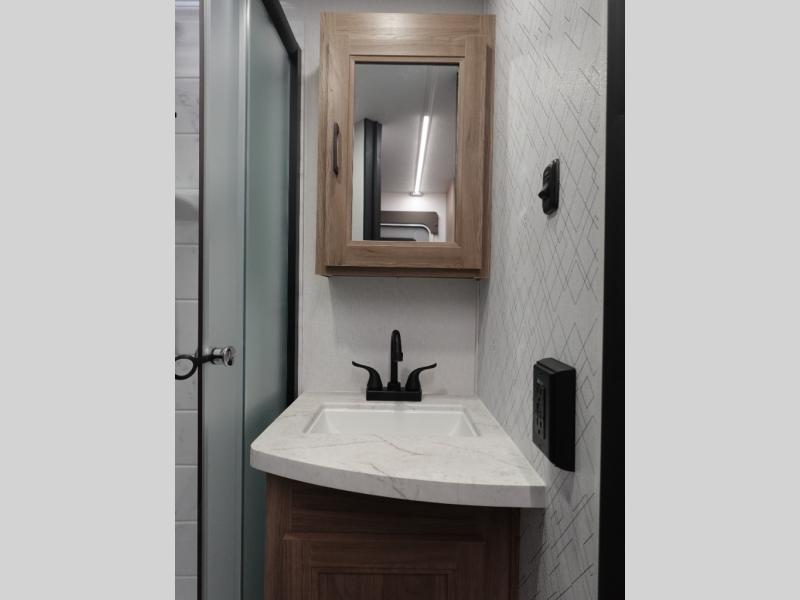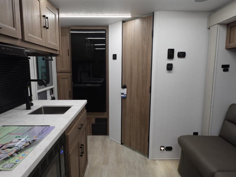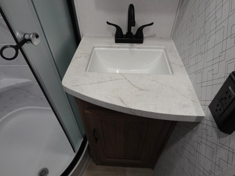 You'll love spending time at the campground in this single slide out travel trailer! The 60" x 80" front queen bed includes vaulted underbed storage to keep your luggage or extra blankets out of the way, plus there are dual bedside wardrobes for your clothes. A sofa with a free-standing table will provide a place to relax and dine, and the full kitchen includes a dual-burner cooktop and microwave to cook meals each day. This unit also features a rear corner bath with a 32" radius shower, a toilet, sink, and bath linen closet for clean towels!