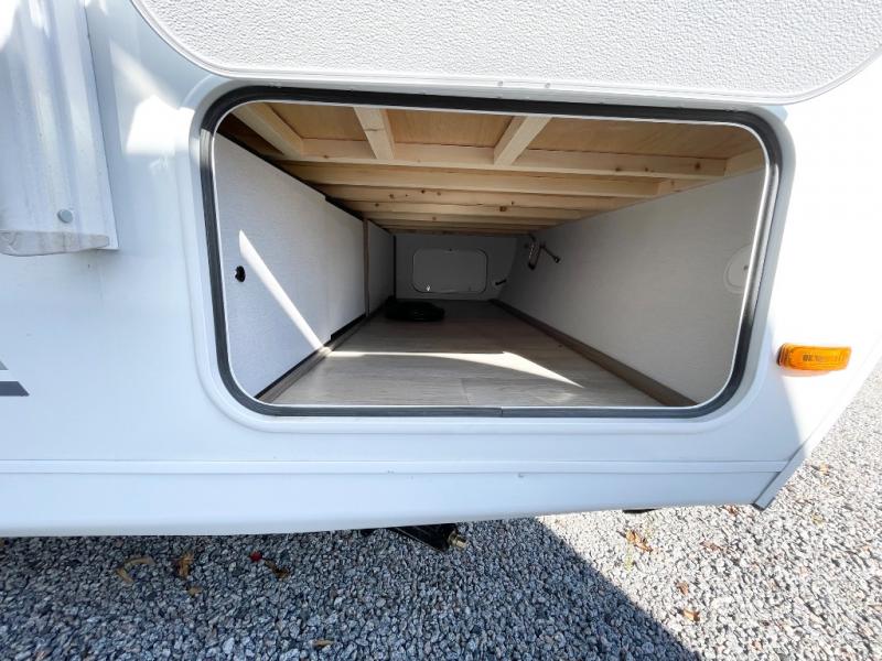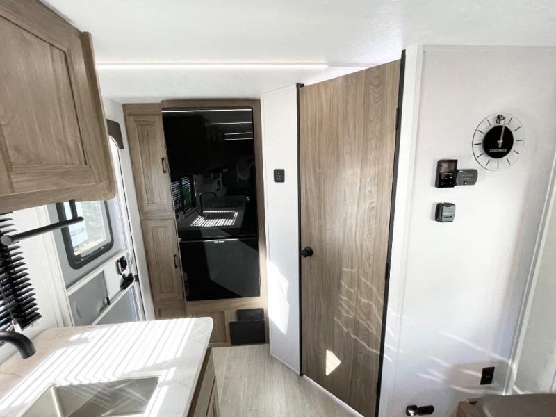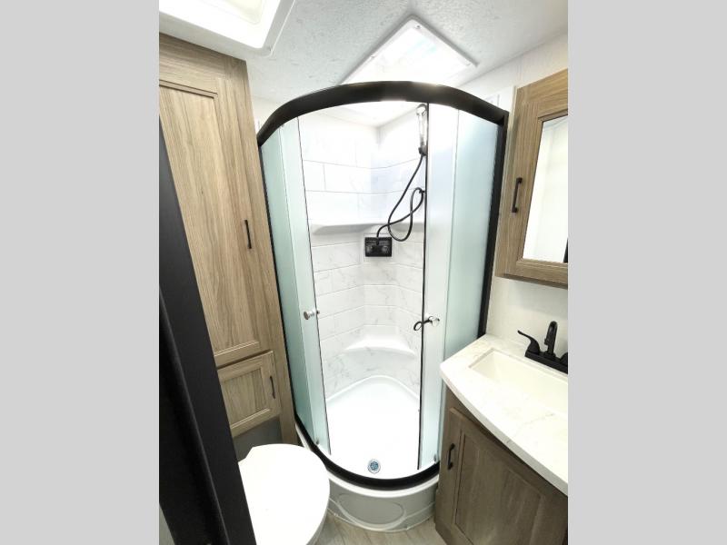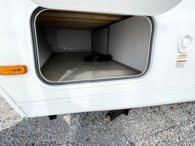You'll love spending time at the campground in this single slide out travel trailer! The 60" x 80" front queen bed includes vaulted underbed storage to keep your luggage or extra blankets out of the way, plus there are dual bedside wardrobes for your clothes. A sofa with a free-standing table will provide a place to relax and dine, and the full kitchen includes a dual-burner cooktop and microwave to cook meals each day. This unit also features a rear corner bath with a 32" radius shower, a toilet, sink, and bath linen closet for clean towels!