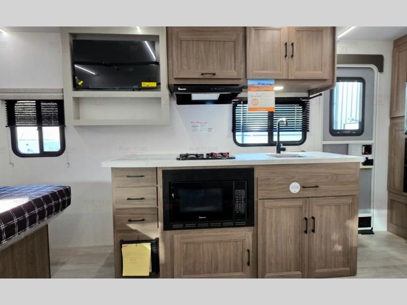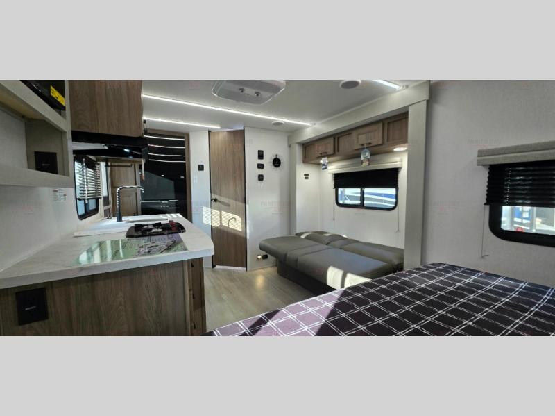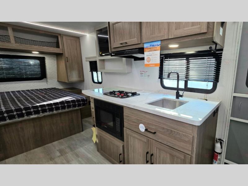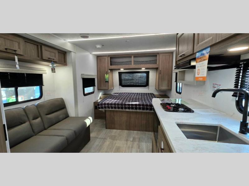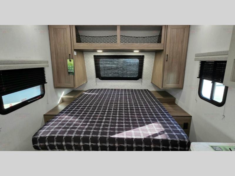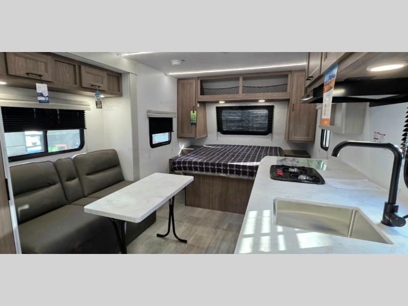 You'll love spending time at the campground in this single slide out travel trailer! The 60" x 80" front queen bed includes vaulted underbed storage to keep your luggage or extra blankets out of the way, plus there are dual bedside wardrobes for your clothes. A sofa with a free-standing table will provide a place to relax and dine, and the full kitchen includes a dual-burner cooktop and microwave to cook meals each day. This unit also features a rear corner bath with a 32" radius shower, a toilet, sink, and bath linen closet for clean towels!