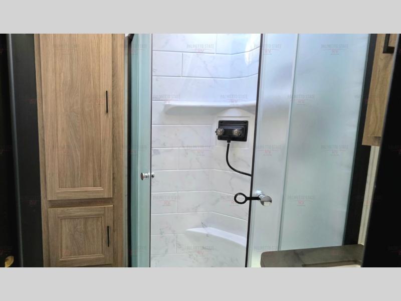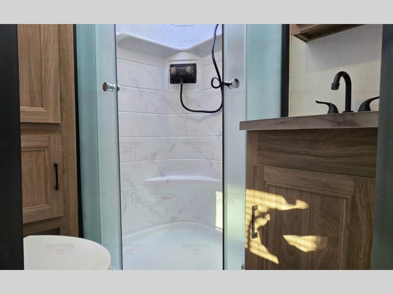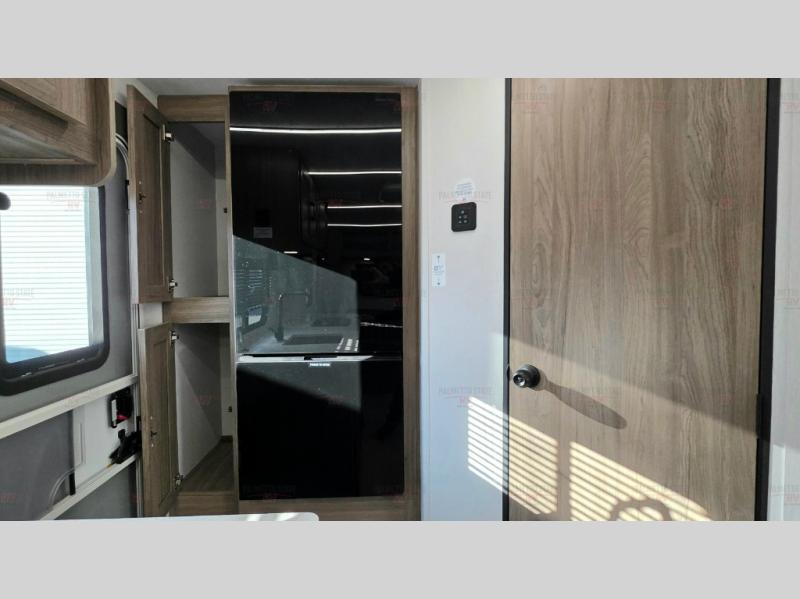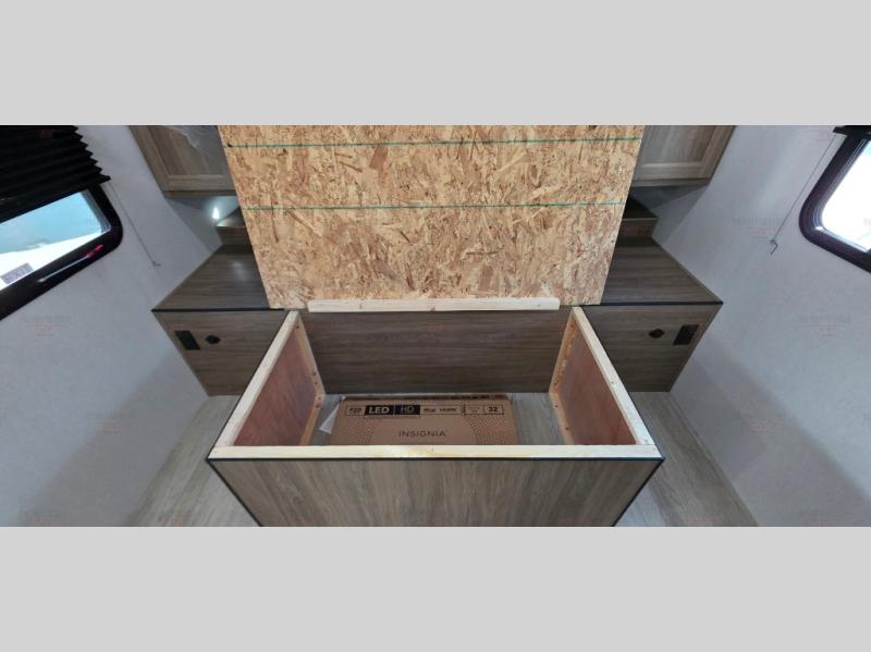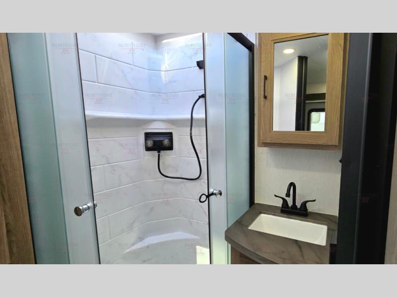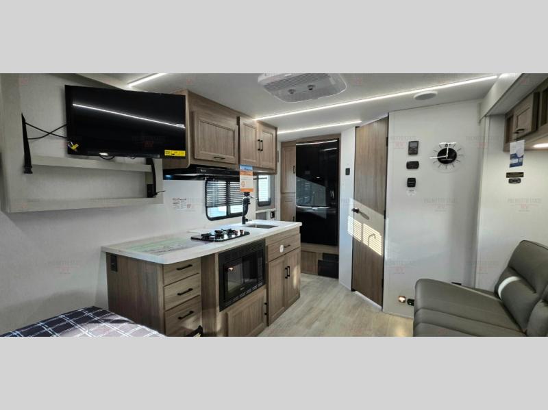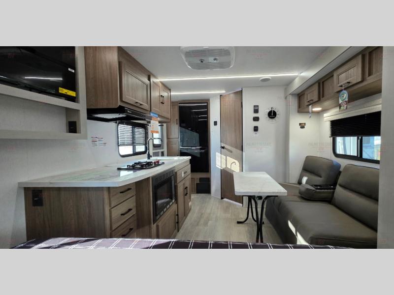 You'll love spending time at the campground in this single slide out travel trailer! The 60" x 80" front queen bed includes vaulted underbed storage to keep your luggage or extra blankets out of the way, plus there are dual bedside wardrobes for your clothes. A sofa with a free-standing table will provide a place to relax and dine, and the full kitchen includes a dual-burner cooktop and microwave to cook meals each day. This unit also features a rear corner bath with a 32" radius shower, a toilet, sink, and bath linen closet for clean towels!