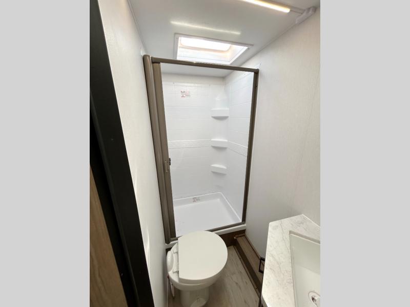 With any Freedom Express Select travel trailer by Coachmen you will find an alumicage construction and vacuum bonded walls with Azdel composite for a trailer made to last. These Select value models come standard with a Bluetooth interior speaker, night shades, and wear-resistant vinyl flooring throughout. You will appreciate the power tongue jack, as well as the Tufflex PVC roof and heated and enclosed underbelly to extend your camping season. A 15K BTU roof A/C will keep you comfortable, and the tankless water heater will provide endless hot showers!