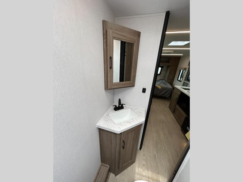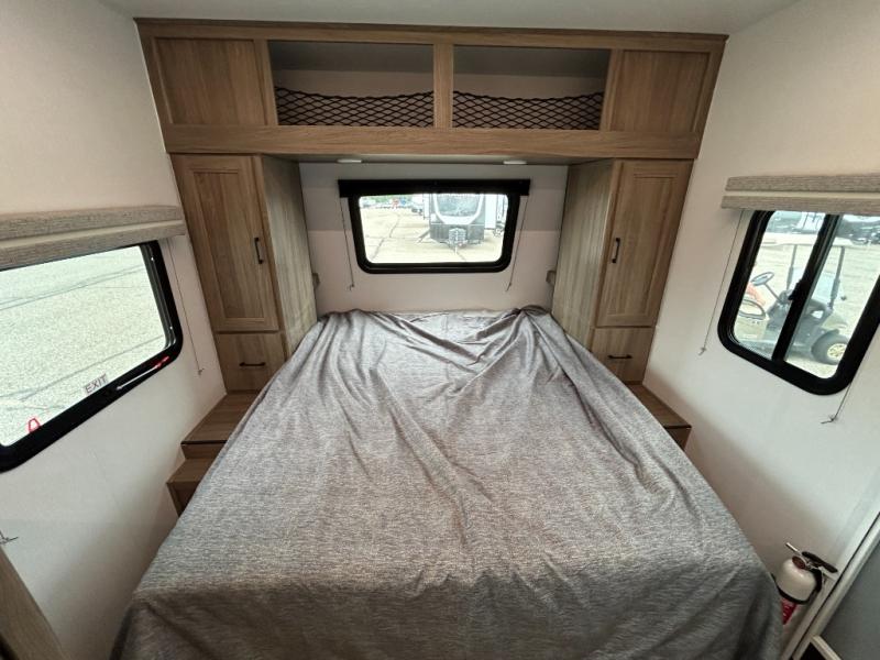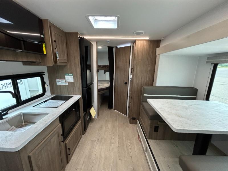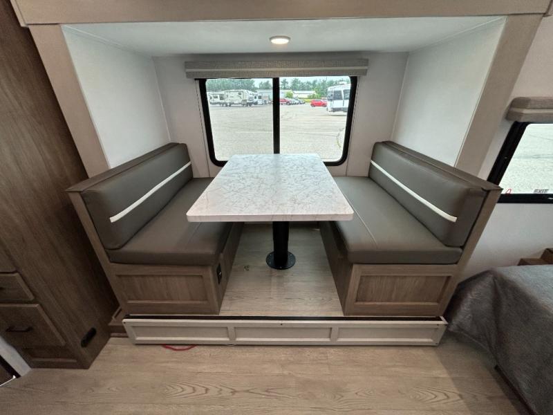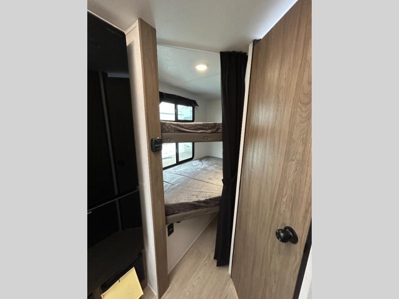 Camping with more friends and family is possible in this bunkhouse travel trailer! There is a double-size top bunk plus a double-size lower flip-up bunk for comfy sleeping space and additional storage space. You'll find your own bed up front with underbed storage and dual wardrobes to keep clothes wrinkle-free. Since there is a booth dinette slide out, you'll have additional interior space plus a place to dine, play games, and even let an extra guest sleep over. The full kitchen includes a dual burner cooktop and microwave oven to cook meals each day, along with a pantry and 12V refrigerator for food storage. And a full bath on board means you won't have to use the camp's facilities to freshen up each day; how convenient!