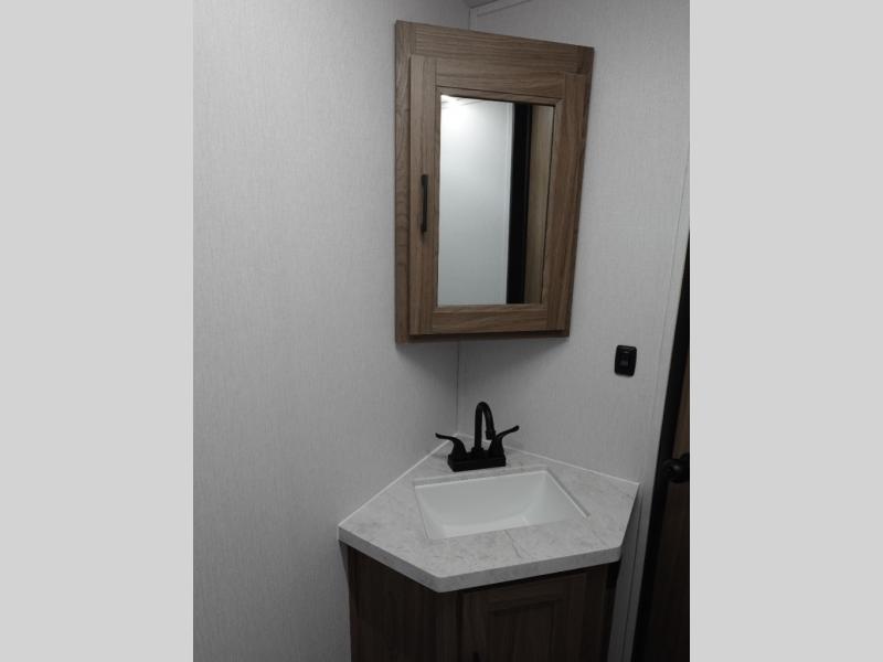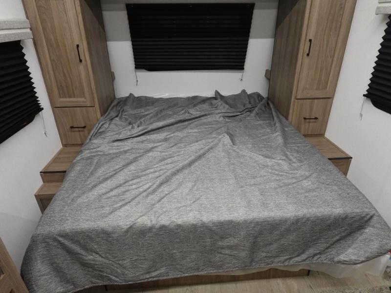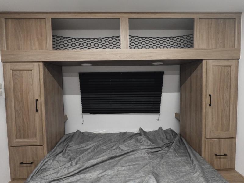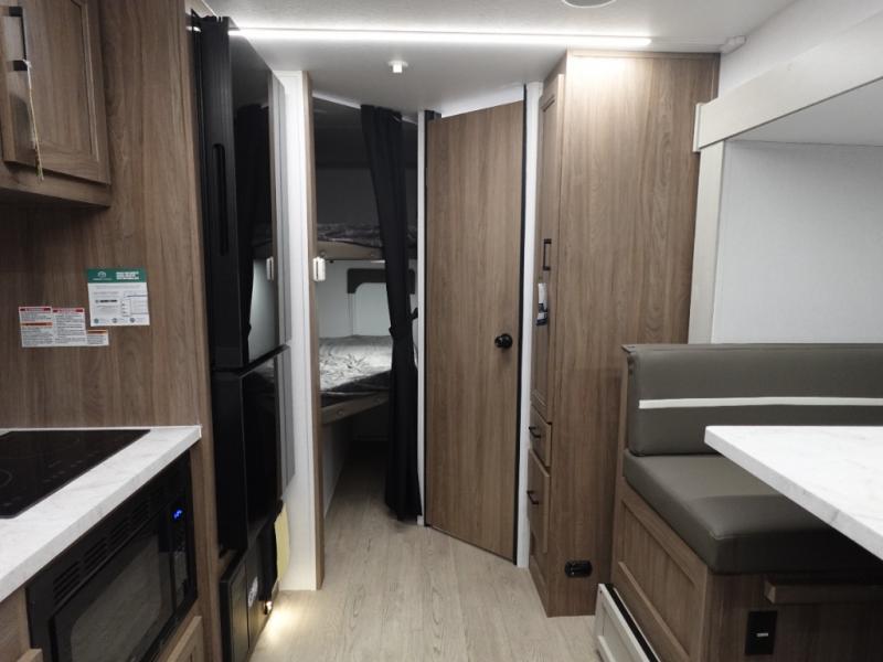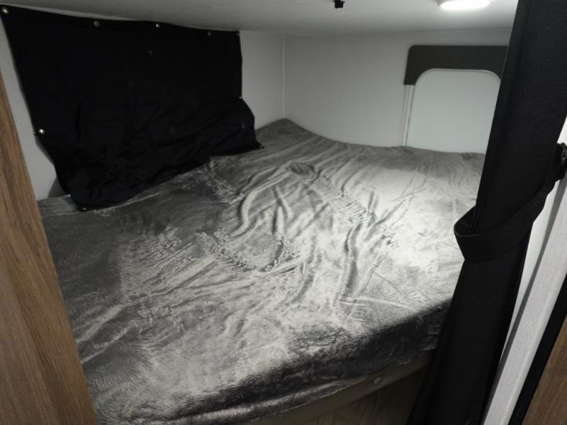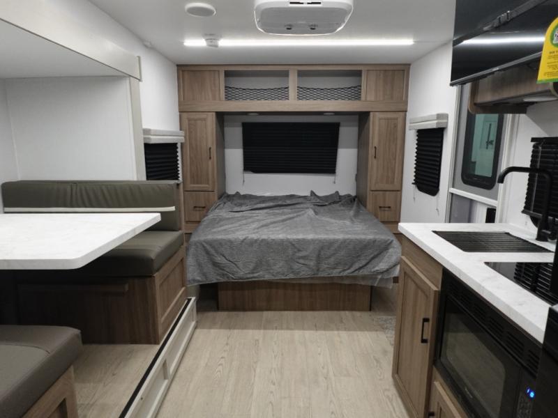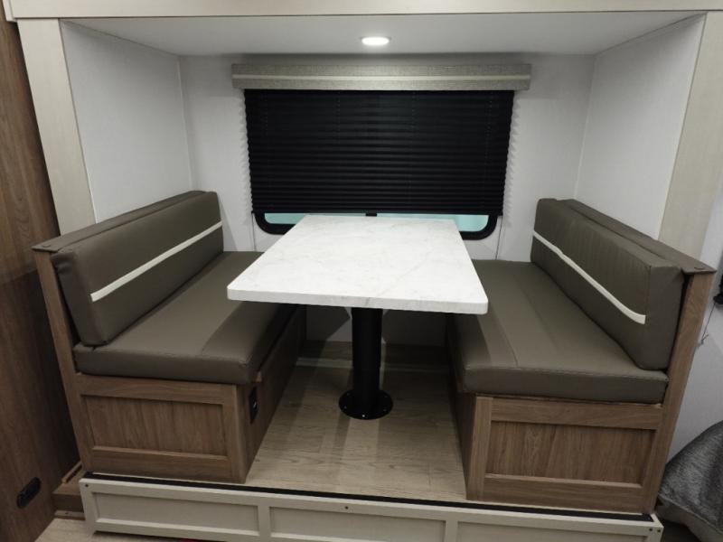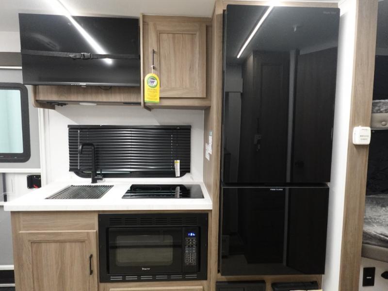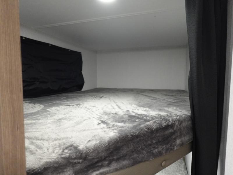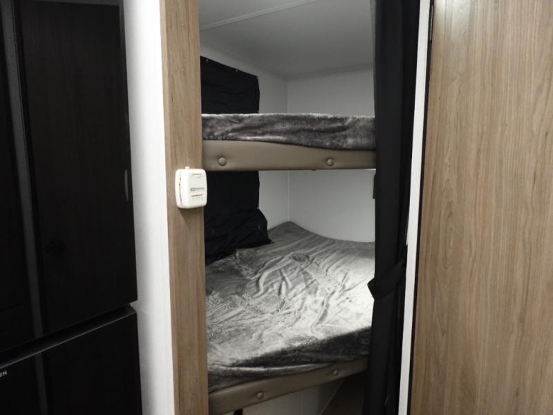 Camping with more friends and family is possible in this bunkhouse travel trailer! There is a double-size top bunk plus a double-size lower flip-up bunk for comfy sleeping space and additional storage space. You'll find your own bed up front with underbed storage and dual wardrobes to keep clothes wrinkle-free. Since there is a booth dinette slide out, you'll have additional interior space plus a place to dine, play games, and even let an extra guest sleep over. The full kitchen includes a dual burner cooktop and microwave oven to cook meals each day, along with a pantry and 12V refrigerator for food storage. And a full bath on board means you won't have to use the camp's facilities to freshen up each day; how convenient!