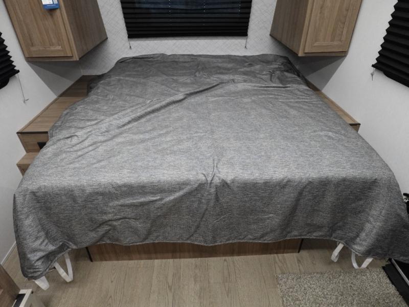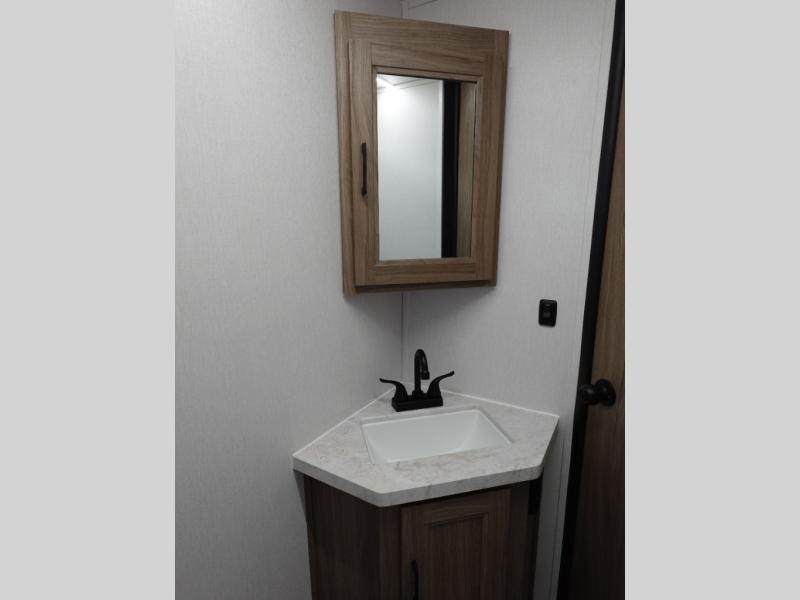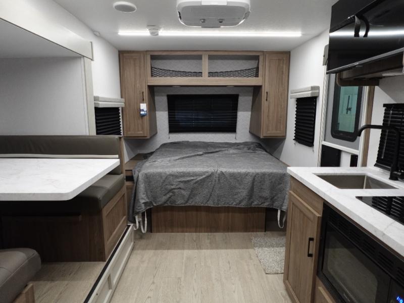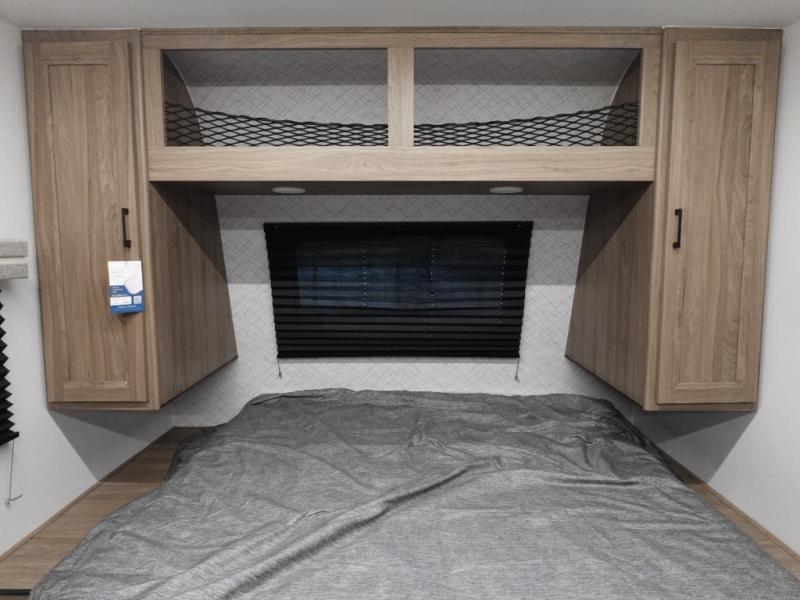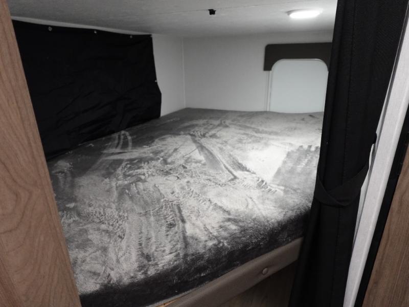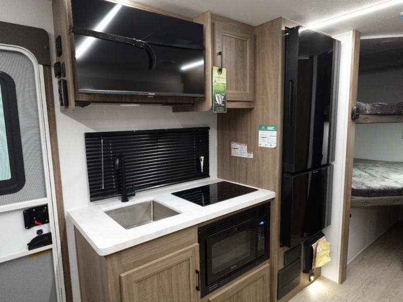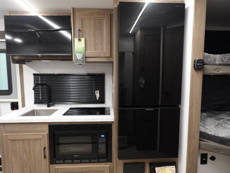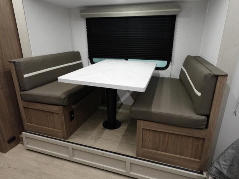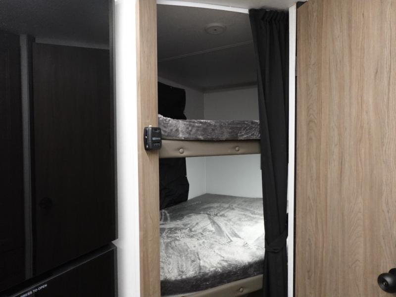 Camping with more friends and family is possible in this bunkhouse travel trailer! There is a double-size top bunk plus a double-size lower flip-up bunk for comfy sleeping space and additional storage space. You'll find your own bed up front with underbed storage and dual wardrobes to keep clothes wrinkle-free. Since there is a booth dinette slide out, you'll have additional interior space plus a place to dine, play games, and even let an extra guest sleep over. The full kitchen includes a dual burner cooktop and microwave oven to cook meals each day, along with a pantry and 12V refrigerator for food storage. And a full bath on board means you won't have to use the camp's facilities to freshen up each day; how convenient!