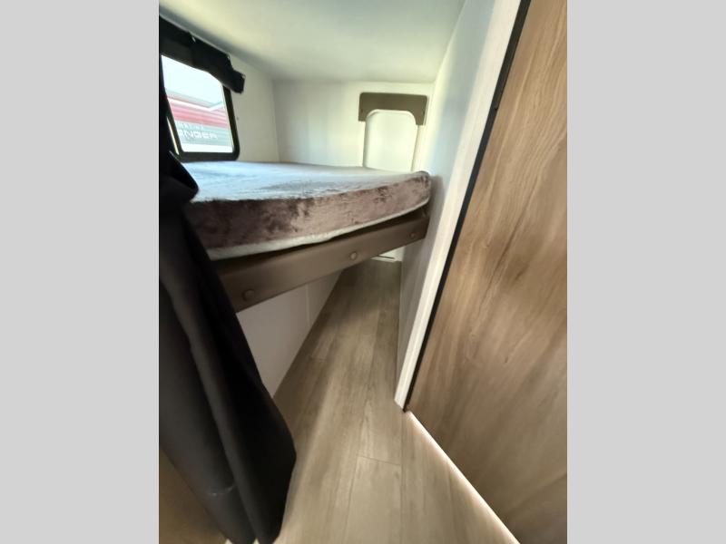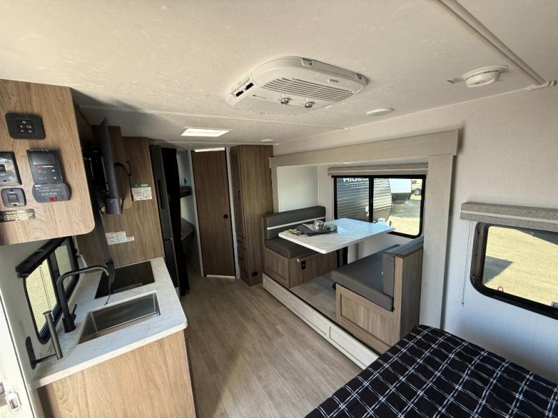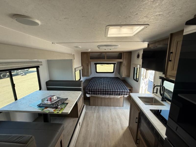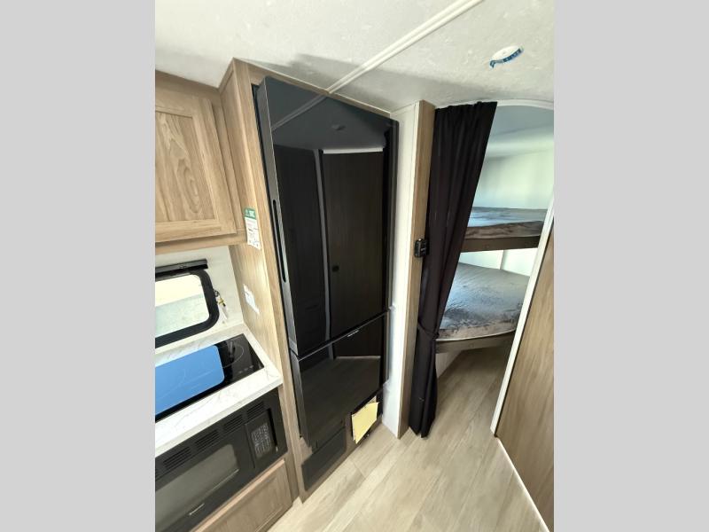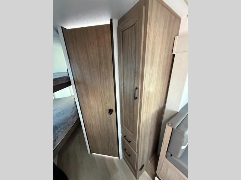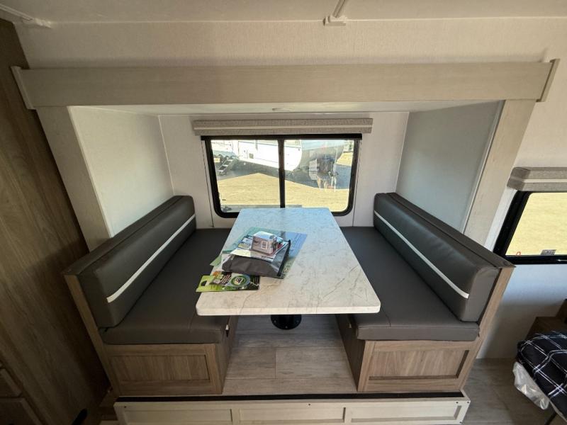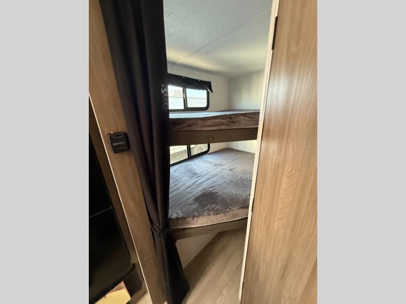 Camping with more friends and family is possible in this bunkhouse travel trailer! There is a double-size top bunk plus a double-size lower flip-up bunk for comfy sleeping space and additional storage space. You'll find your own bed up front with underbed storage and dual wardrobes to keep clothes wrinkle-free. Since there is a booth dinette slide out, you'll have additional interior space plus a place to dine, play games, and even let an extra guest sleep over. The full kitchen includes a dual burner cooktop and microwave oven to cook meals each day, along with a pantry and 12V refrigerator for food storage. And a full bath on board means you won't have to use the camp's facilities to freshen up each day; how convenient!