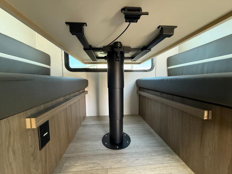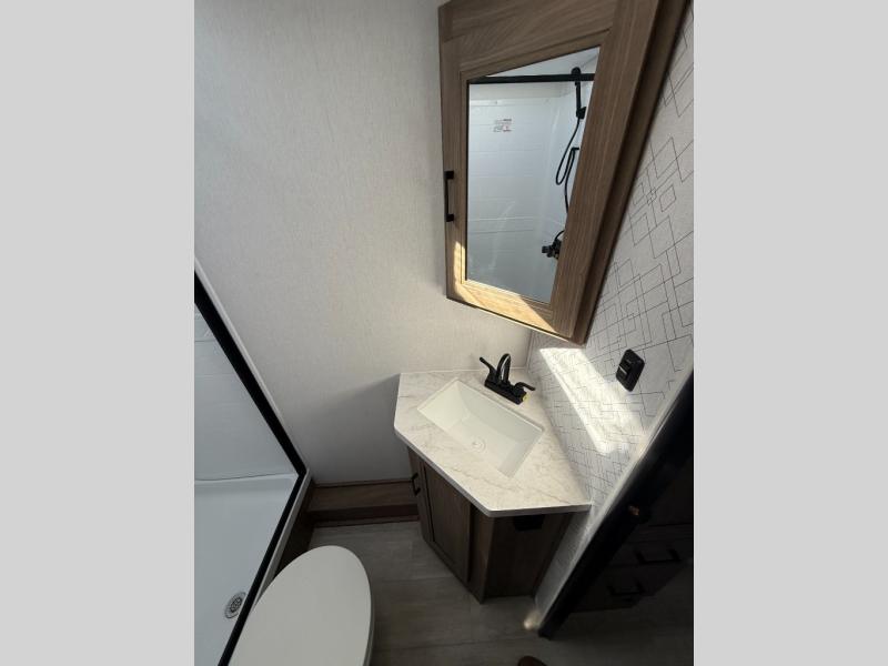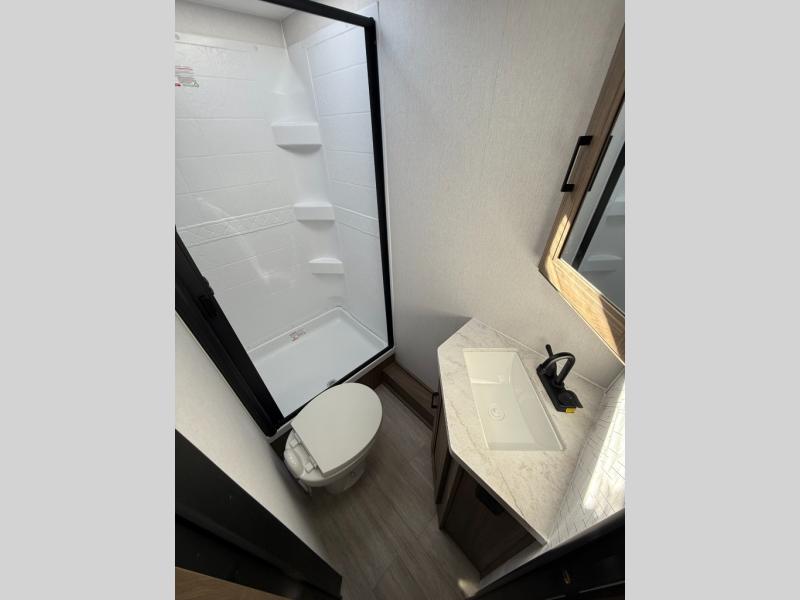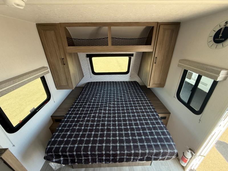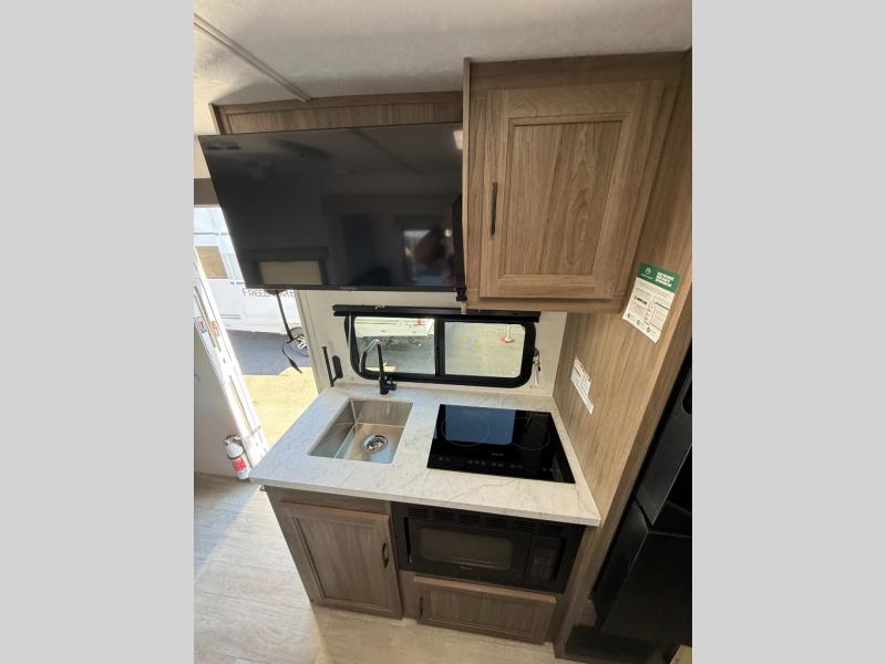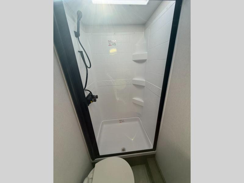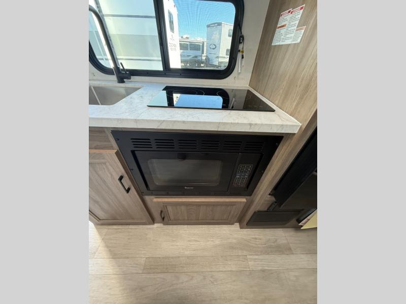 Camping with more friends and family is possible in this bunkhouse travel trailer! There is a double-size top bunk plus a double-size lower flip-up bunk for comfy sleeping space and additional storage space. You'll find your own bed up front with underbed storage and dual wardrobes to keep clothes wrinkle-free. Since there is a booth dinette slide out, you'll have additional interior space plus a place to dine, play games, and even let an extra guest sleep over. The full kitchen includes a dual burner cooktop and microwave oven to cook meals each day, along with a pantry and 12V refrigerator for food storage. And a full bath on board means you won't have to use the camp's facilities to freshen up each day; how convenient!