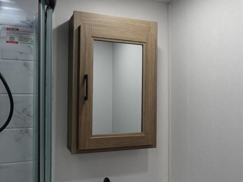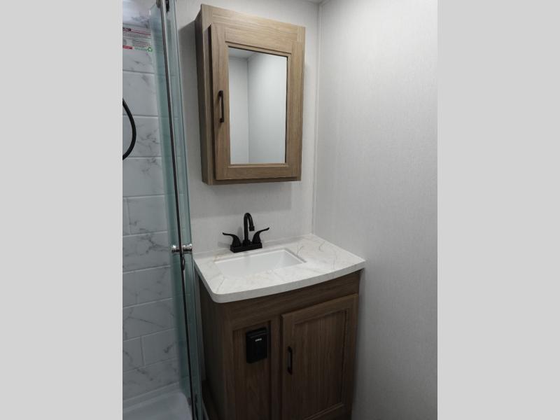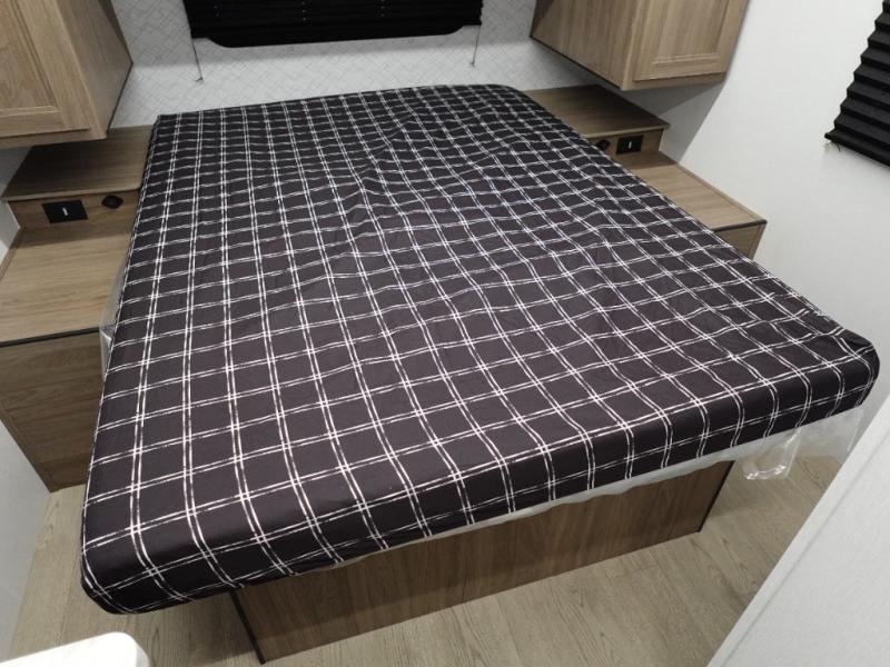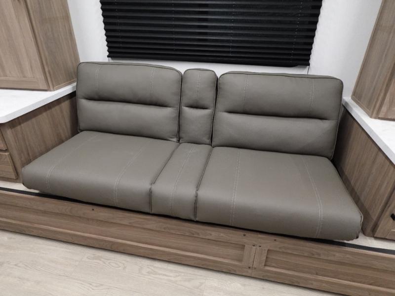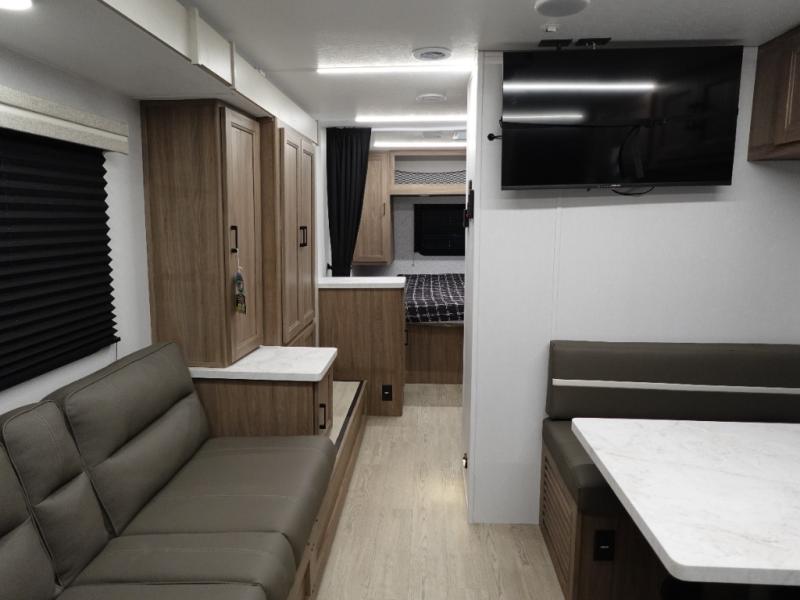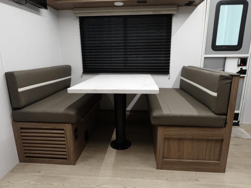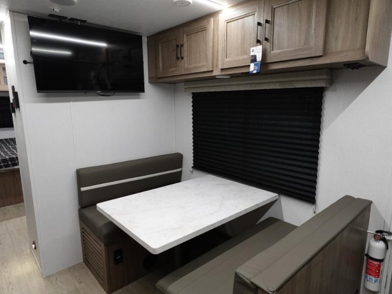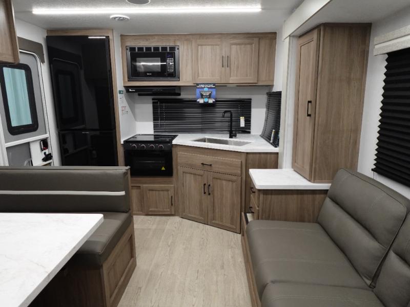 This travel trailer will feel a little more like home since there is a semi-private front bedroom with a queen bed, dual wardrobes, and a bedroom privacy curtain. On the opposite end, the rear kitchen will let you make meals each day on the dual-burner cooktop and microwave, plus there is a 12V refrigerator to keep food fresh. A large slide out includes a sofa, dual pantries with end tables, plus a wardrobe with a bench where you can pull your hiking boots off. And a booth dinette provides the perfect place to dine and play games together!