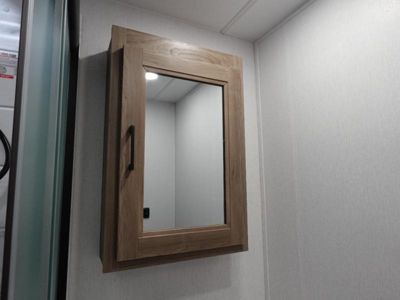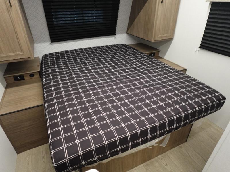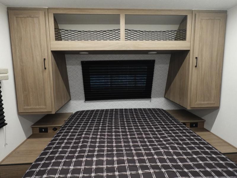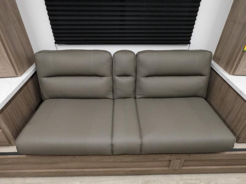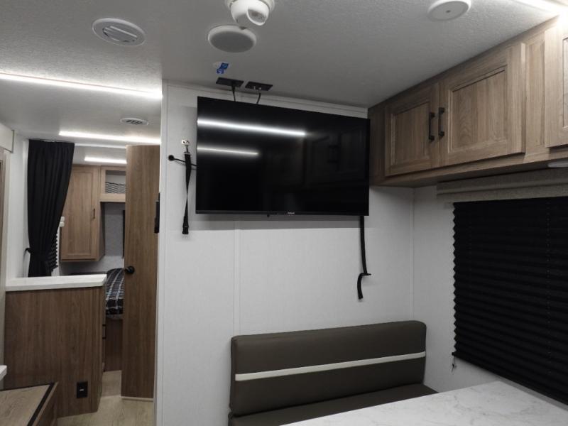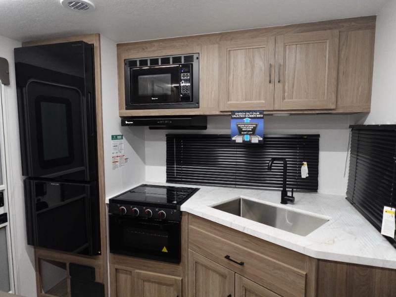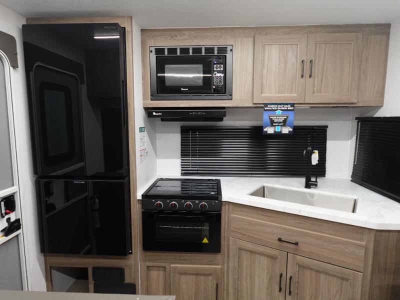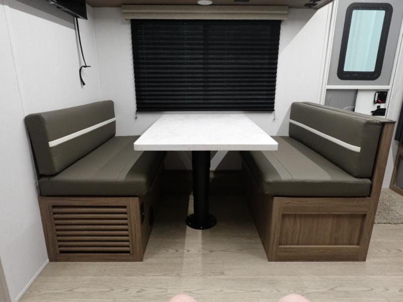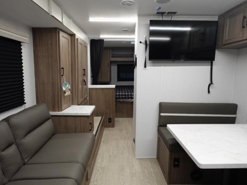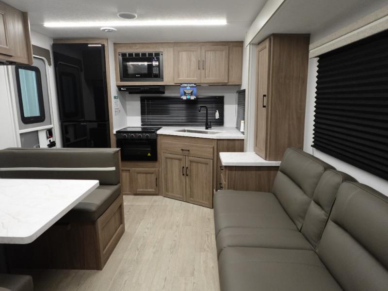 This travel trailer will feel a little more like home since there is a semi-private front bedroom with a queen bed, dual wardrobes, and a bedroom privacy curtain. On the opposite end, the rear kitchen will let you make meals each day on the dual-burner cooktop and microwave, plus there is a 12V refrigerator to keep food fresh. A large slide out includes a sofa, dual pantries with end tables, plus a wardrobe with a bench where you can pull your hiking boots off. And a booth dinette provides the perfect place to dine and play games together!