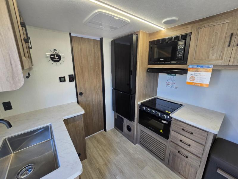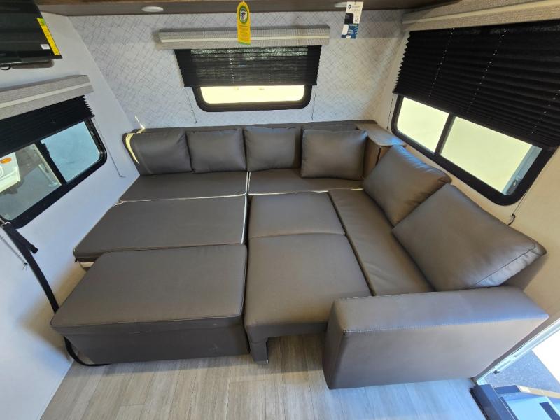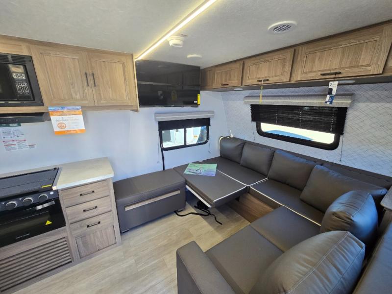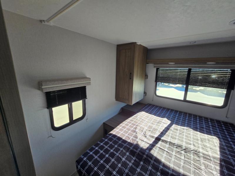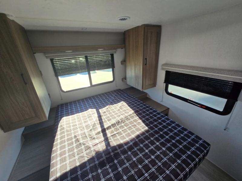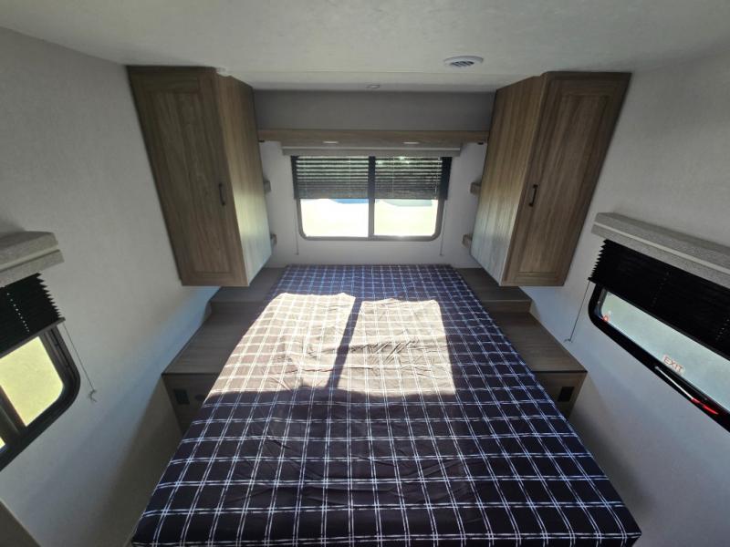 Step inside this travel trailer and be welcomed by a spacious front living area featuring a full-width sofa, complemented by a cozy dinette, ottoman, and an entertainment center—perfect for relaxing, dining, or planning your day. The central kitchen is fully equipped for the chef, boasting a 10 cubic ft refrigerator, Magic Chef gas cooktop, microwave, and ample overhead storage. Moving forward, a convenient pass-through full bathroom offers practicality on the go. At the rear, the bedroom features a comfortable 60" x 80" queen bed, flanked by wardrobes on each side and additional overhead storage to keep all your essentials neatly organized.