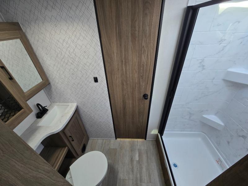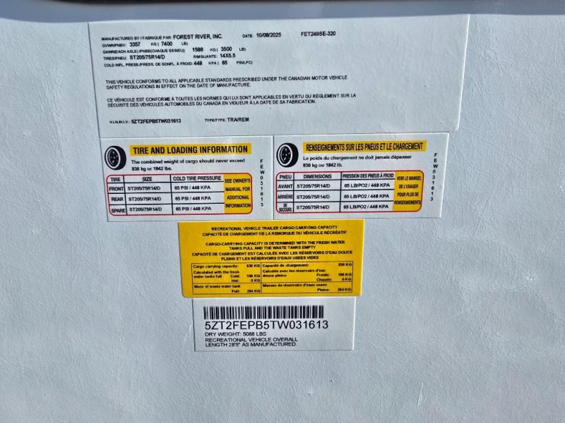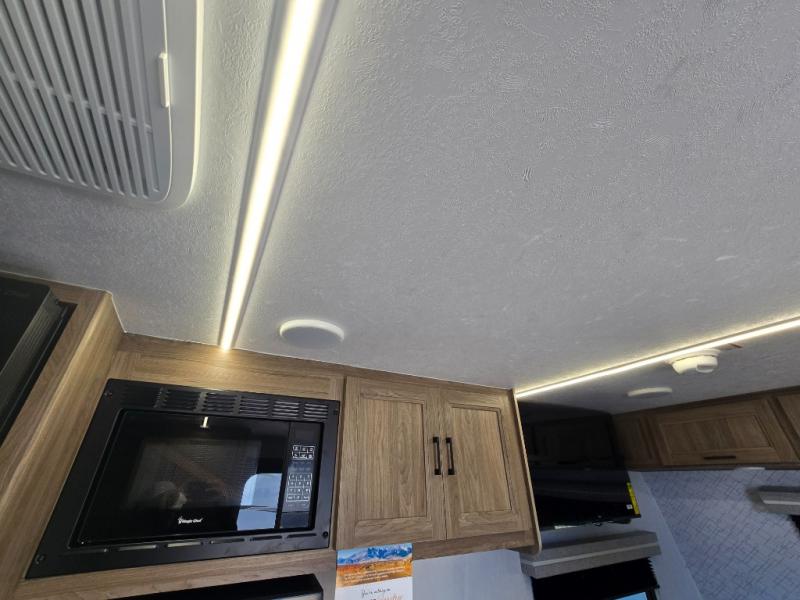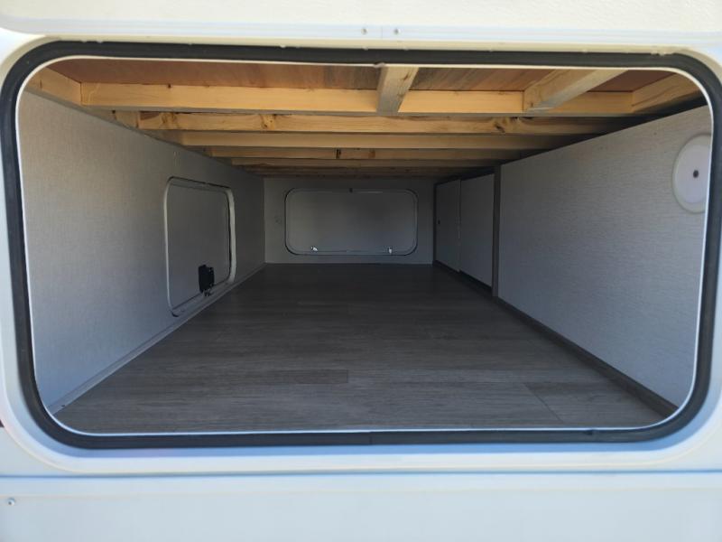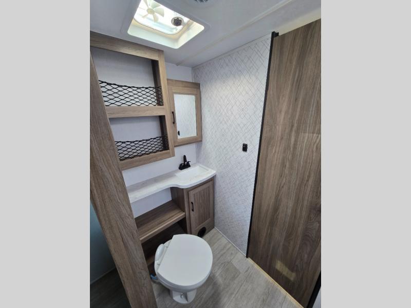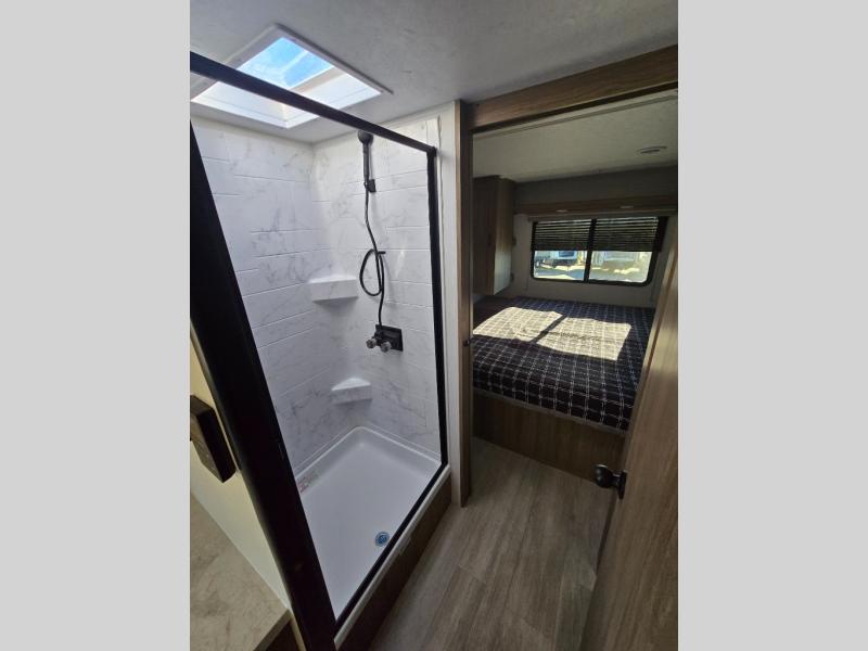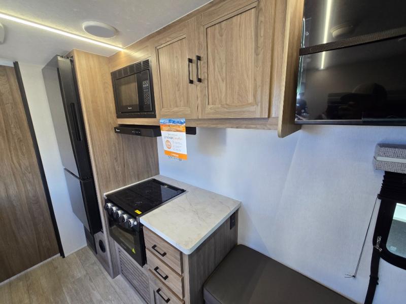 Step inside this travel trailer and be welcomed by a spacious front living area featuring a full-width sofa, complemented by a cozy dinette, ottoman, and an entertainment center—perfect for relaxing, dining, or planning your day. The central kitchen is fully equipped for the chef, boasting a 10 cubic ft refrigerator, Magic Chef gas cooktop, microwave, and ample overhead storage. Moving forward, a convenient pass-through full bathroom offers practicality on the go. At the rear, the bedroom features a comfortable 60" x 80" queen bed, flanked by wardrobes on each side and additional overhead storage to keep all your essentials neatly organized.