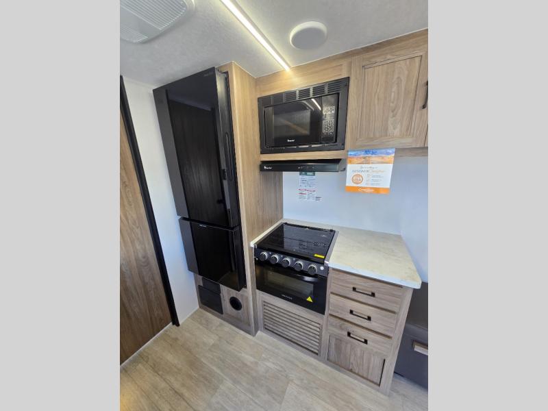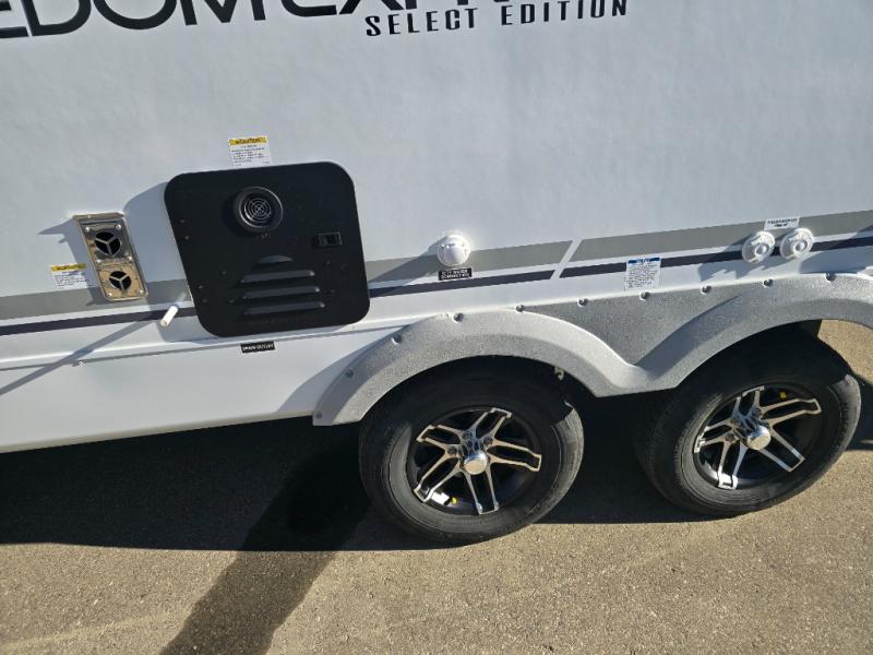 With any Freedom Express Select travel trailer by Coachmen you will find an alumicage construction and two-step vacuum bonded and pinch rolled sidewalls with Azdel interior and exterior for a trailer made to last. These Select value models come standard with a Bluetooth interior speaker, night shades, and wear-resistant vinyl flooring throughout. You will appreciate the power tongue jack, as well as the Dicor Tufflex PVC roof and heated and enclosed underbelly to help with protection and climate control. A GE 15K BTU roof A/C will keep you comfortable, and the suburban tankless water heater will provide endless hot showers!