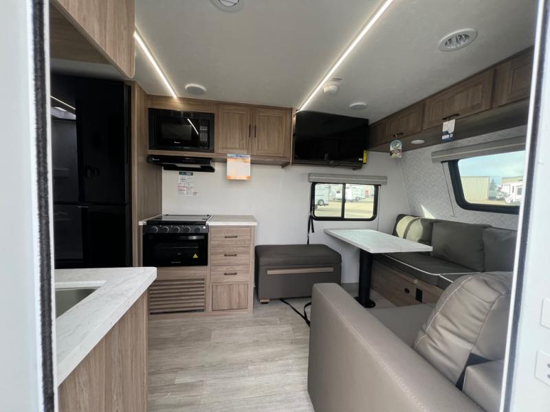 Step inside this travel trailer and be welcomed by a spacious front living area featuring a full-width sofa, complemented by a cozy dinette, ottoman, and an entertainment center—perfect for relaxing, dining, or planning your day. The central kitchen is fully equipped for the chef, boasting a 10 cubic ft refrigerator, Magic Chef gas cooktop, microwave, and ample overhead storage. Moving forward, a convenient pass-through full bathroom offers practicality on the go. At the rear, the bedroom features a comfortable 60" x 80" queen bed, flanked by wardrobes on each side and additional overhead storage to keep all your essentials neatly organized.