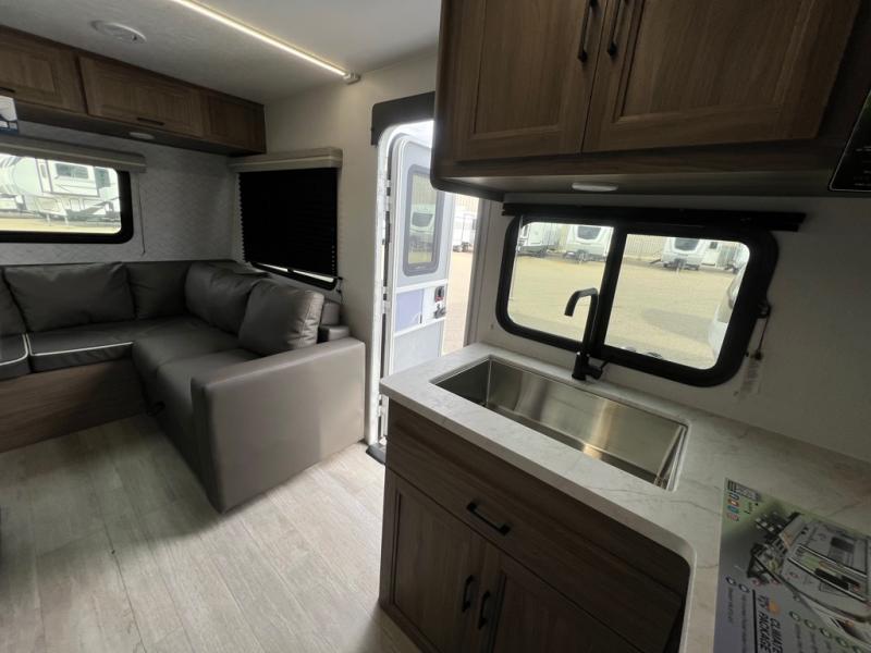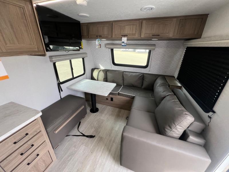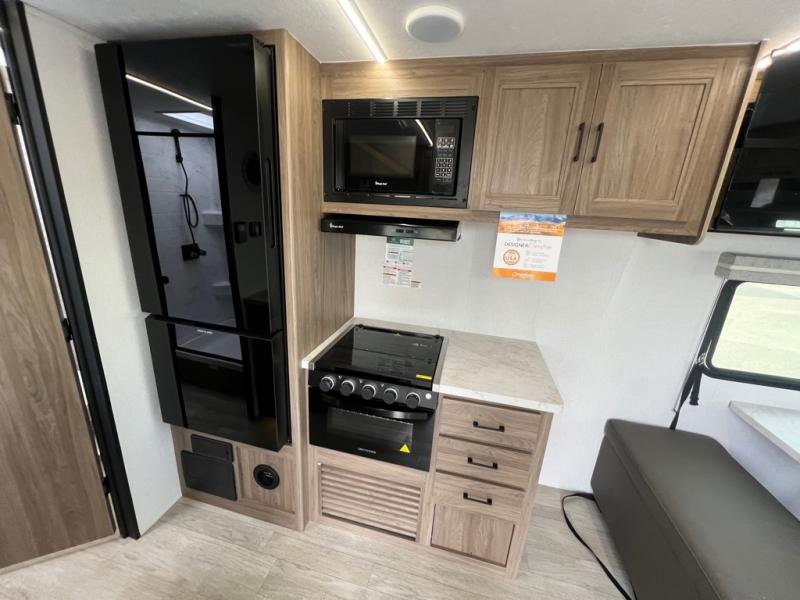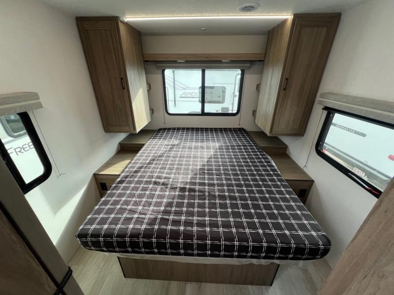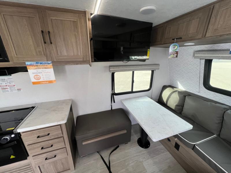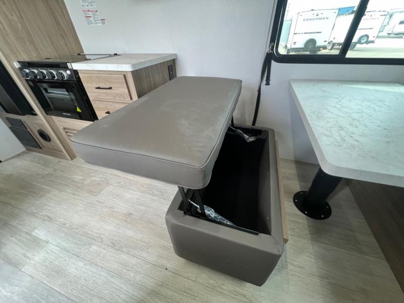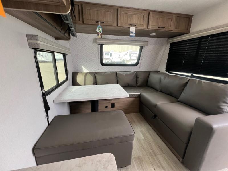 With any Freedom Express Select travel trailer by Coachmen you will find an alumicage construction and two-step vacuum bonded and pinch rolled sidewalls with Azdel interior and exterior for a trailer made to last. These Select value models come standard with a Bluetooth interior speaker, night shades, and wear-resistant vinyl flooring throughout. You will appreciate the power tongue jack, as well as the Dicor Tufflex PVC roof and heated and enclosed underbelly to help with protection and climate control. A GE 15K BTU roof A/C will keep you comfortable, and the suburban tankless water heater will provide endless hot showers!
