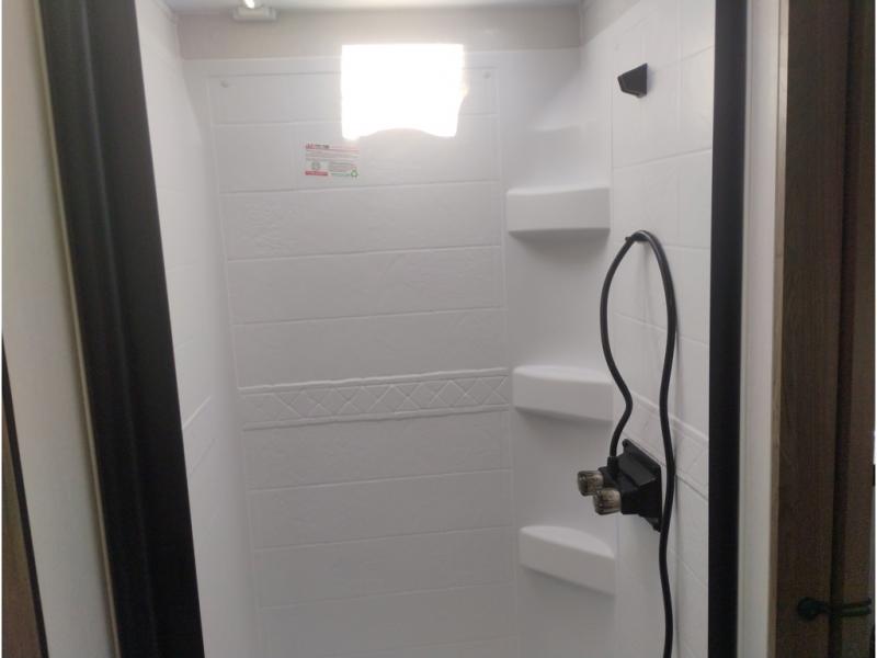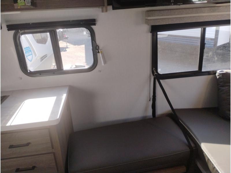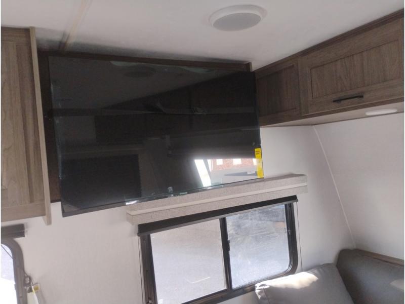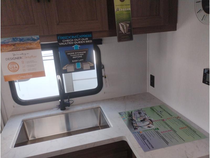 With any Freedom Express Select travel trailer by Coachmen you will find an alumicage construction and two-step vacuum bonded and pinch rolled sidewalls with Azdel interior and exterior for a trailer made to last. These Select value models come standard with a Bluetooth interior speaker, night shades, and wear-resistant vinyl flooring throughout. You will appreciate the power tongue jack, as well as the Dicor Tufflex PVC roof and heated and enclosed underbelly to help with protection and climate control. A GE 15K BTU roof A/C will keep you comfortable, and the suburban tankless water heater will provide endless hot showers!
