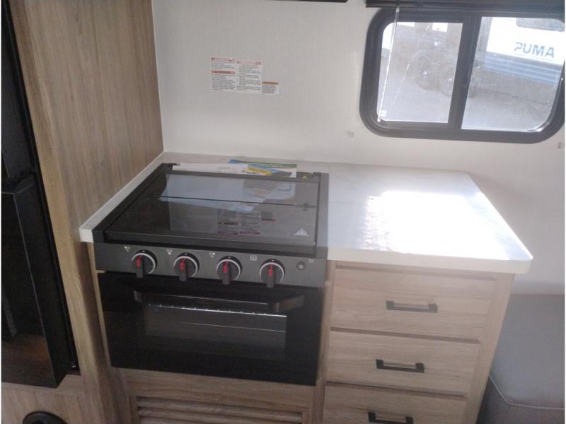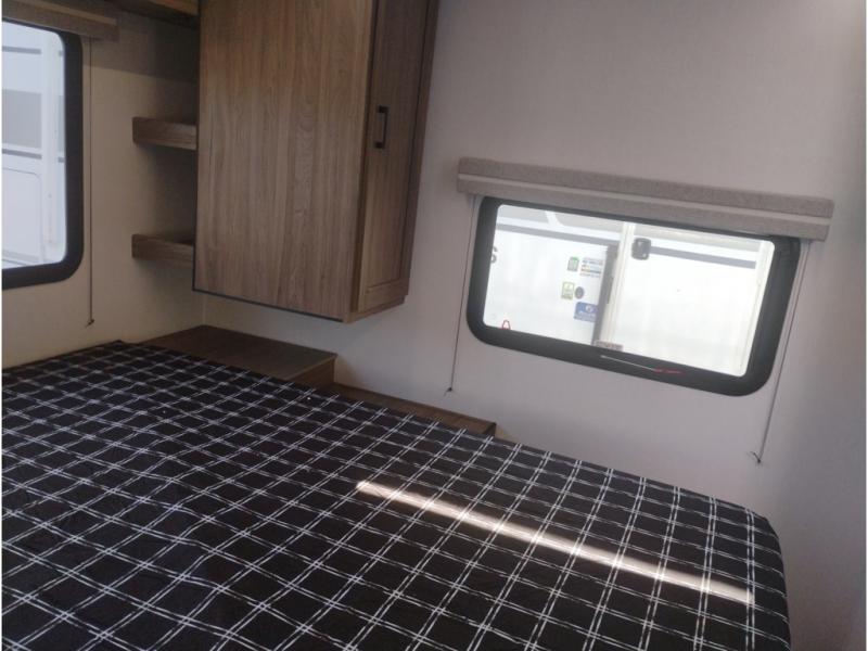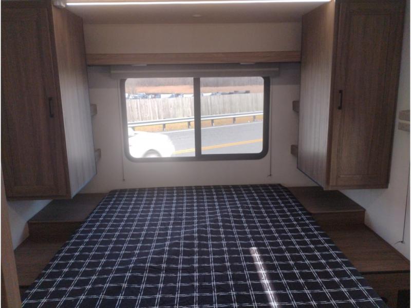 Step inside this travel trailer and be welcomed by a spacious front living area featuring a full-width sofa, complemented by a cozy dinette, ottoman, and an entertainment center—perfect for relaxing, dining, or planning your day. The central kitchen is fully equipped for the chef, boasting a 10 cubic ft refrigerator, Magic Chef gas cooktop, microwave, and ample overhead storage. Moving forward, a convenient pass-through full bathroom offers practicality on the go. At the rear, the bedroom features a comfortable 60" x 80" queen bed, flanked by wardrobes on each side and additional overhead storage to keep all your essentials neatly organized.