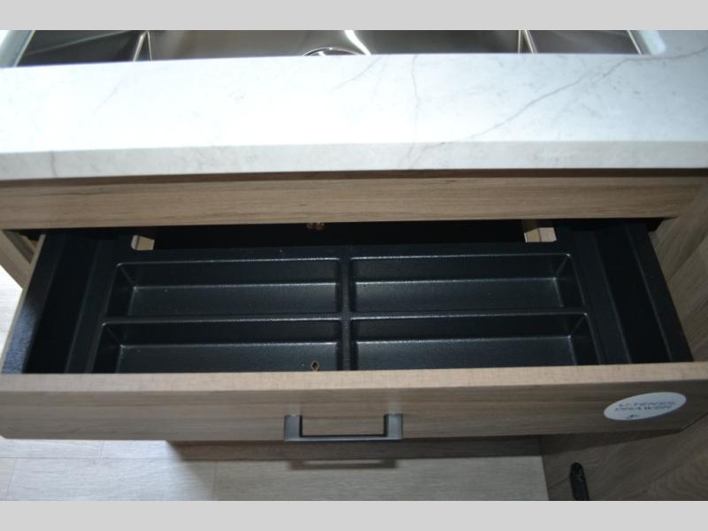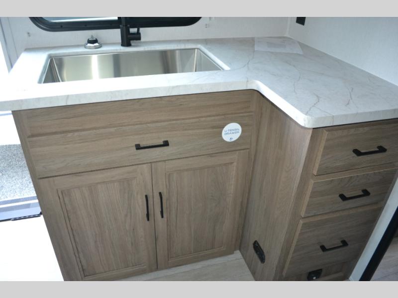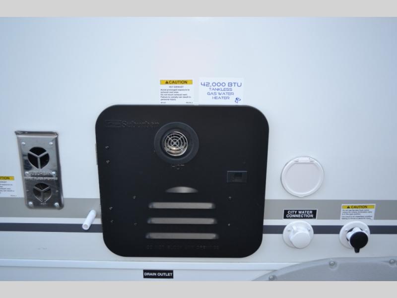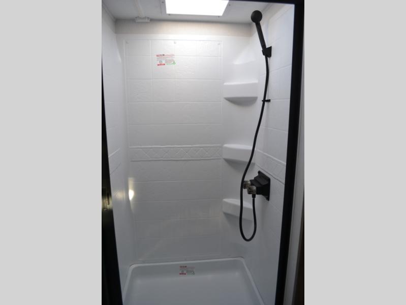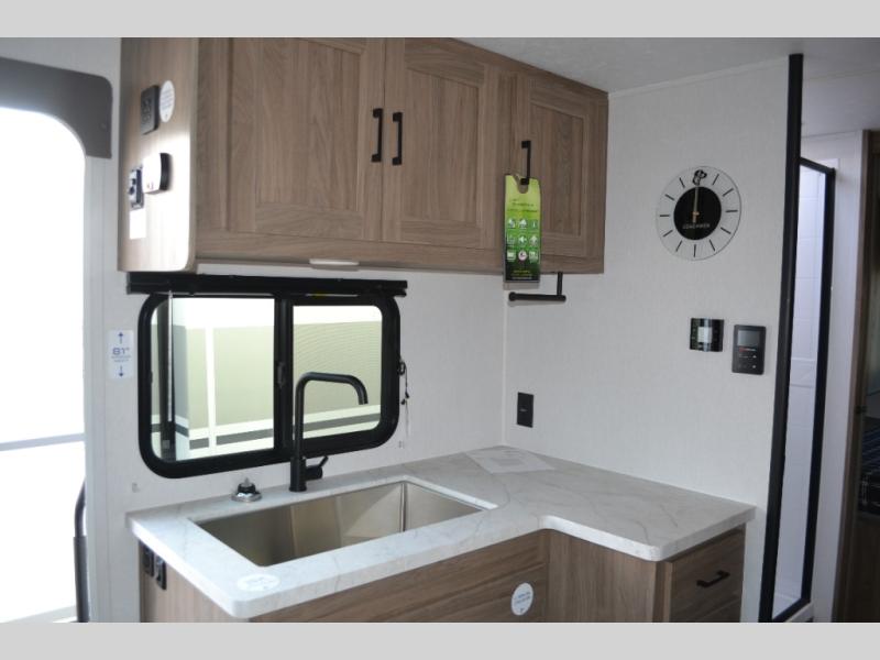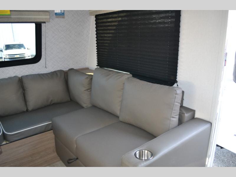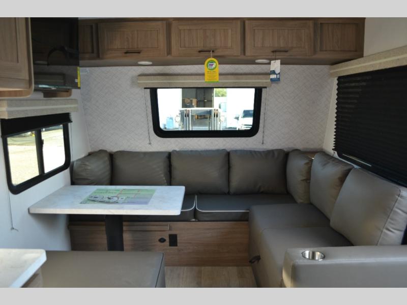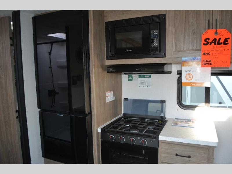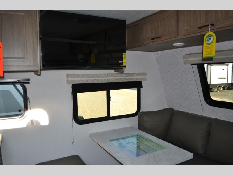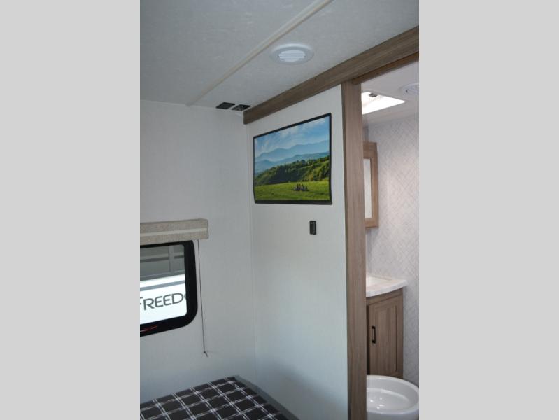 With any Freedom Express Select travel trailer by Coachmen you will find an alumicage construction and two-step vacuum bonded and pinch rolled sidewalls with Azdel interior and exterior for a trailer made to last. These Select value models come standard with a Bluetooth interior speaker, night shades, and wear-resistant vinyl flooring throughout. You will appreciate the power tongue jack, as well as the Dicor Tufflex PVC roof and heated and enclosed underbelly to help with protection and climate control. A GE 15K BTU roof A/C will keep you comfortable, and the suburban tankless water heater will provide endless hot showers!