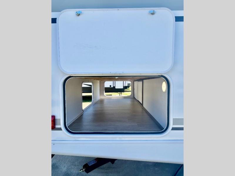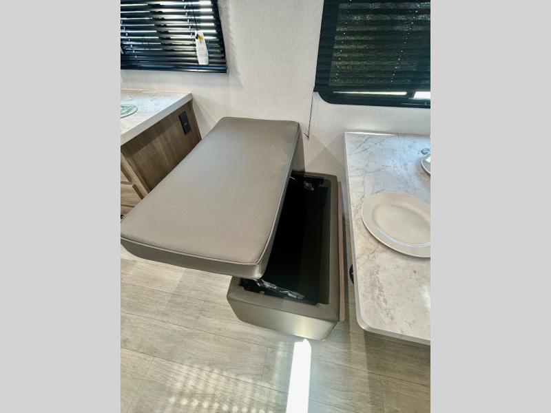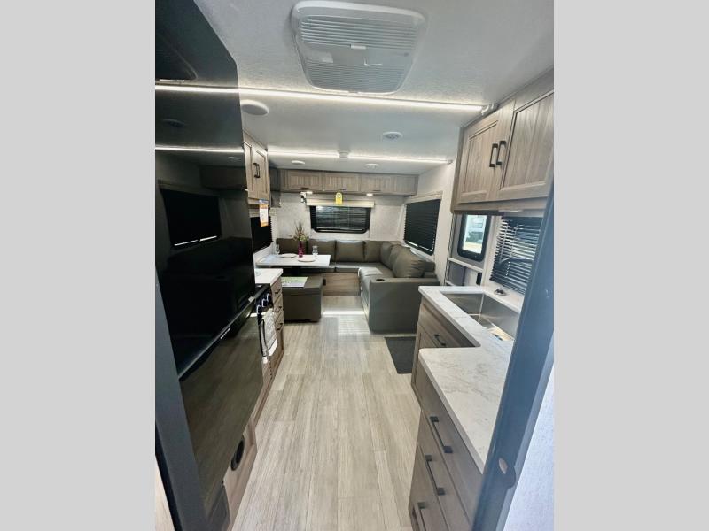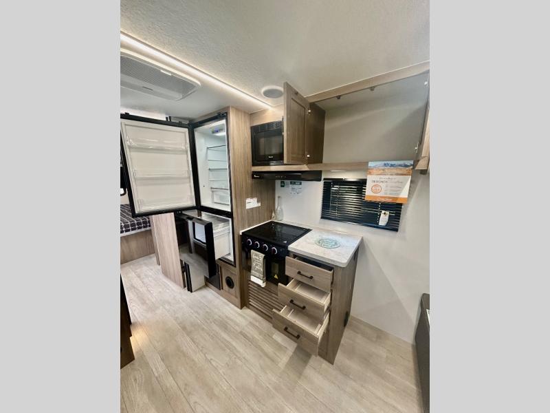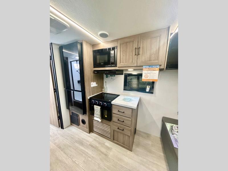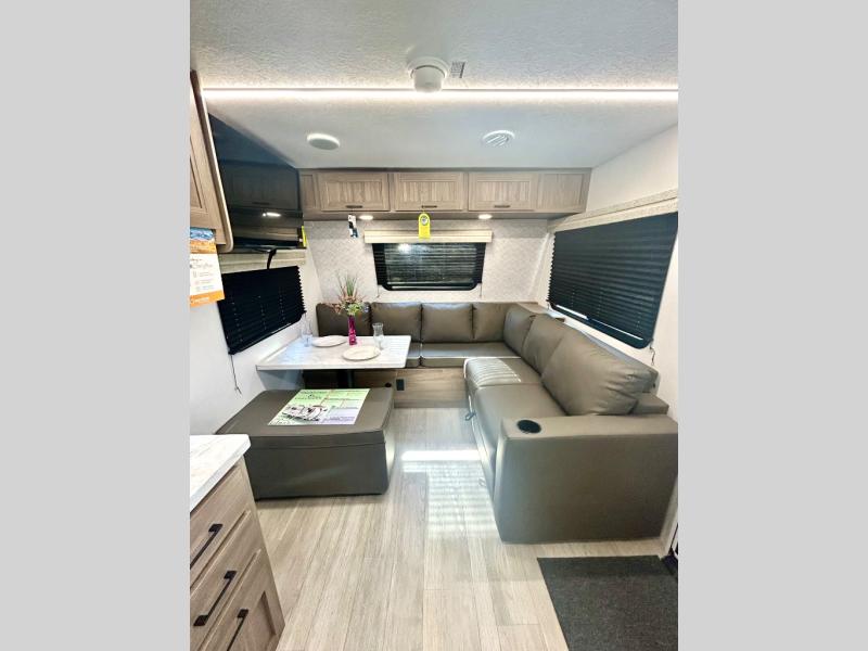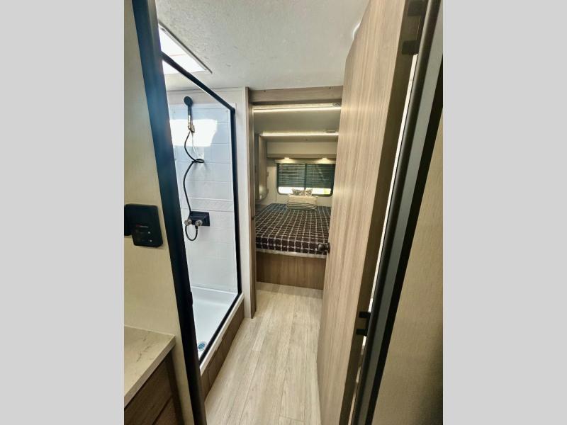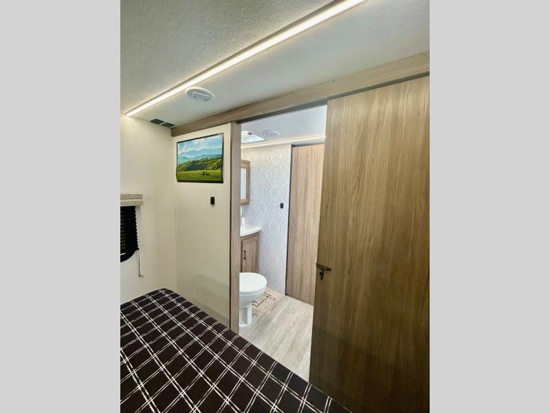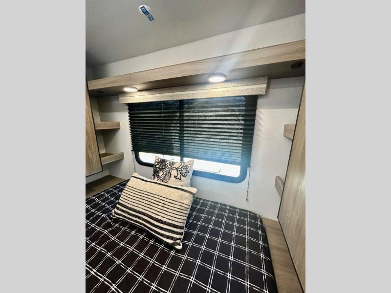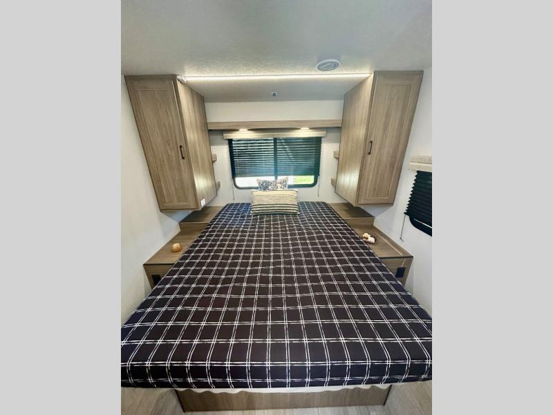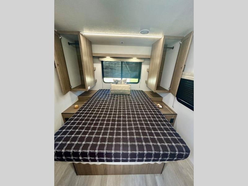 Step inside this travel trailer and be welcomed by a spacious front living area featuring a full-width sofa, complemented by a cozy dinette, ottoman, and an entertainment center—perfect for relaxing, dining, or planning your day. The central kitchen is fully equipped for the chef, boasting a 10 cubic ft refrigerator, Magic Chef gas cooktop, microwave, and ample overhead storage. Moving forward, a convenient pass-through full bathroom offers practicality on the go. At the rear, the bedroom features a comfortable 60" x 80" queen bed, flanked by wardrobes on each side and additional overhead storage to keep all your essentials neatly organized.
